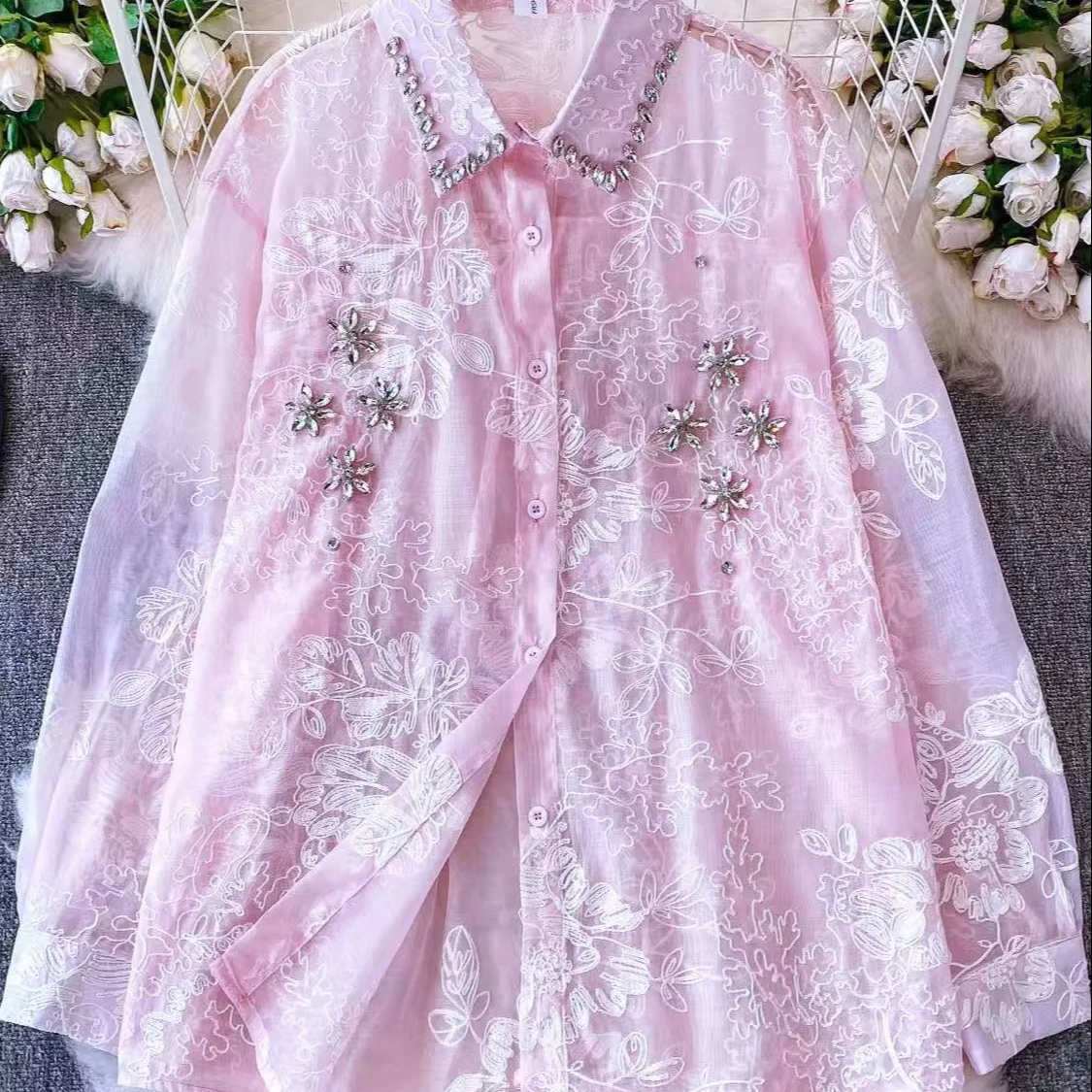 Women 2025 Autumn Lantern Sleeve Outwear Tops Camisas De Mujer Luxury Bling Sequins Embroidery Pink Cotton Loose Blouses Shirts