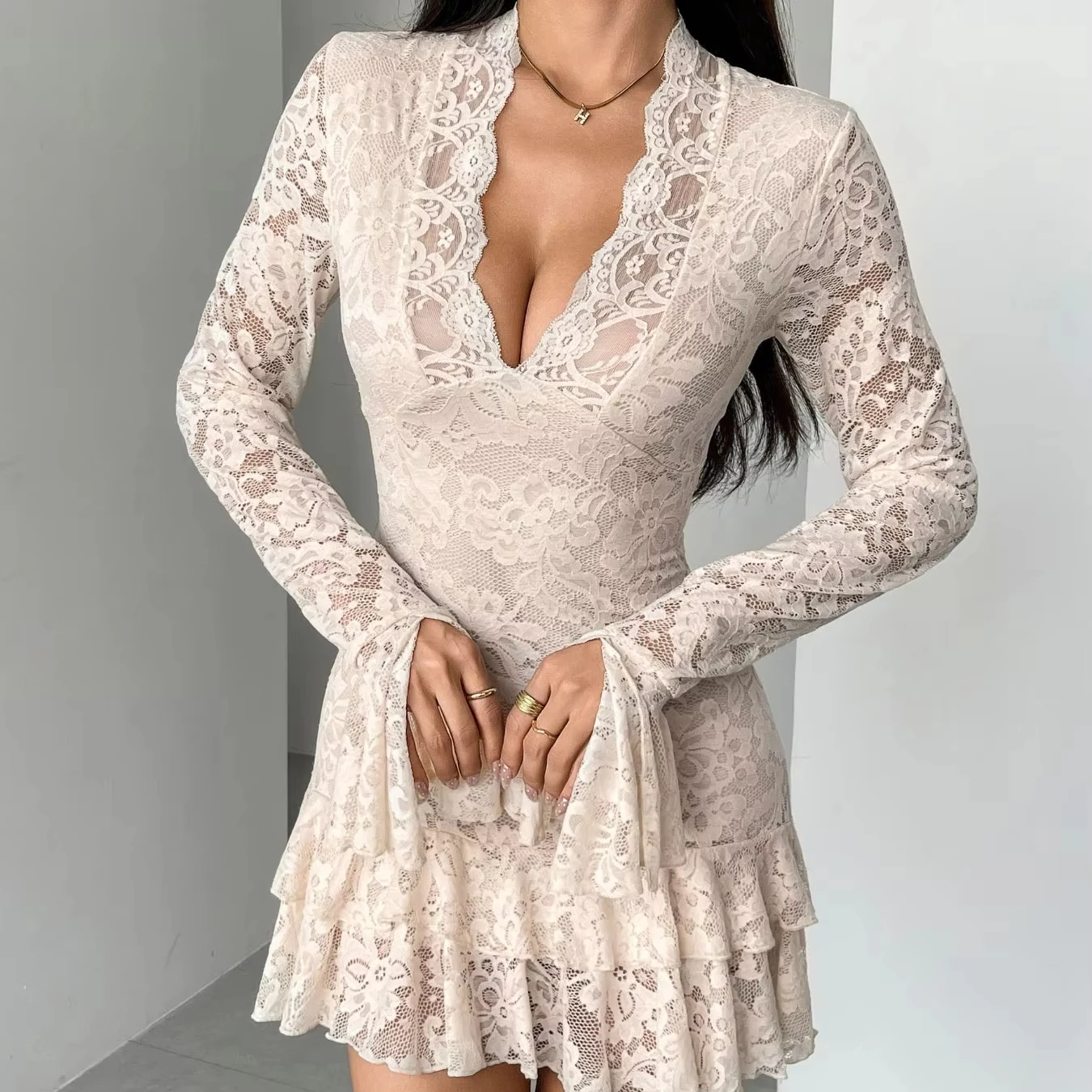 2025 Autumn and Winter New Sexy Lace V-Neck Double Layer Ruffled Slim-Fitting Bodycon Dress