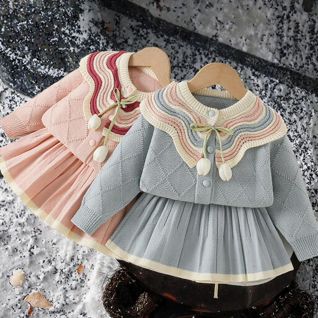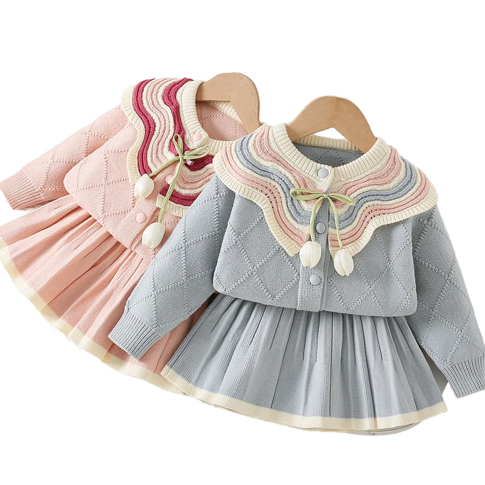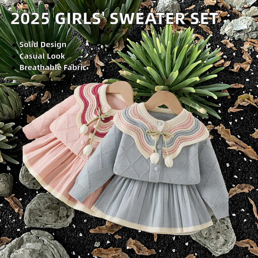 2025 Autumn and Winter Two-Piece Girls’ Casual Sweater Set Solid Pattern Knitted Cardigan + Short Skirt Wholesale Good Price