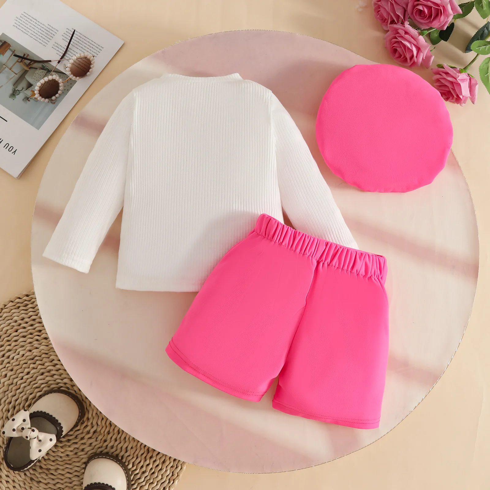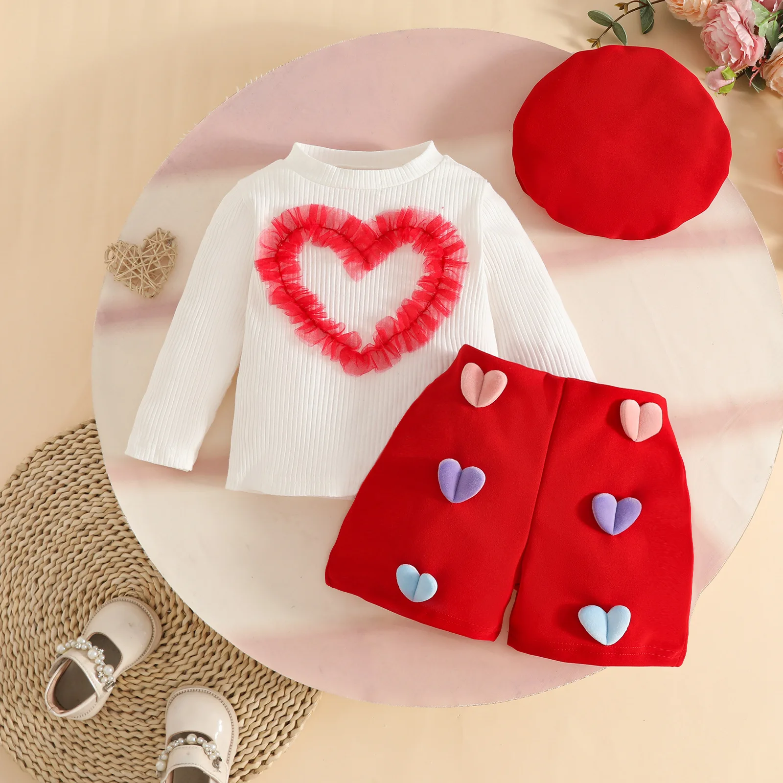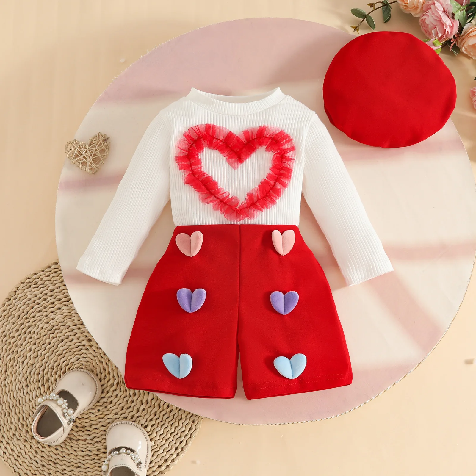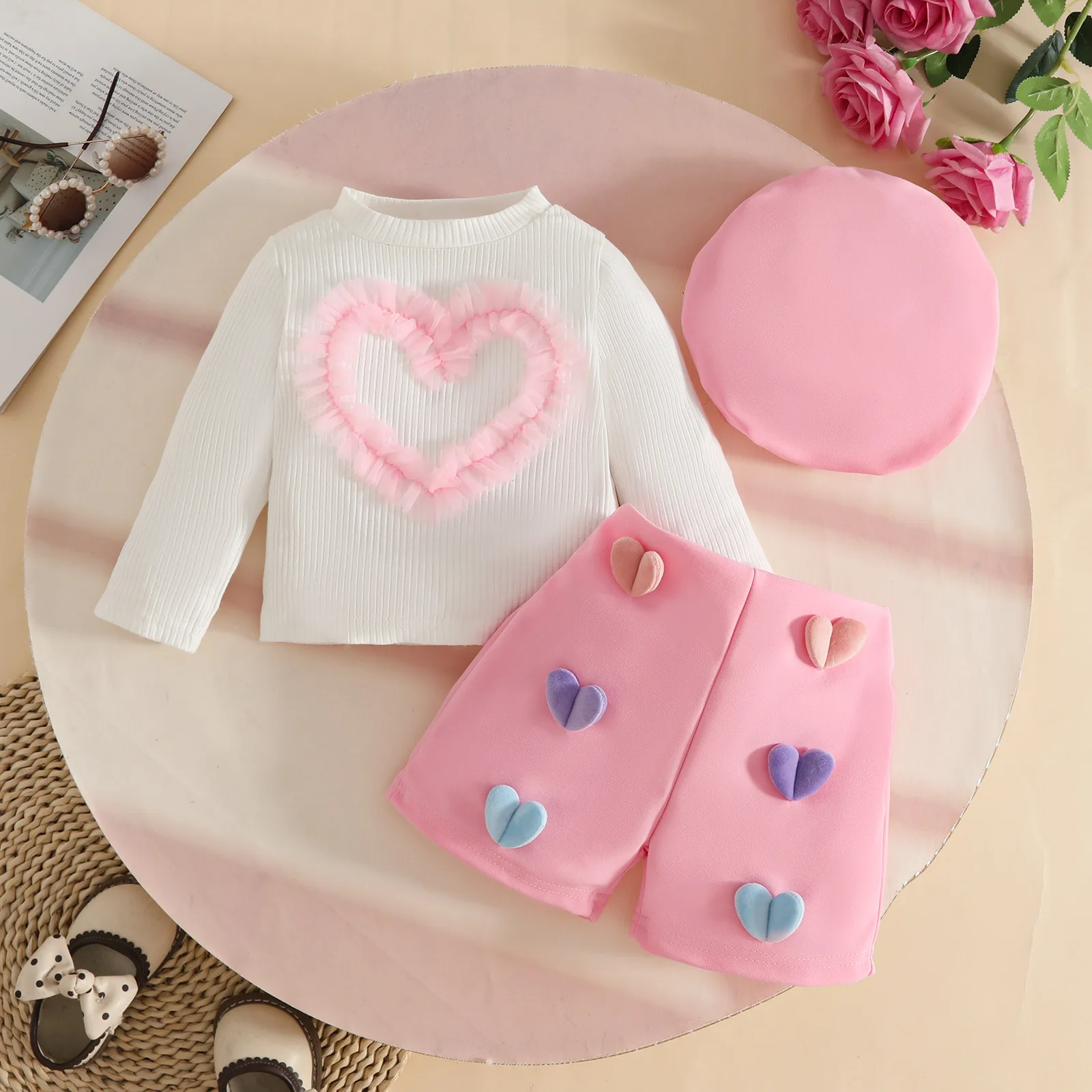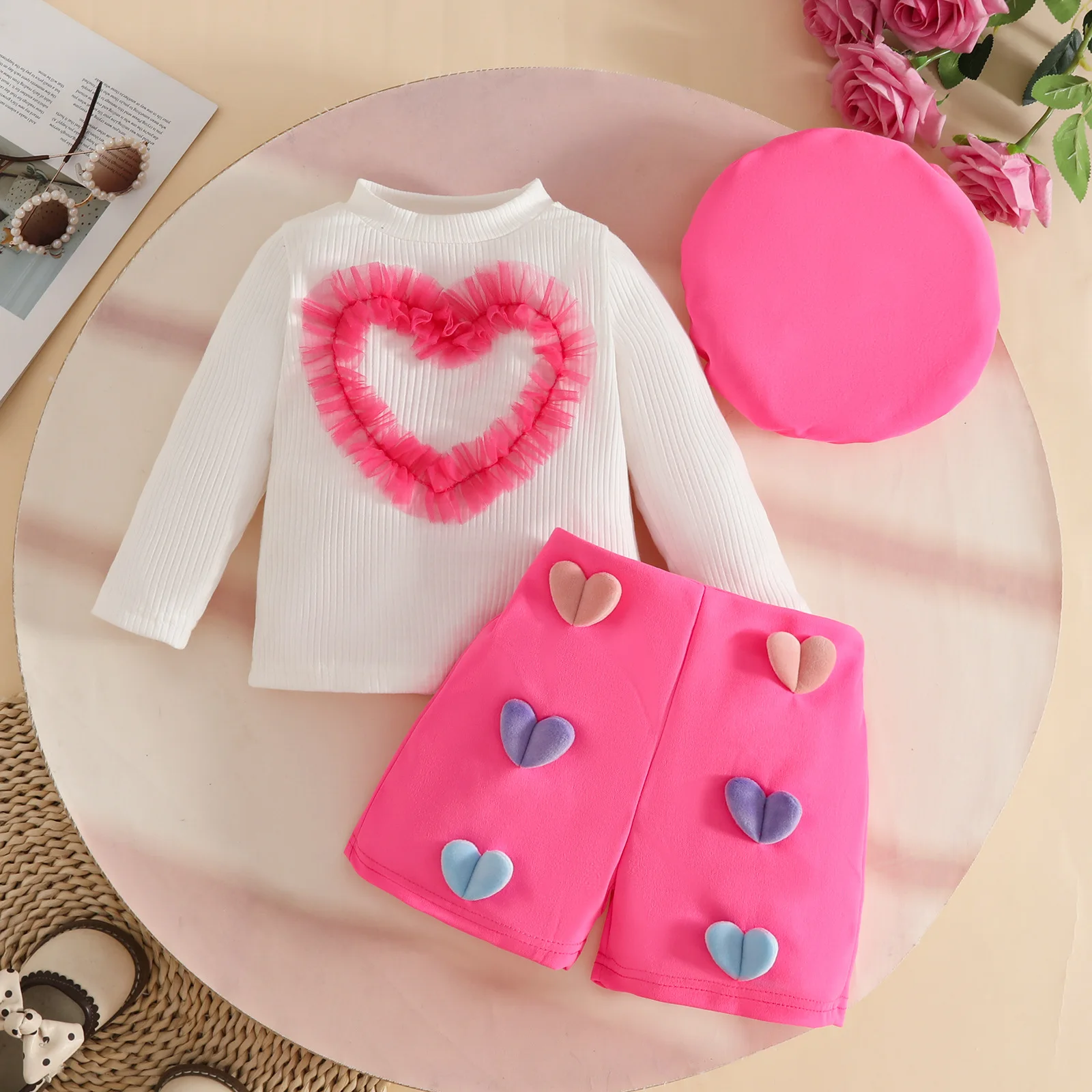 2025 Autumn Baby Girls Clothing Set New European Design Wholesale Long-sleeved Top 3D Heart Shorts Beret Set3pcs Toddler Clothes