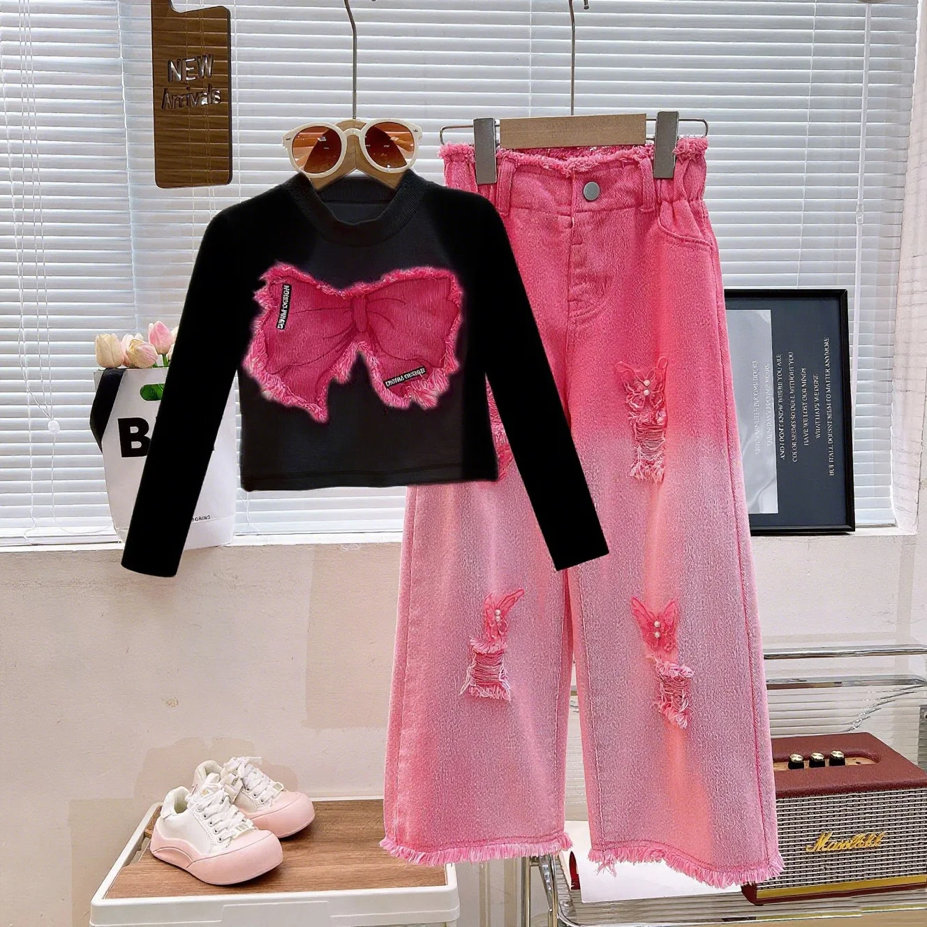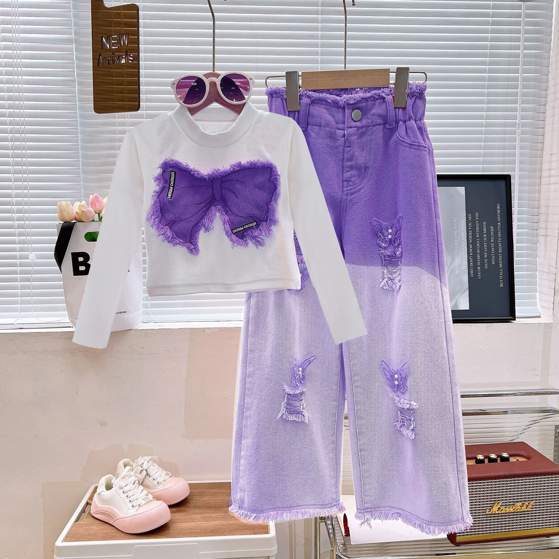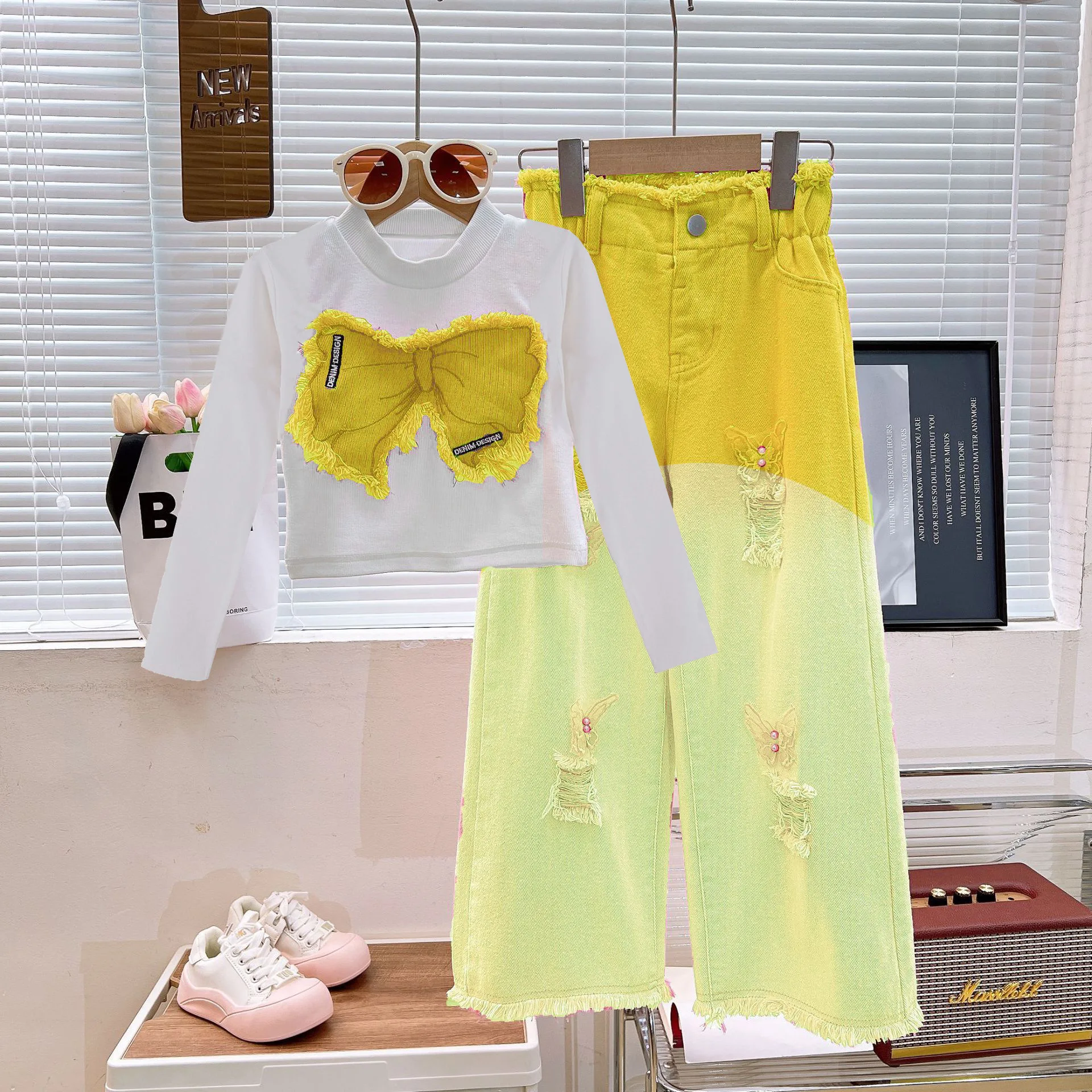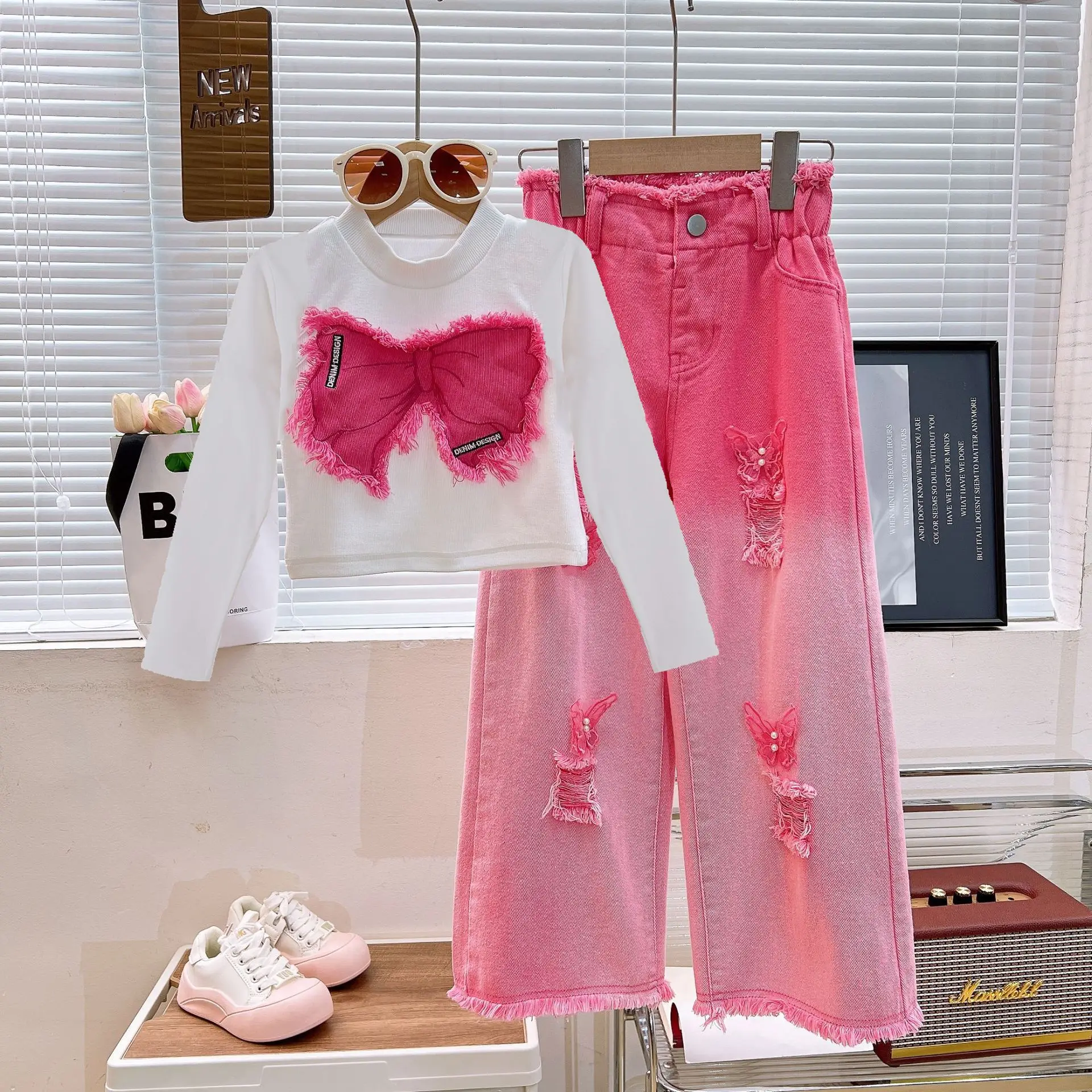 2025 Autumn Collection Designer Casual Kids Clothing Long Sleeve Butterfly Shirt Ripped Jeans Set for Teenage Girls Hot Selling