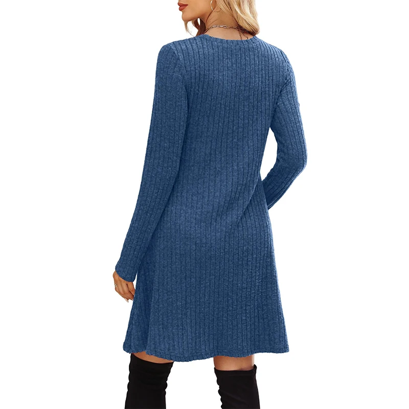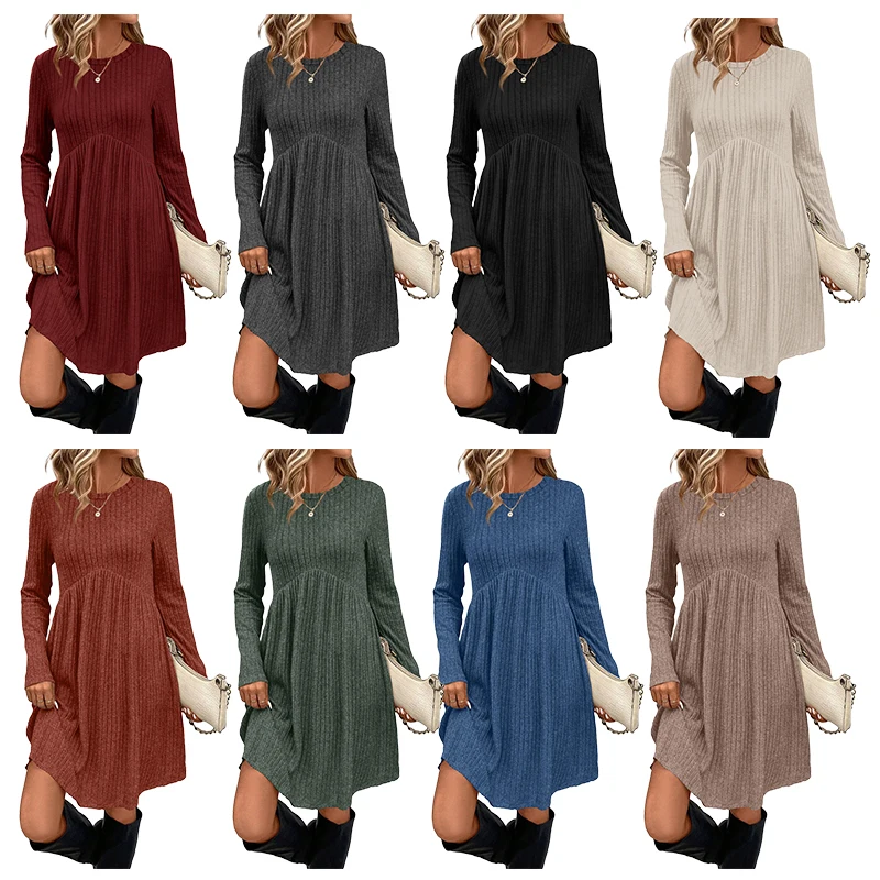 2025 Autumn Feminine Style Women’s Long Skirt Dress Knitted Round Neck High Waist with Bundle Waist Pocket Anti-Static