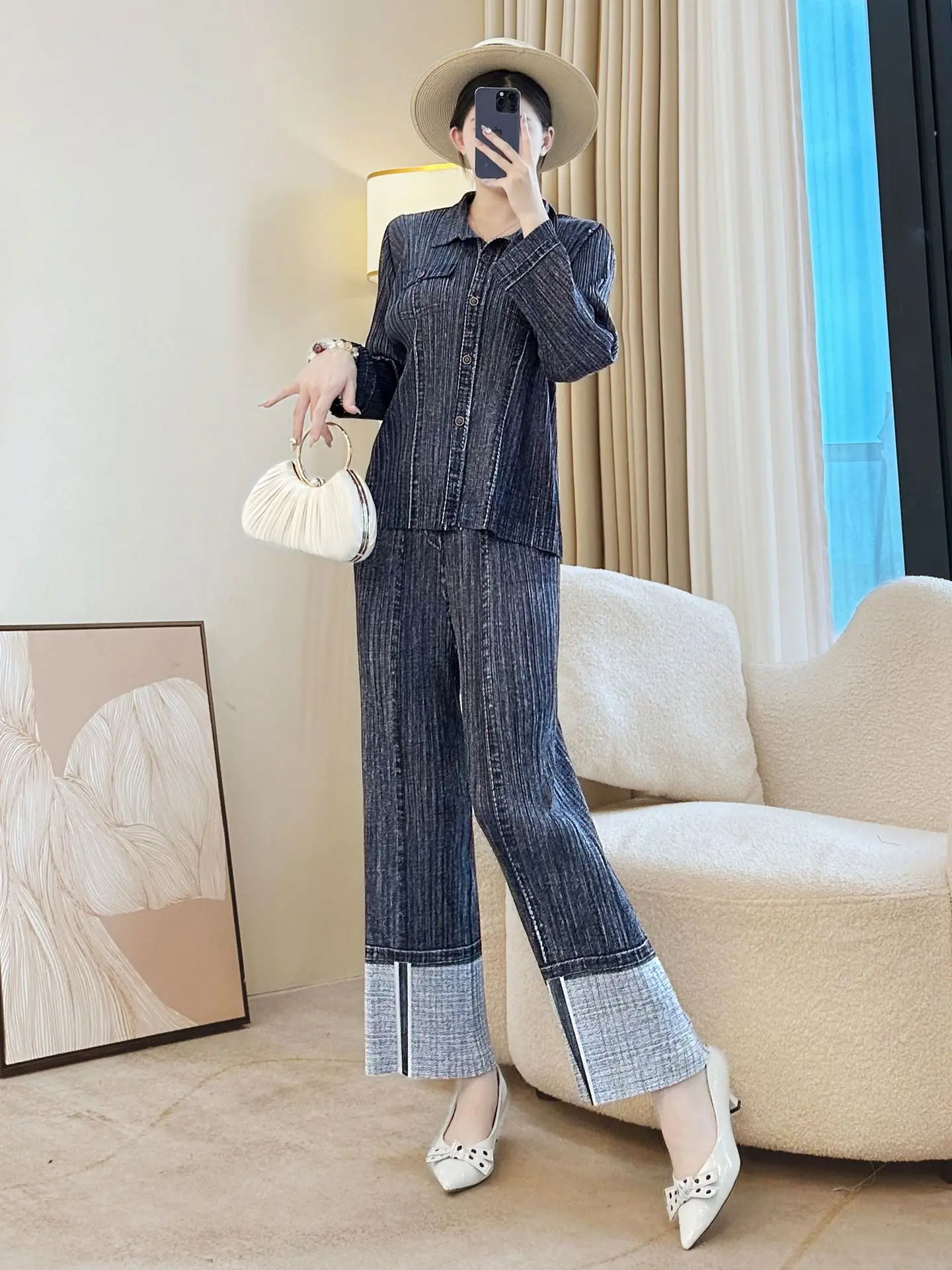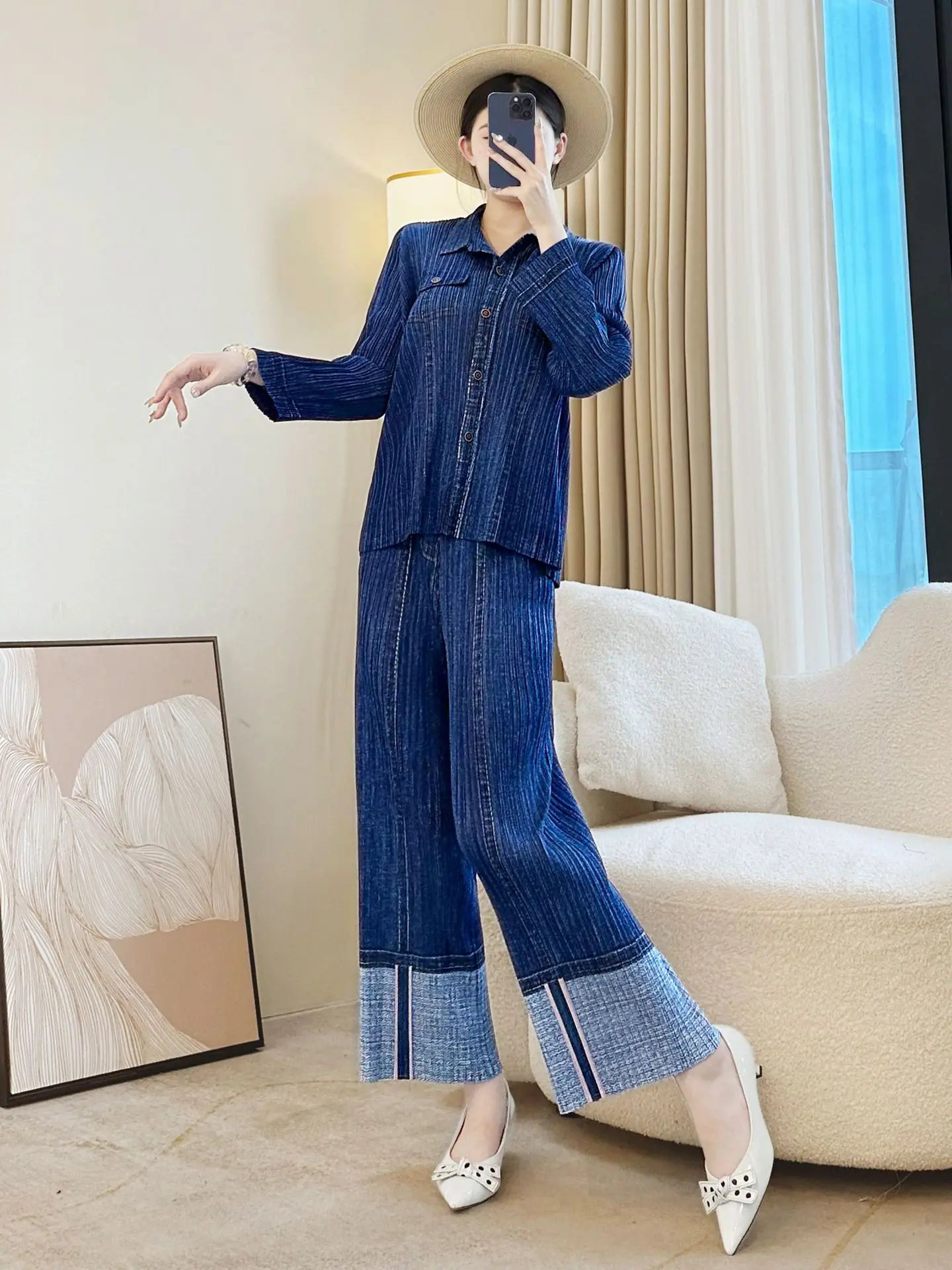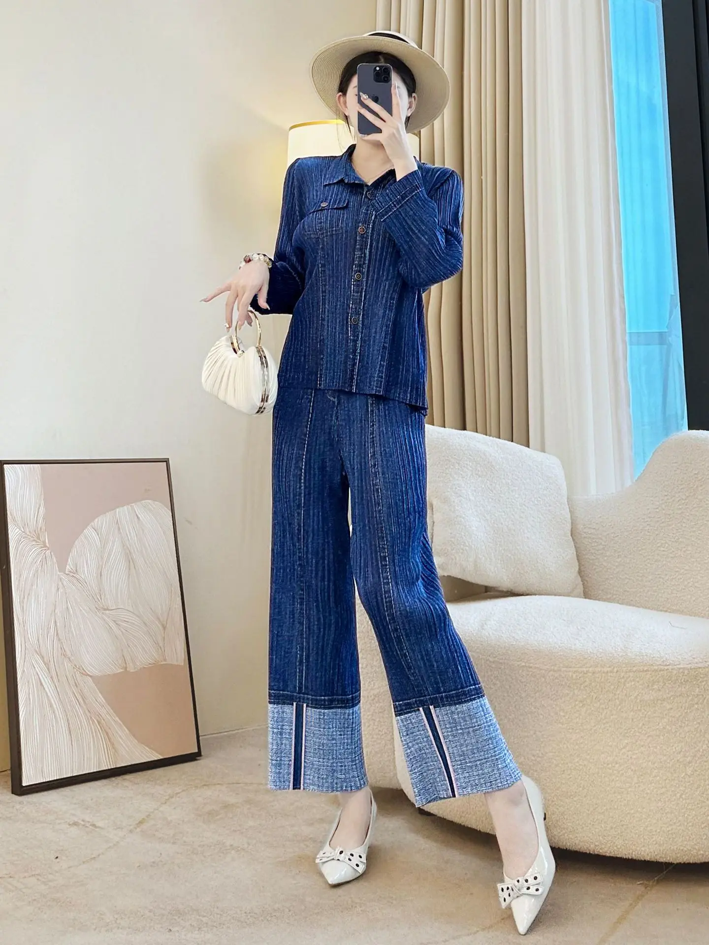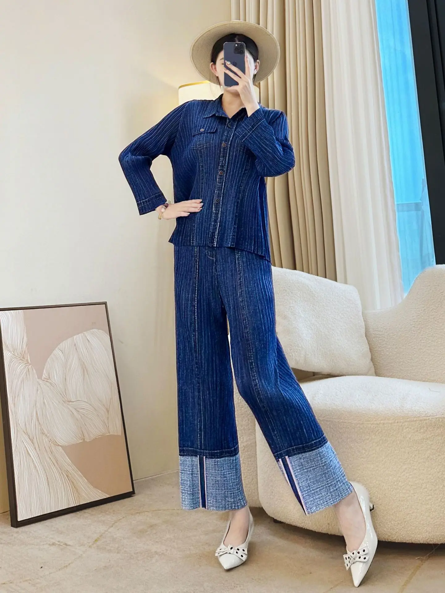 2025 Autumn New Generation High-End Women’s Denim Suit Miyake Pleated Two-Piece Straight Pants Loose Fit Casual Weave