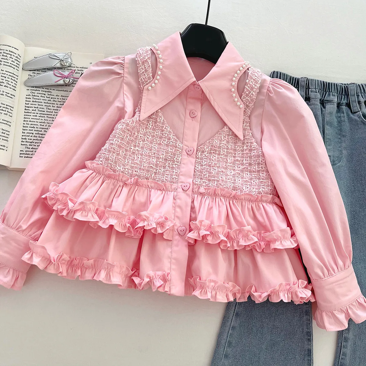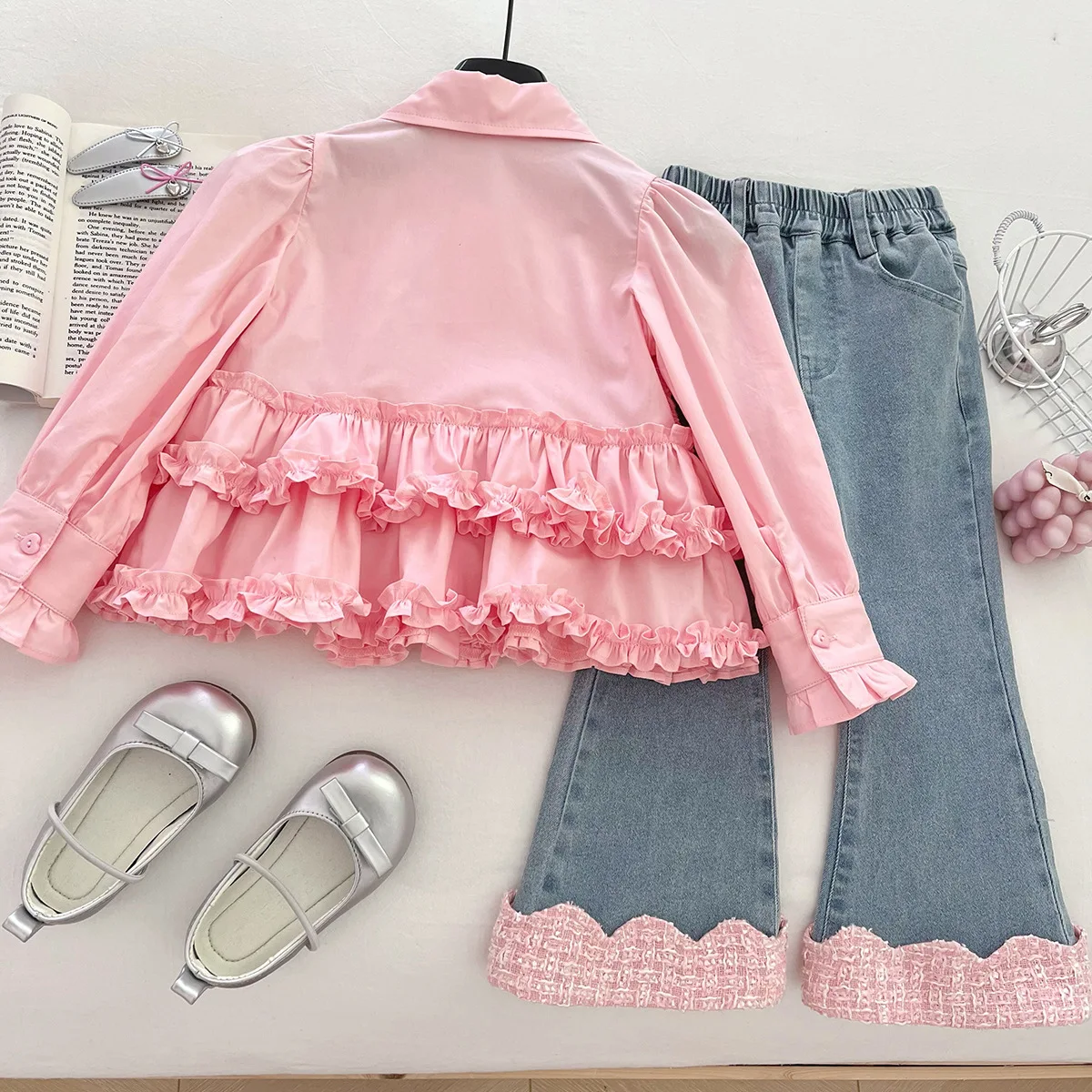 2025 Autumn New Girls Casual Print Long Sleeve Two-Piece Cotton Denim Shirt + Pants Baby Temperament Suit 30579