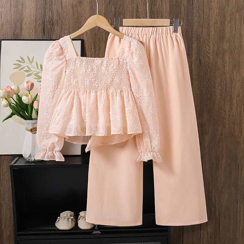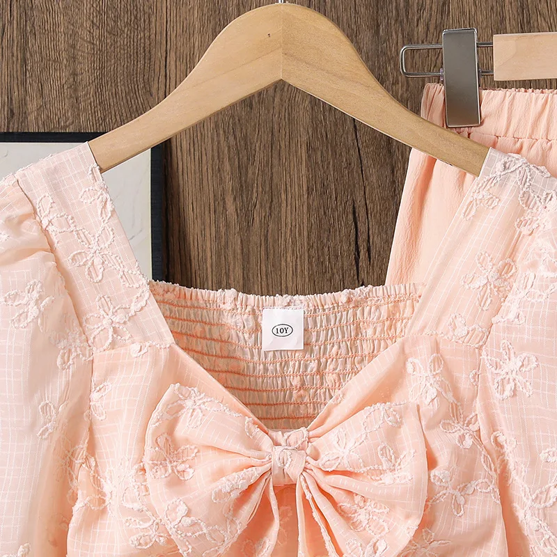 2025 Autumn New Girls’ Outfit High-End Jacquard Long-Sleeve Bow Top and Pants Stylish Casual Children’s Clothing Set