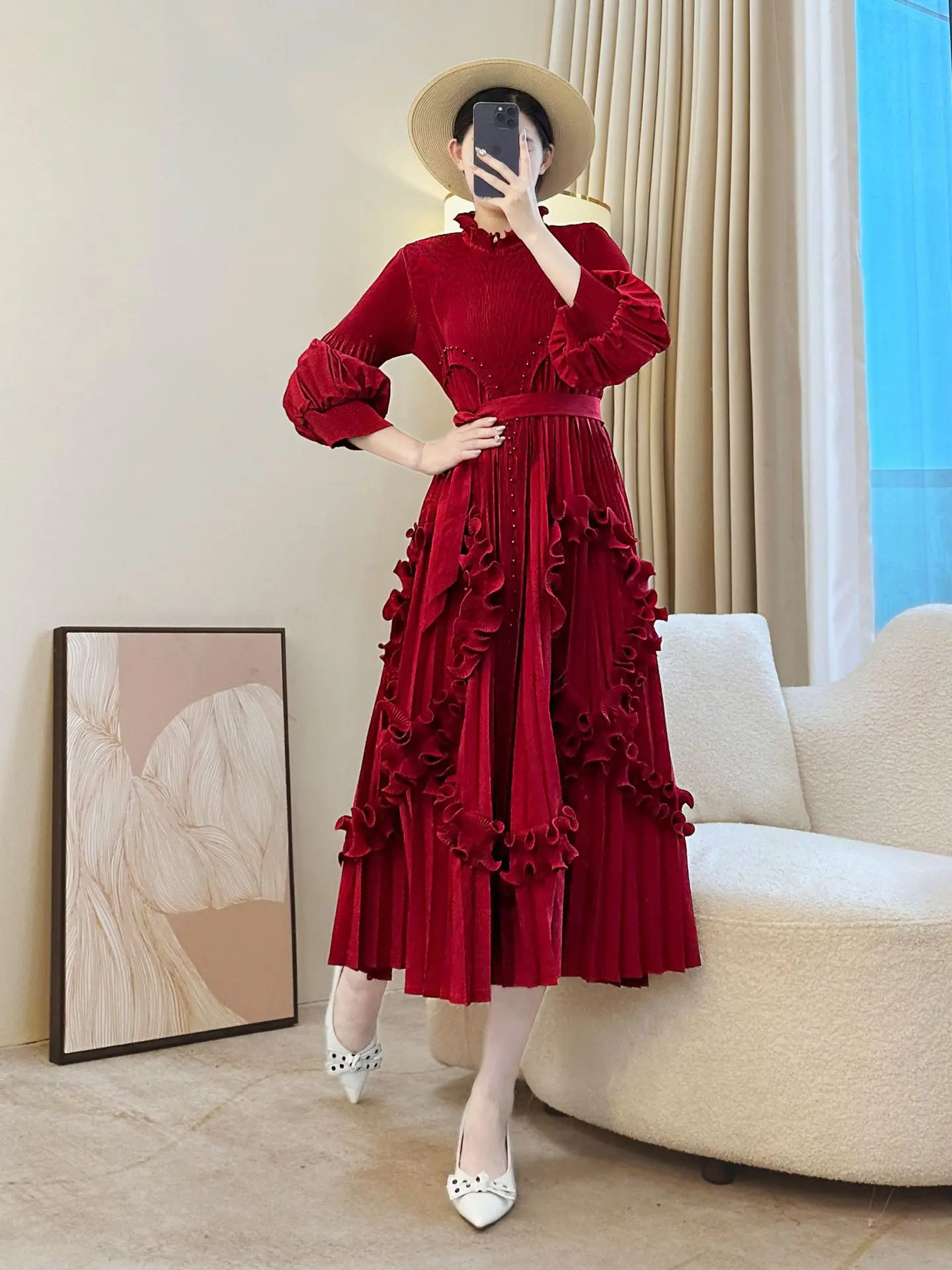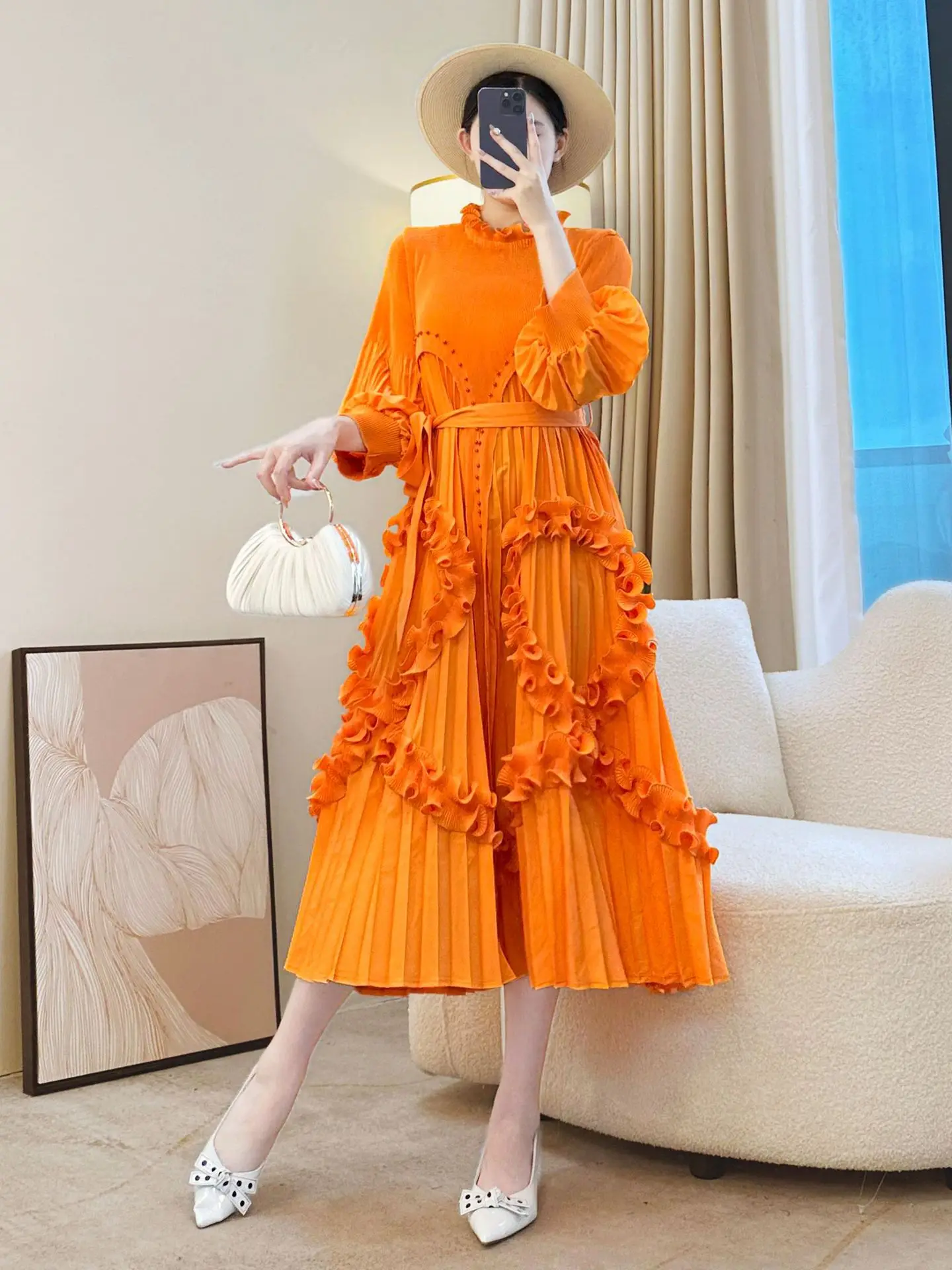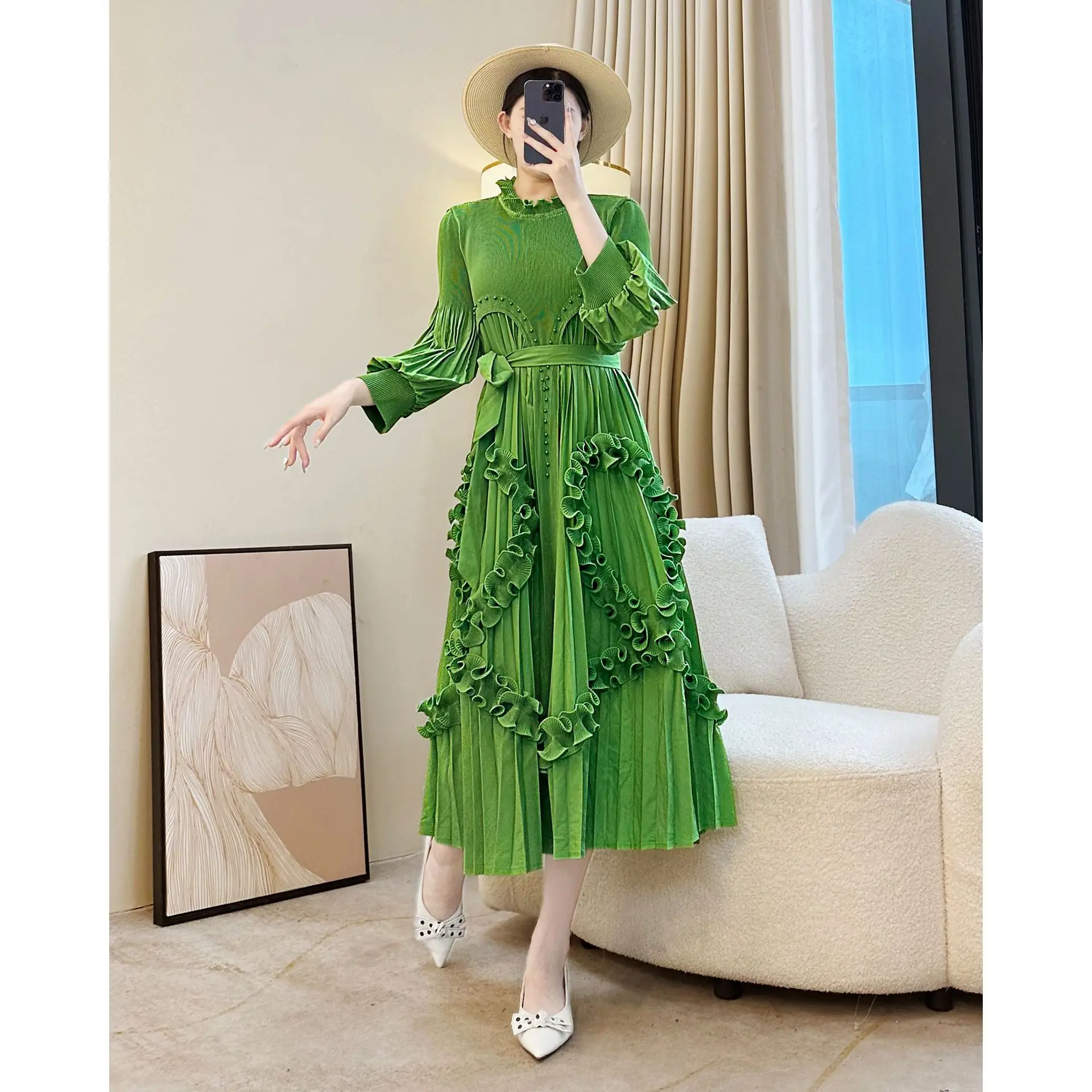 2025 Autumn New High-End Slim Waist Dress Miyake Green Pleated Lace Decorated Casual Style Empire Generational Hair Generation