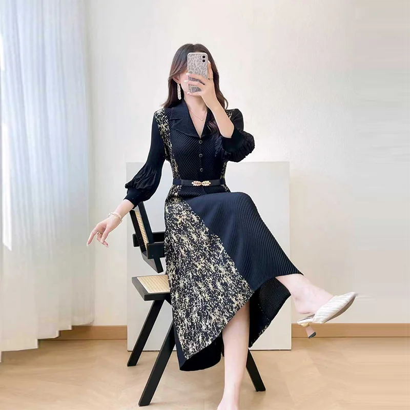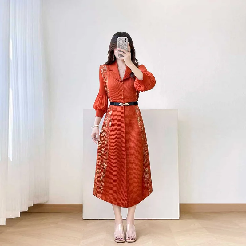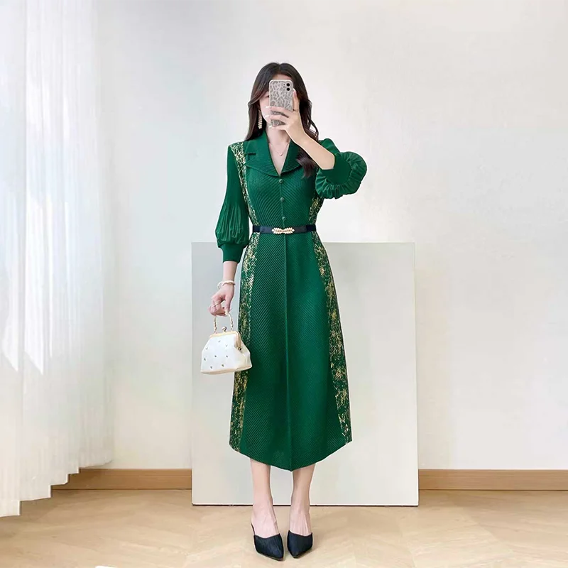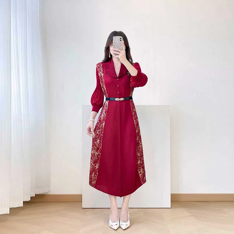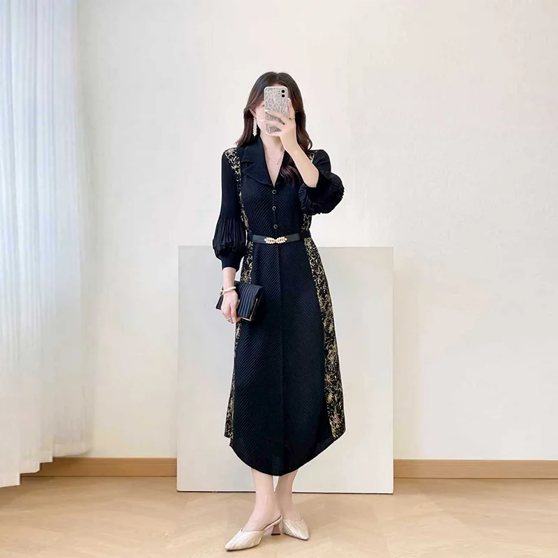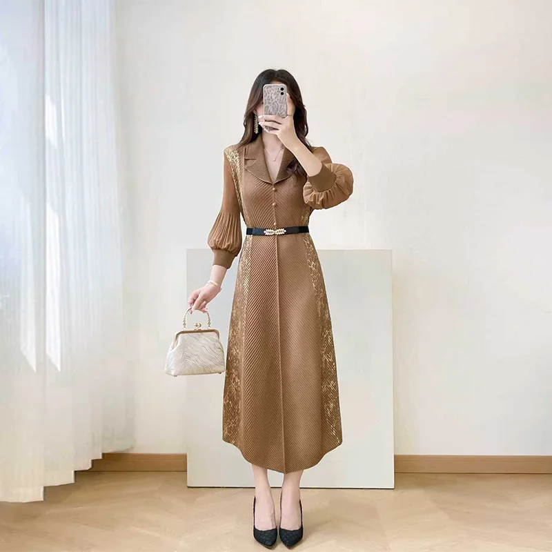 2025 Autumn New Pleated Women’s Dress Solid Color Gilded Lantern Sleeve Temperament Slim Lace-up Casual Style