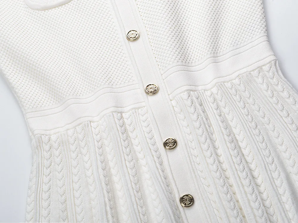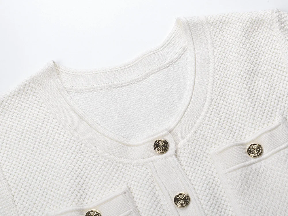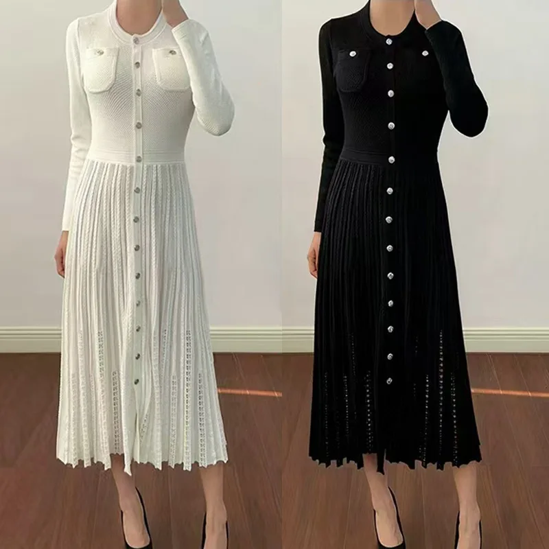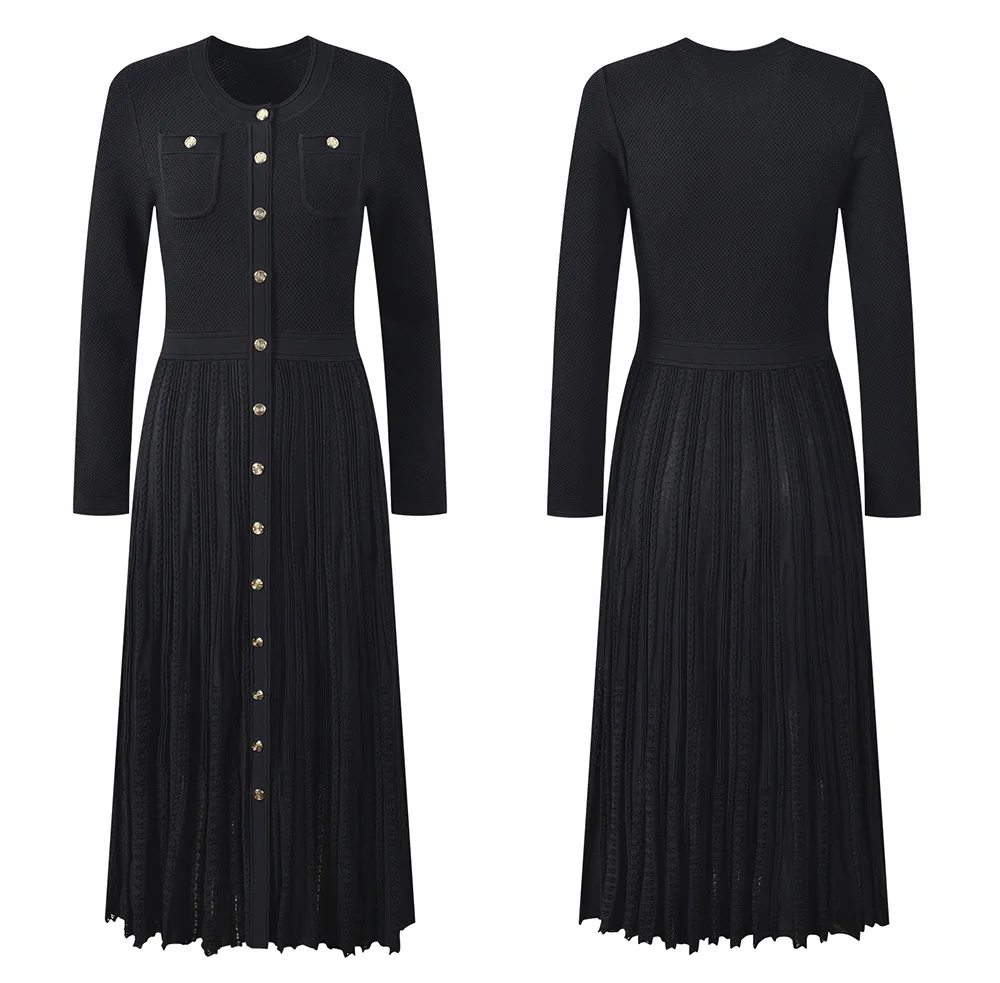 2025 Elegant Style In Stock Autumn Lady Solid O-neck Single-breasted Long Sleeve Women Knit A-line Midi Dress