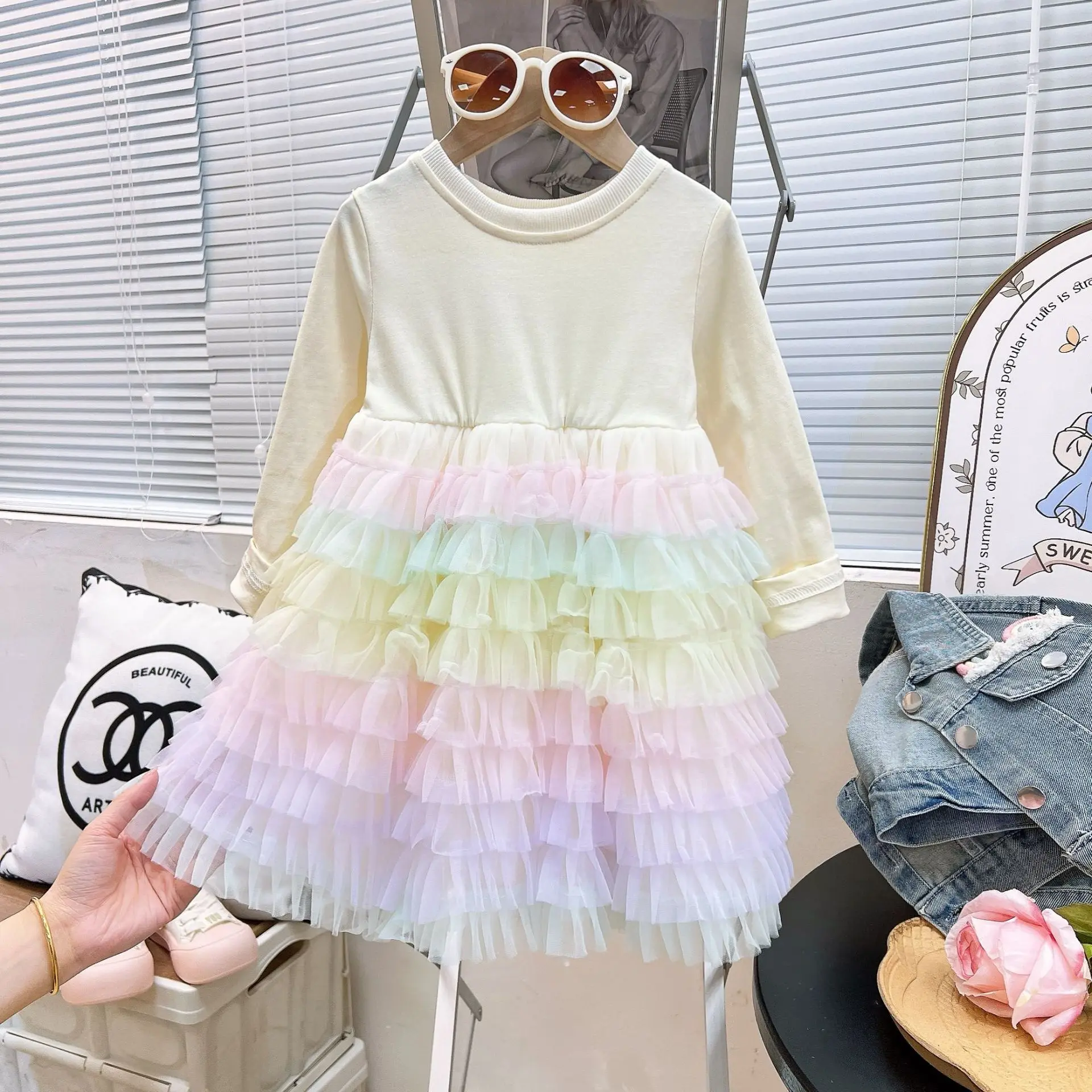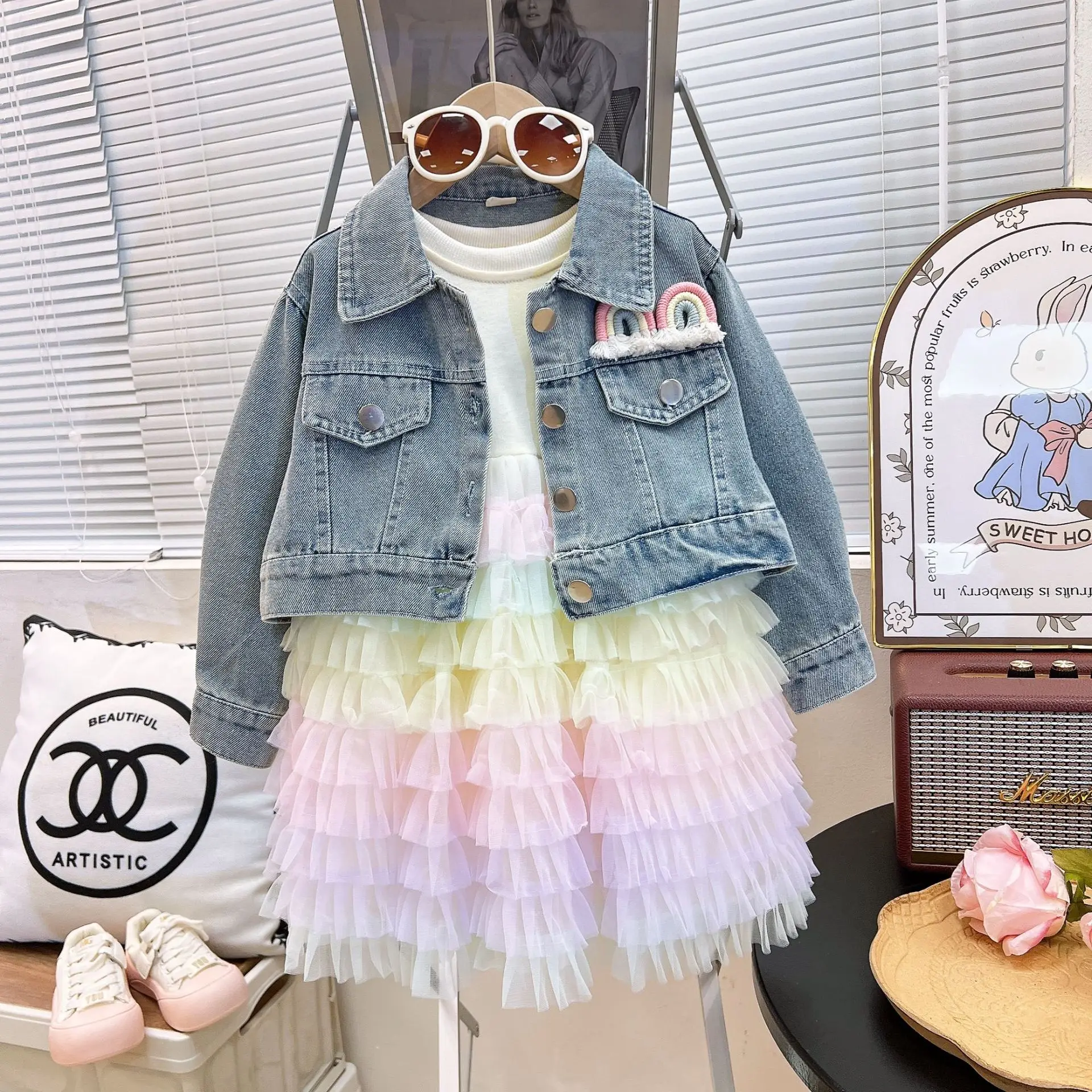 2025 New Autumn Girls Clothes Set Kids Denim Jacket Long Sleeve Dress 2pcs Outfit rainbow Cake Dress