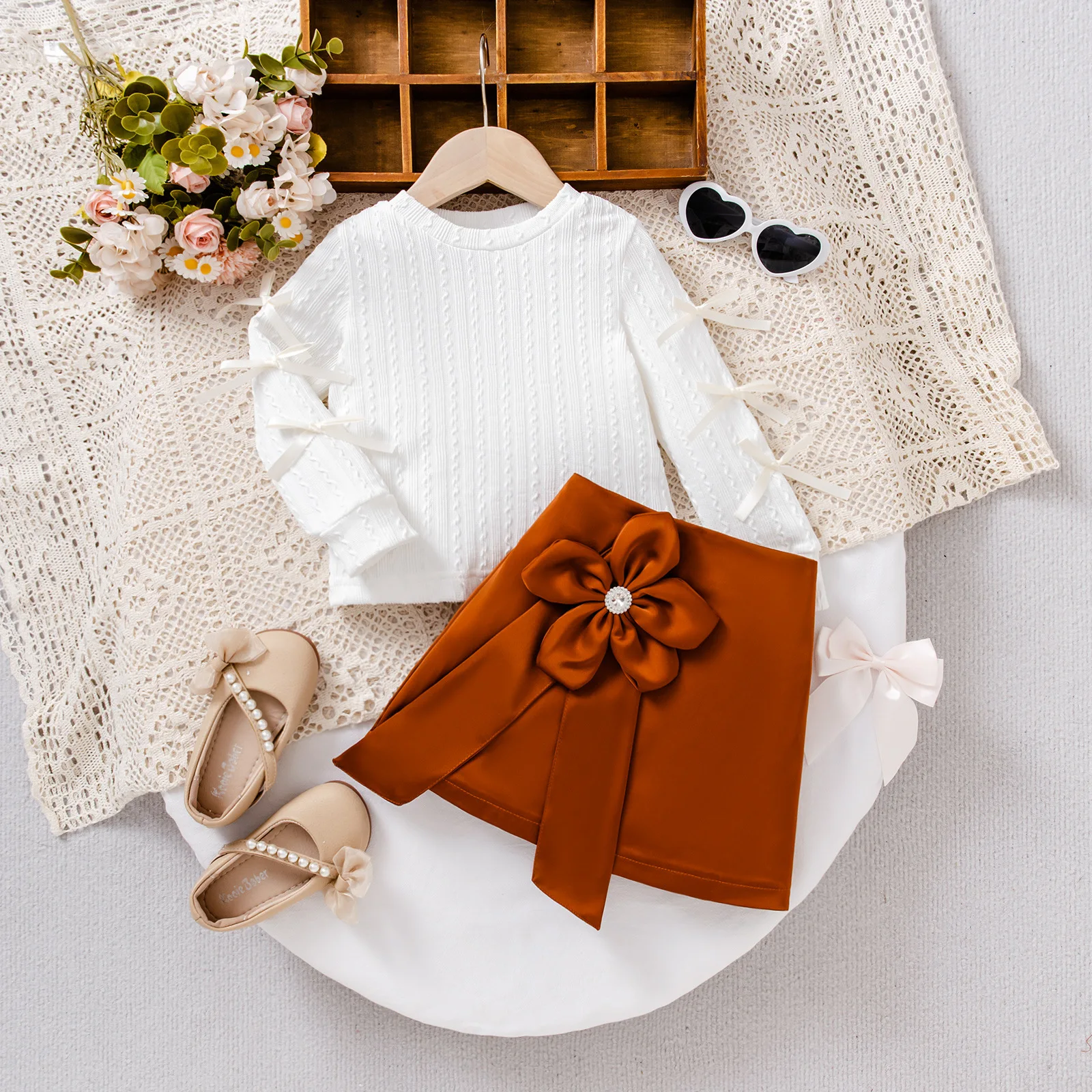 2025 New Autumn Girls Floral Clothes Set Kids White Blouse Floral Skirts 2pcs Outfit 2-7y