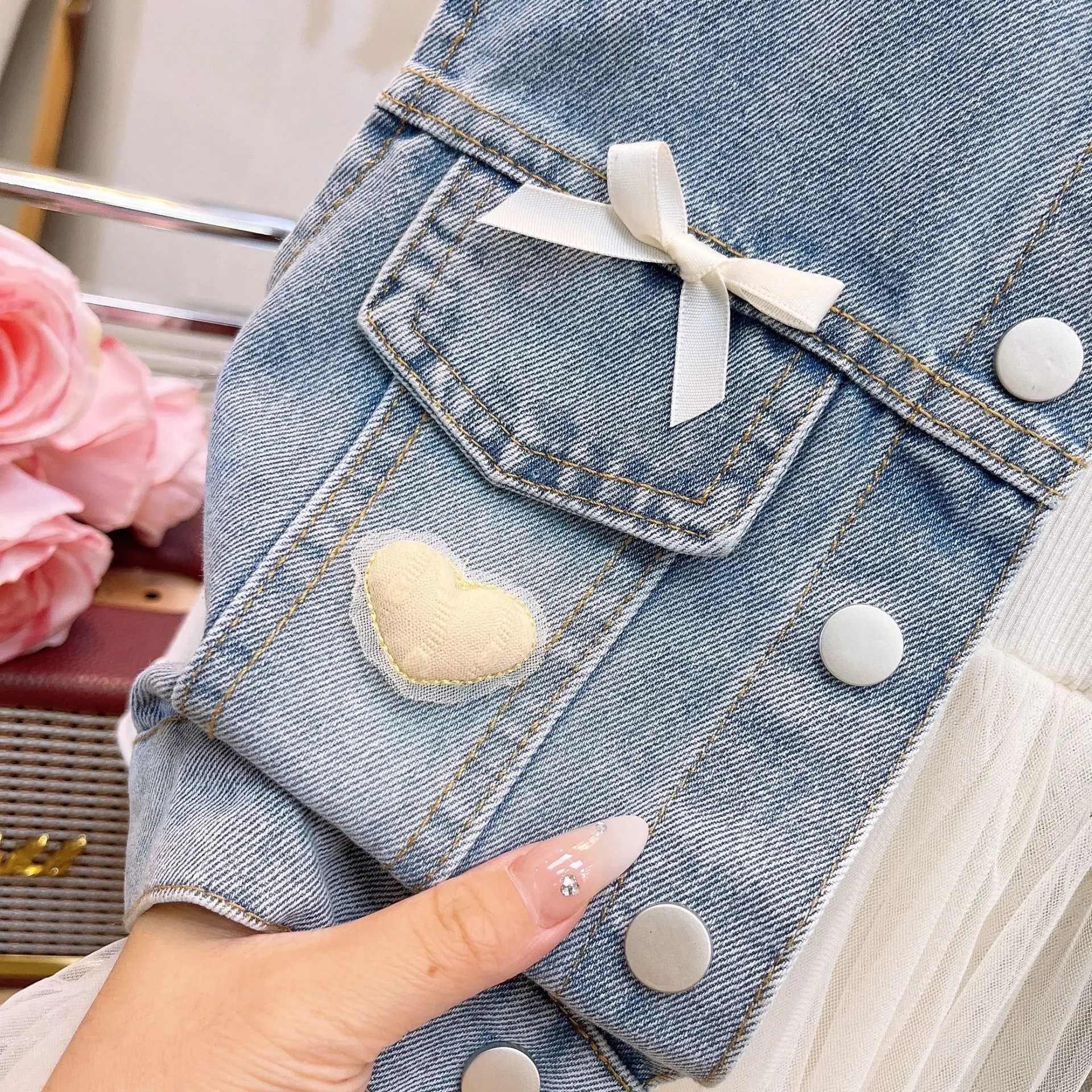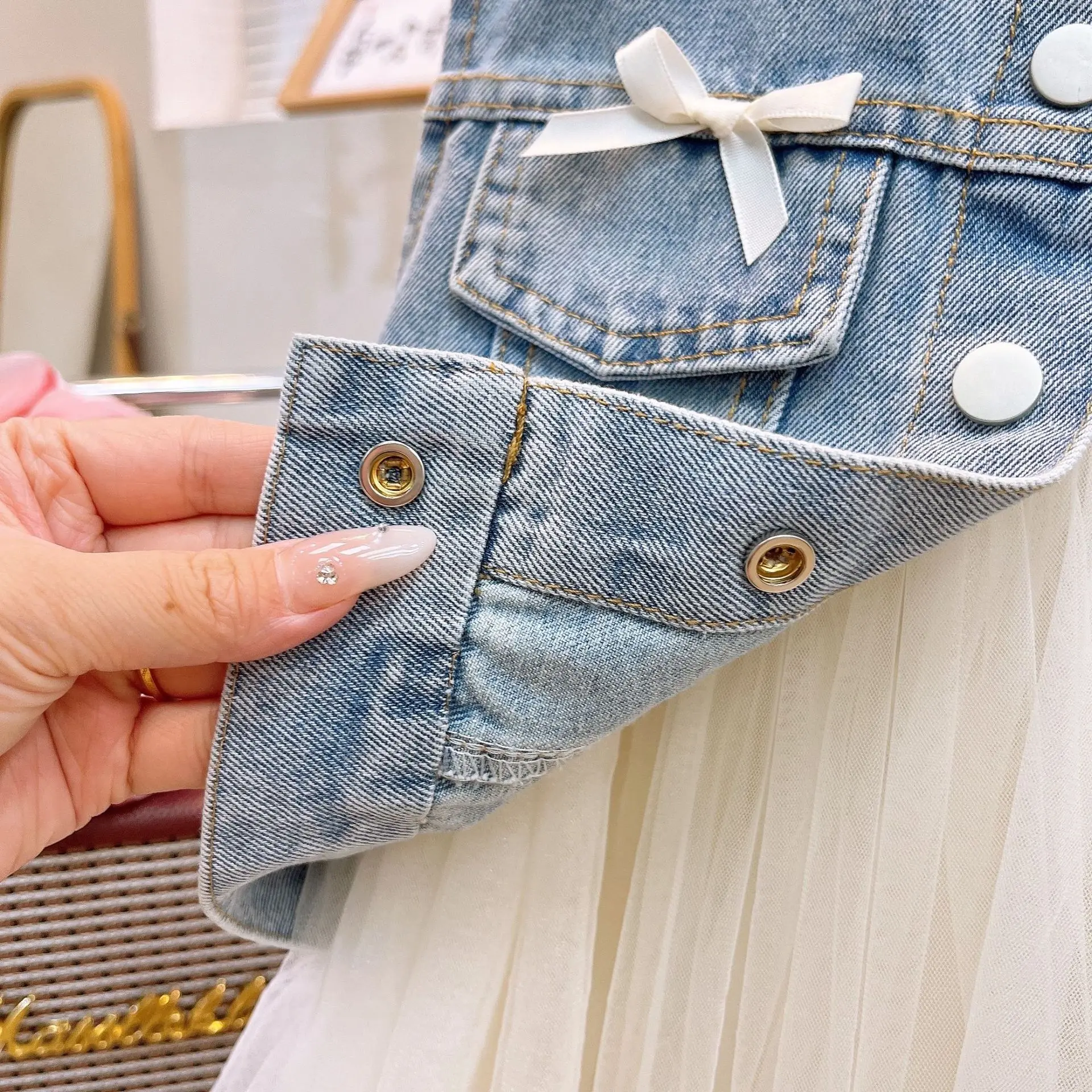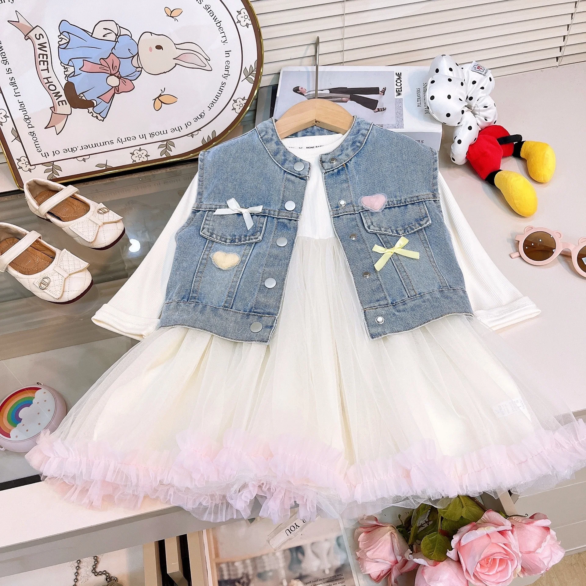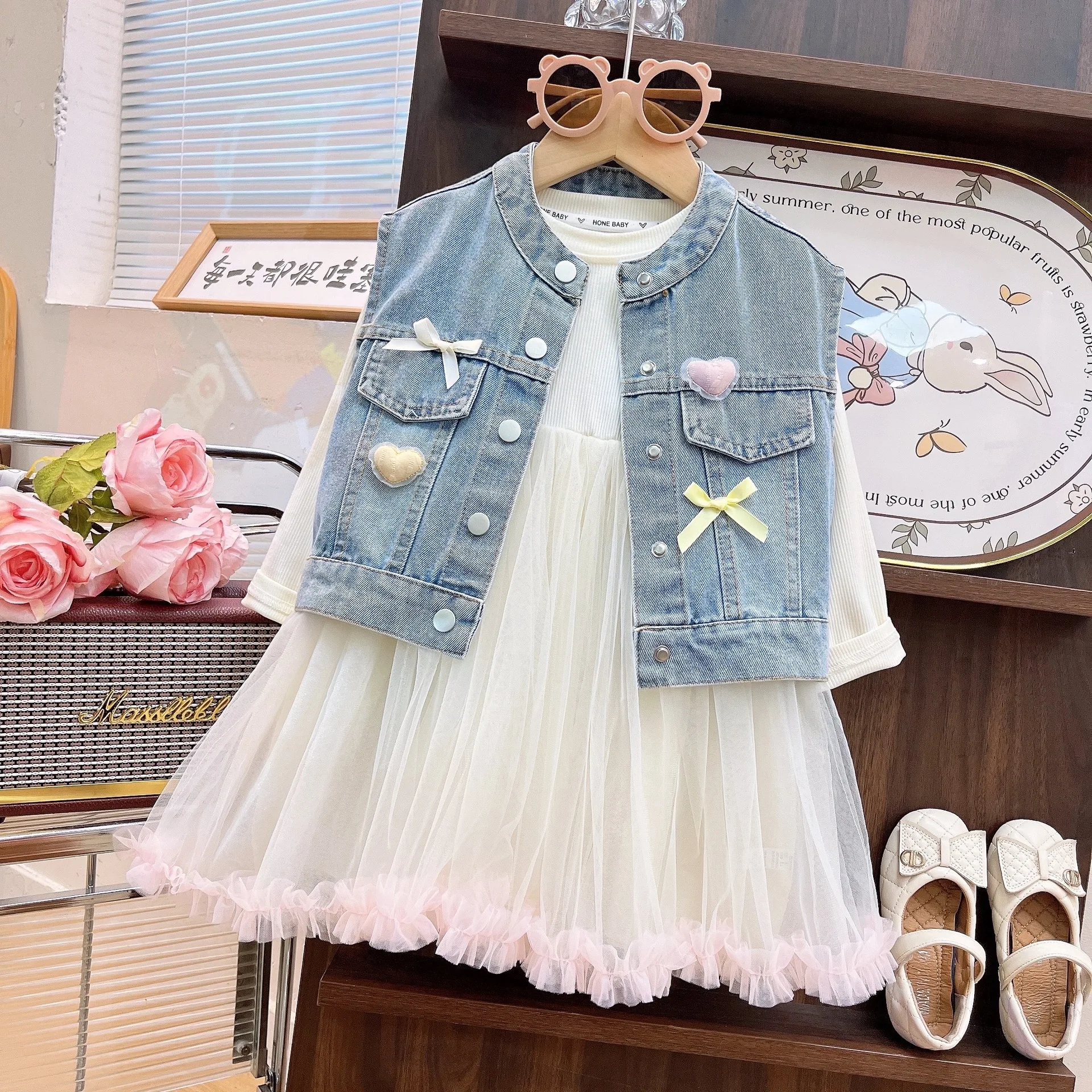 2025 New Autumn Girls Princess Clothes Set Kids Denim Vest Long Sleeve Ruffle Dress Clothing Sets