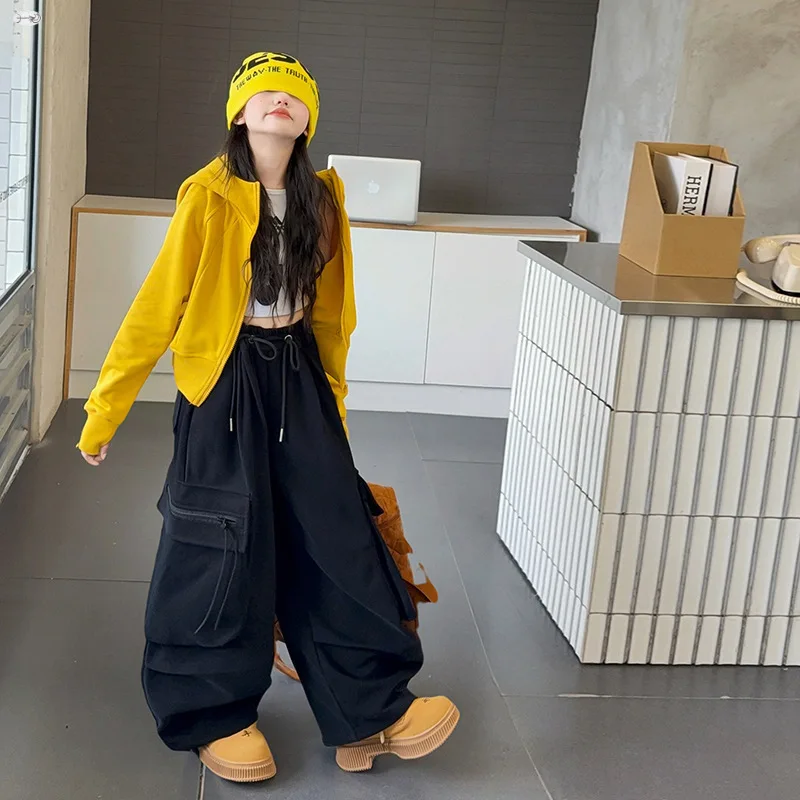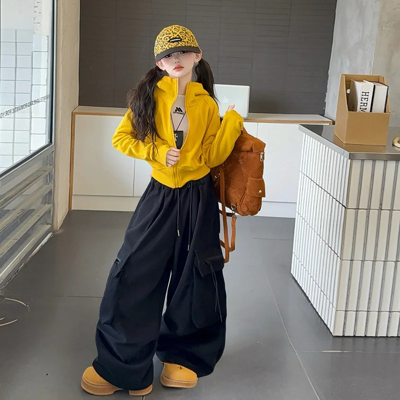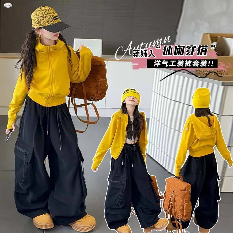 2025 New Fashion Kids Girl’s Autumn Winter Clothing Set Yellow Sport Sweatshirt Jacket + Cargo Pants 2 Pcs Outfit Set