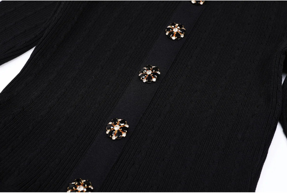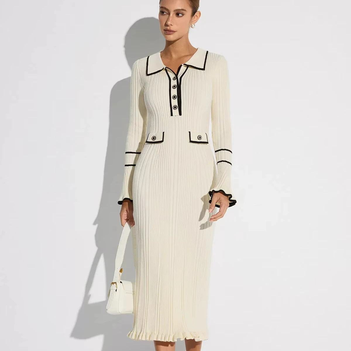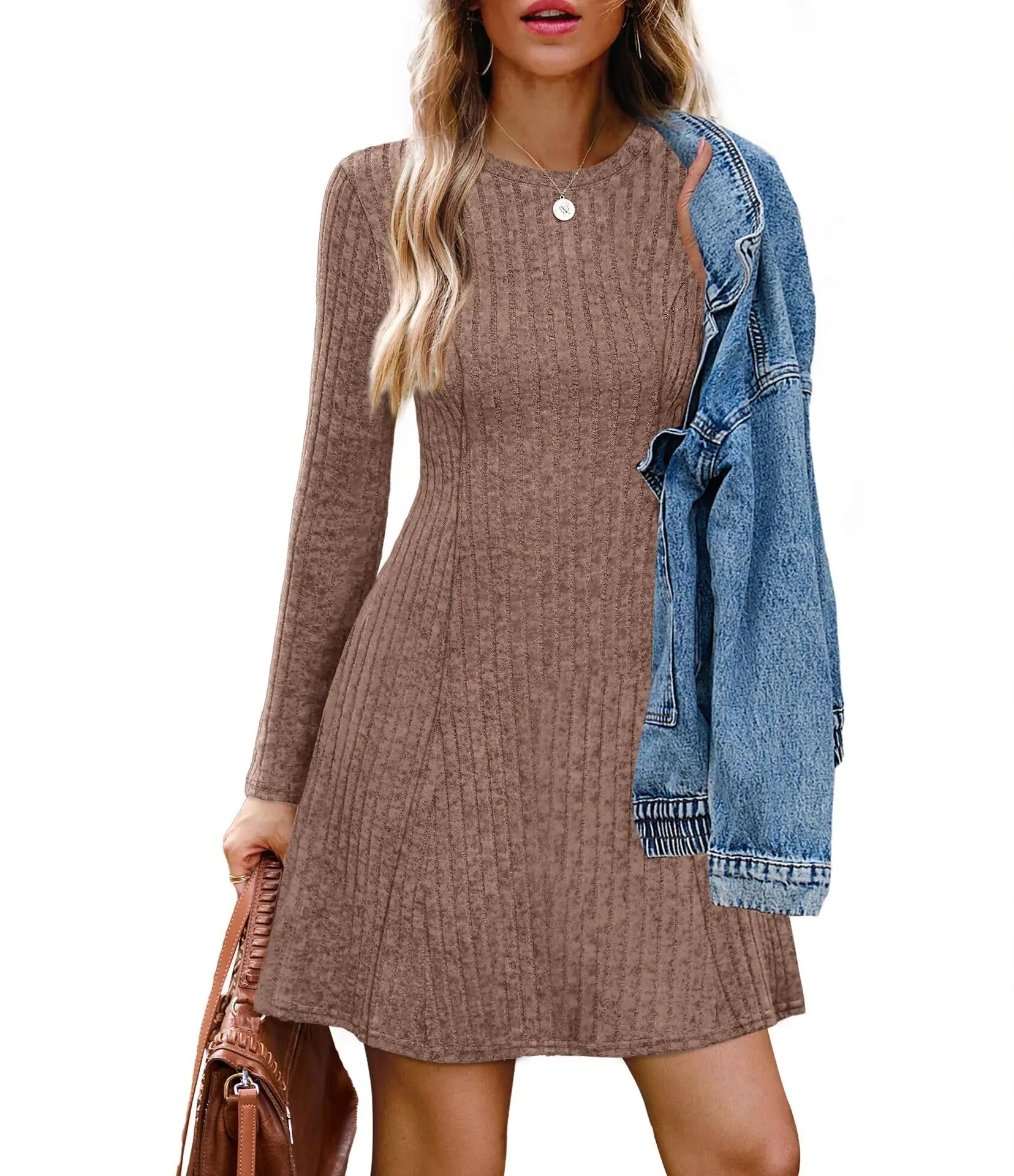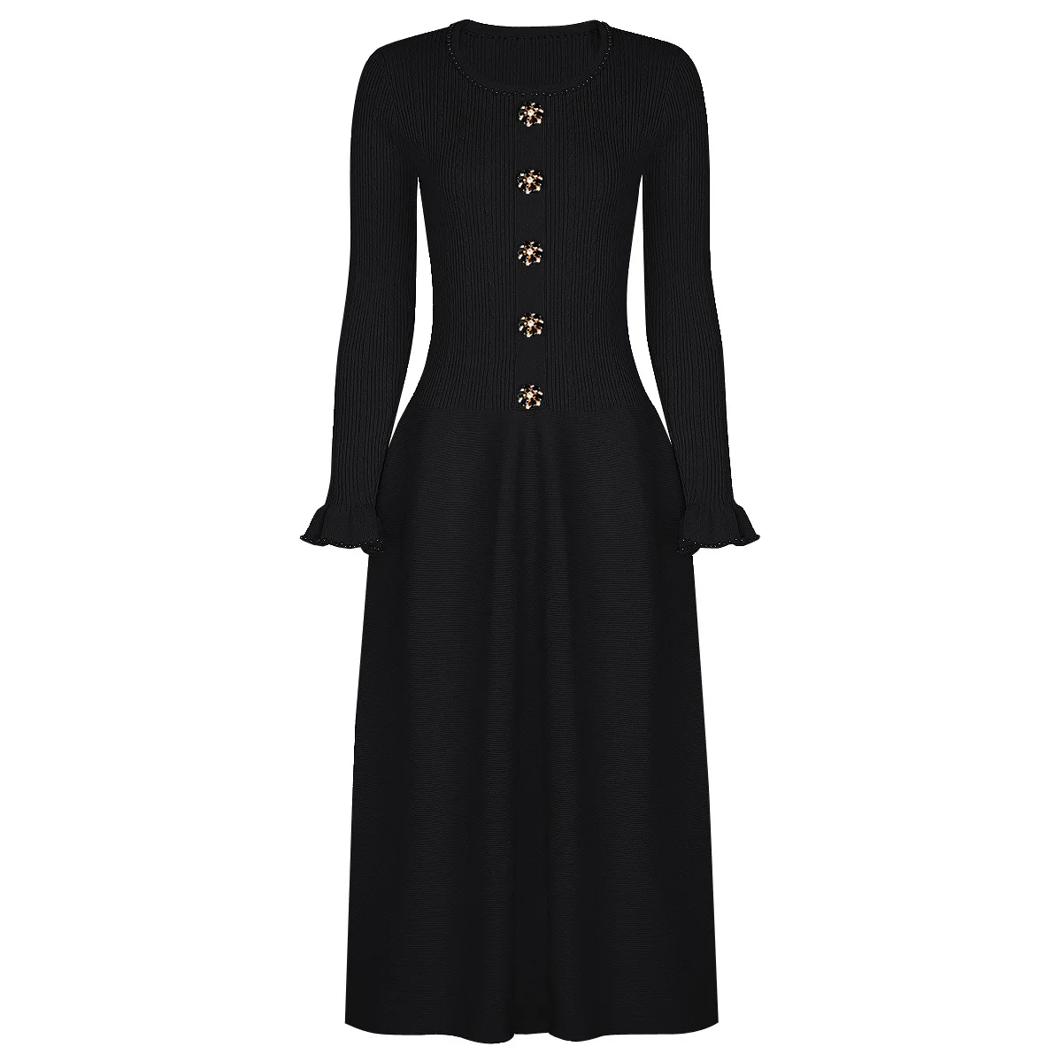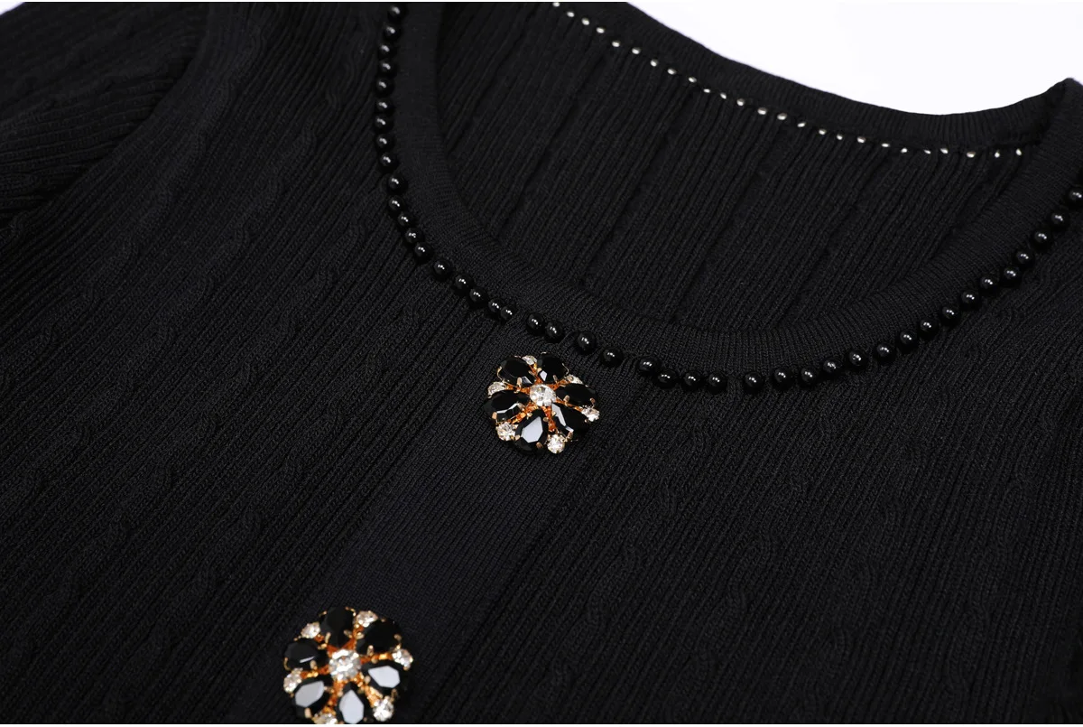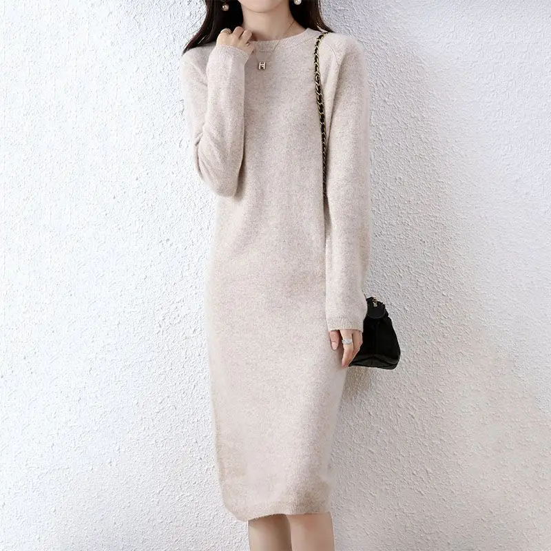 2025 Quality Beading Basic Elegant Style in Stock Autumn Lady Solid O-neck Long Sleeve Women Knit A-line Midi Dress