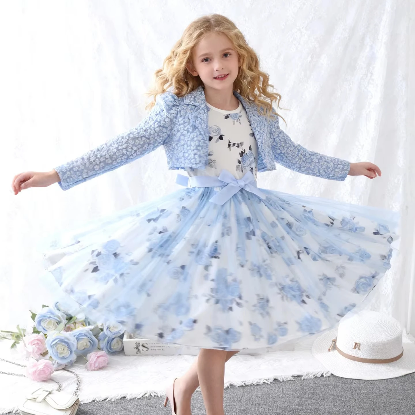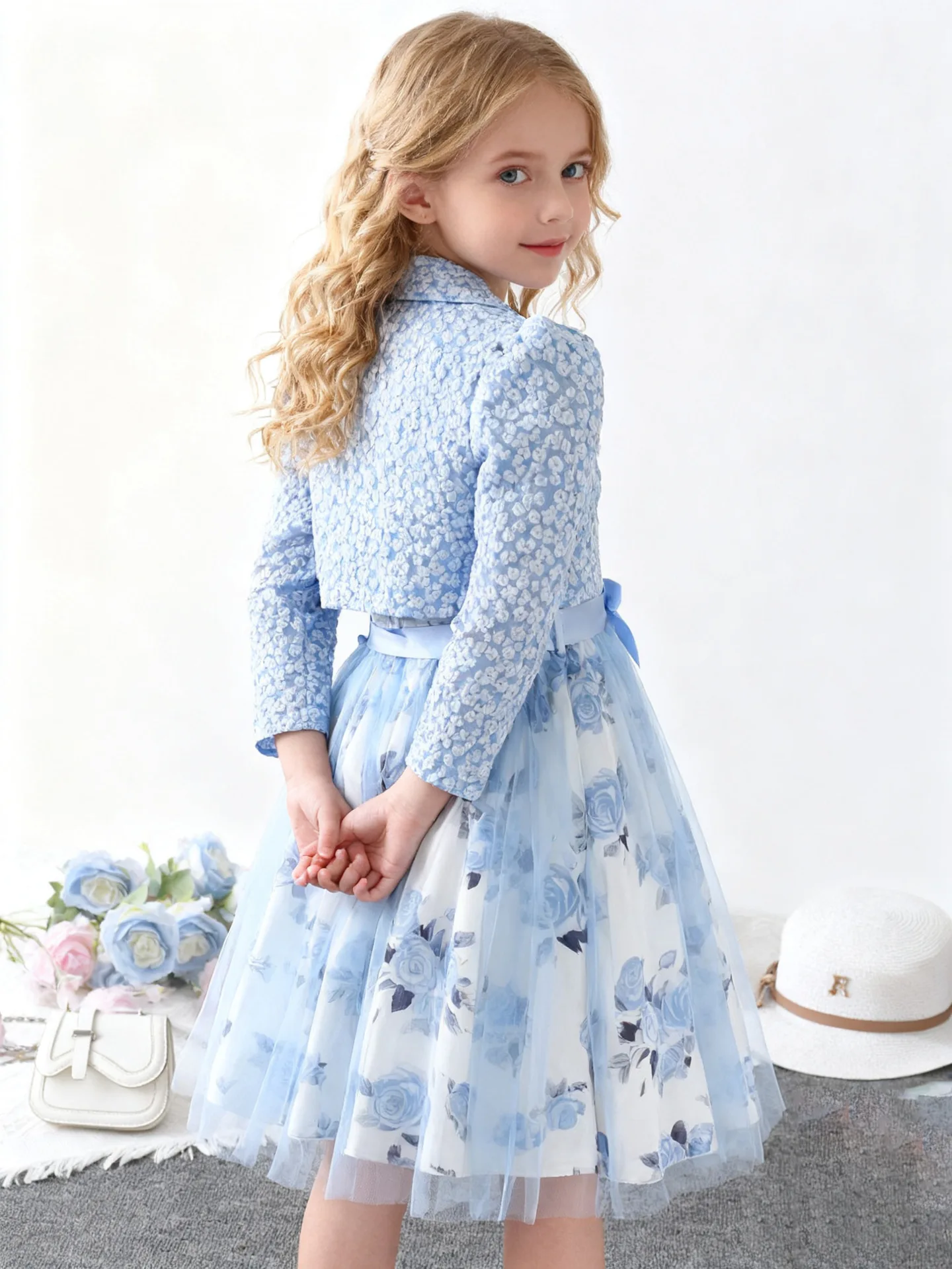 2025 Spring Autumn Teenage Kids Girls Two Piece Set Long-sleeved Collared Coat Mesh Flower Dress Wholesale Clothing Children