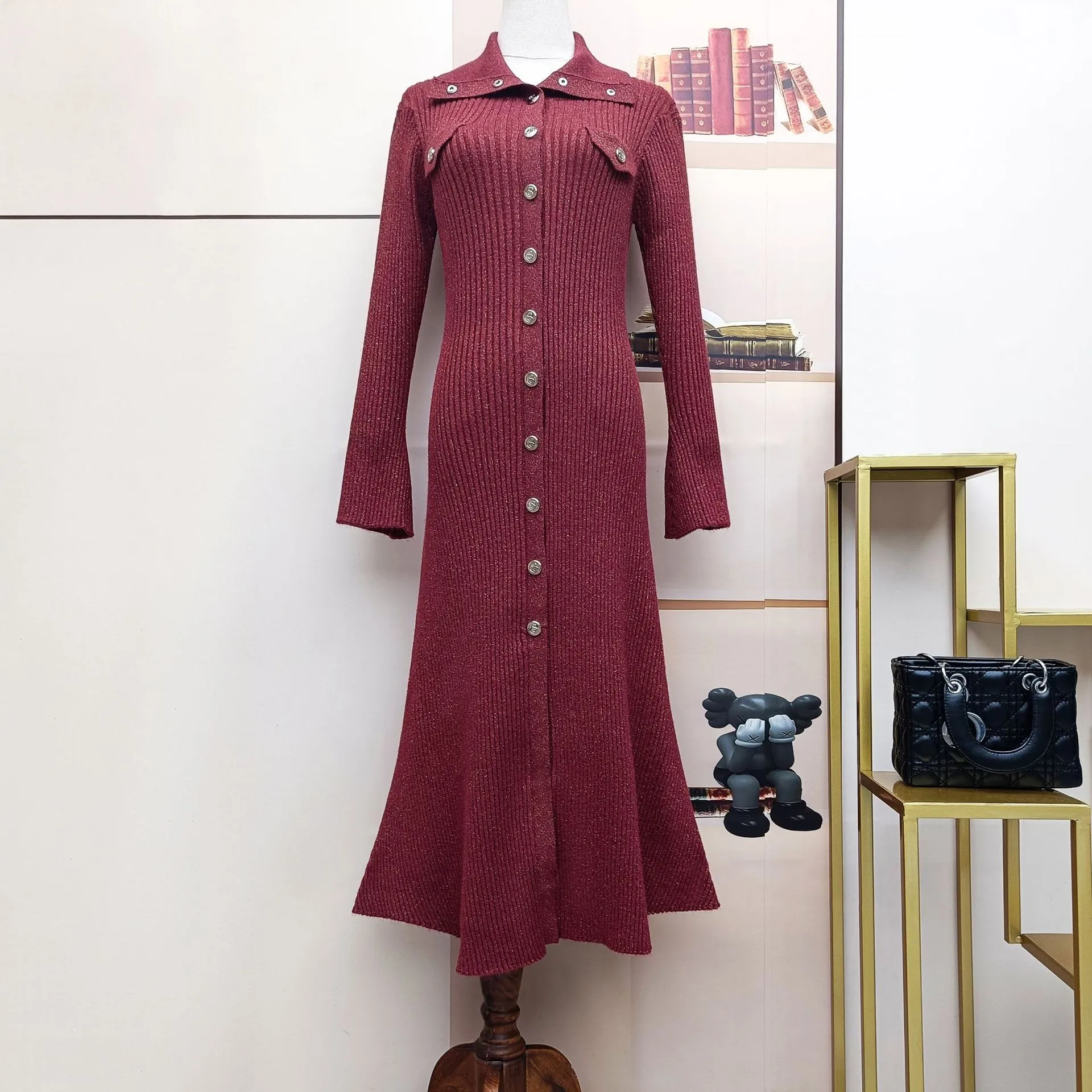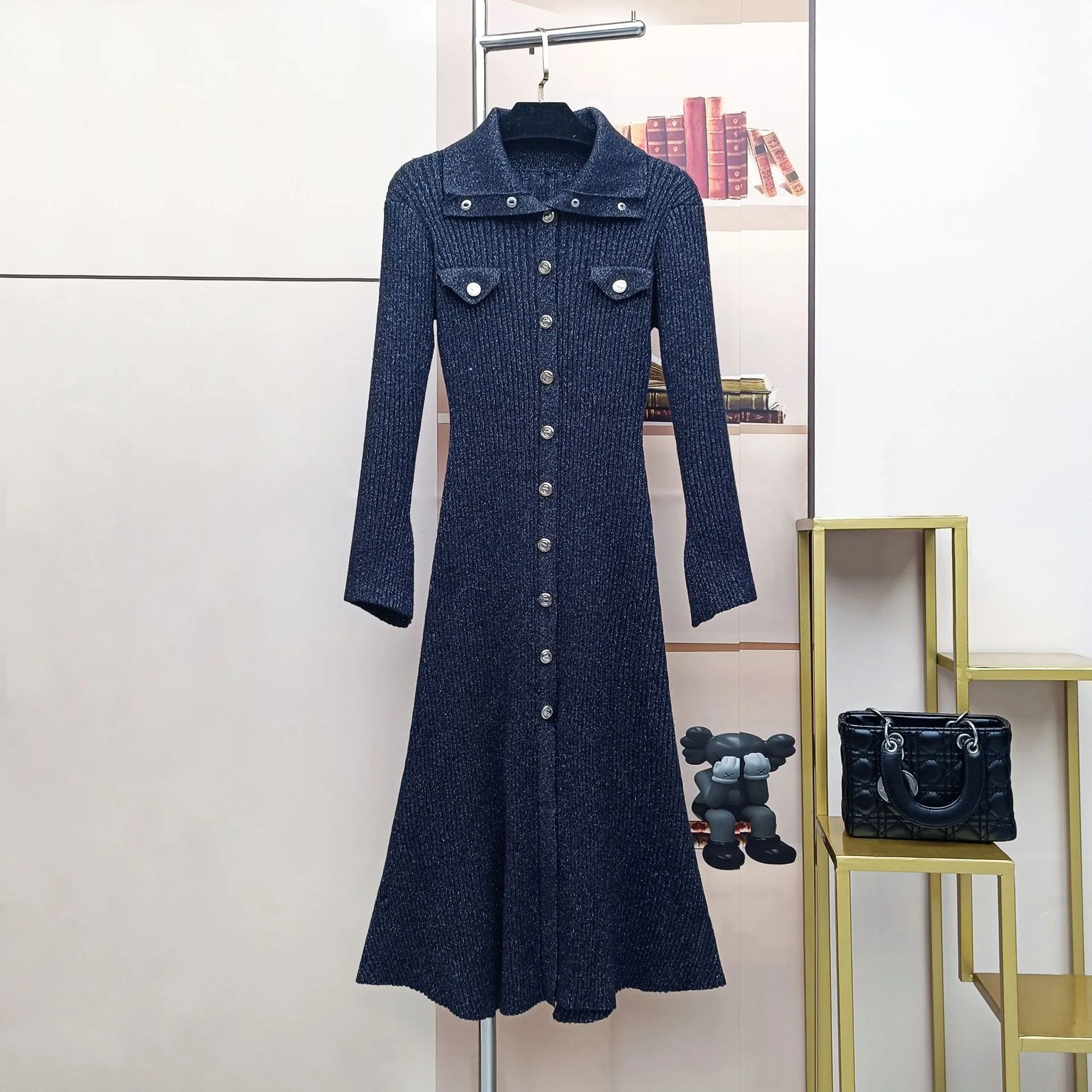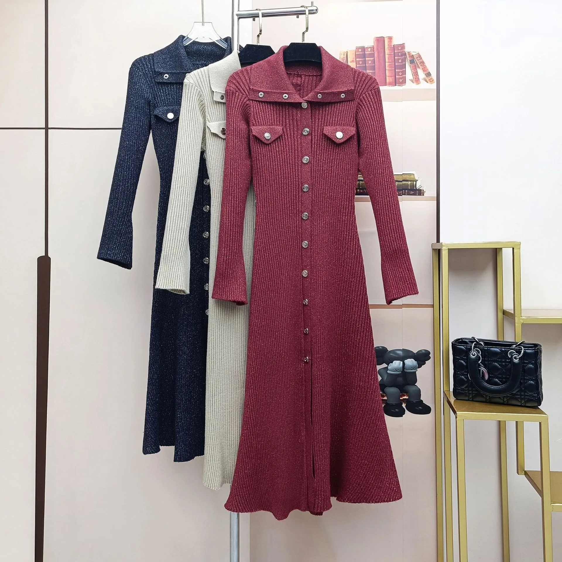 2025 Spring Autumn Winter Casual Elegant High Neck Button Wool with Gold Thread Slim Fit Women’s Knitted Cardigan Dress