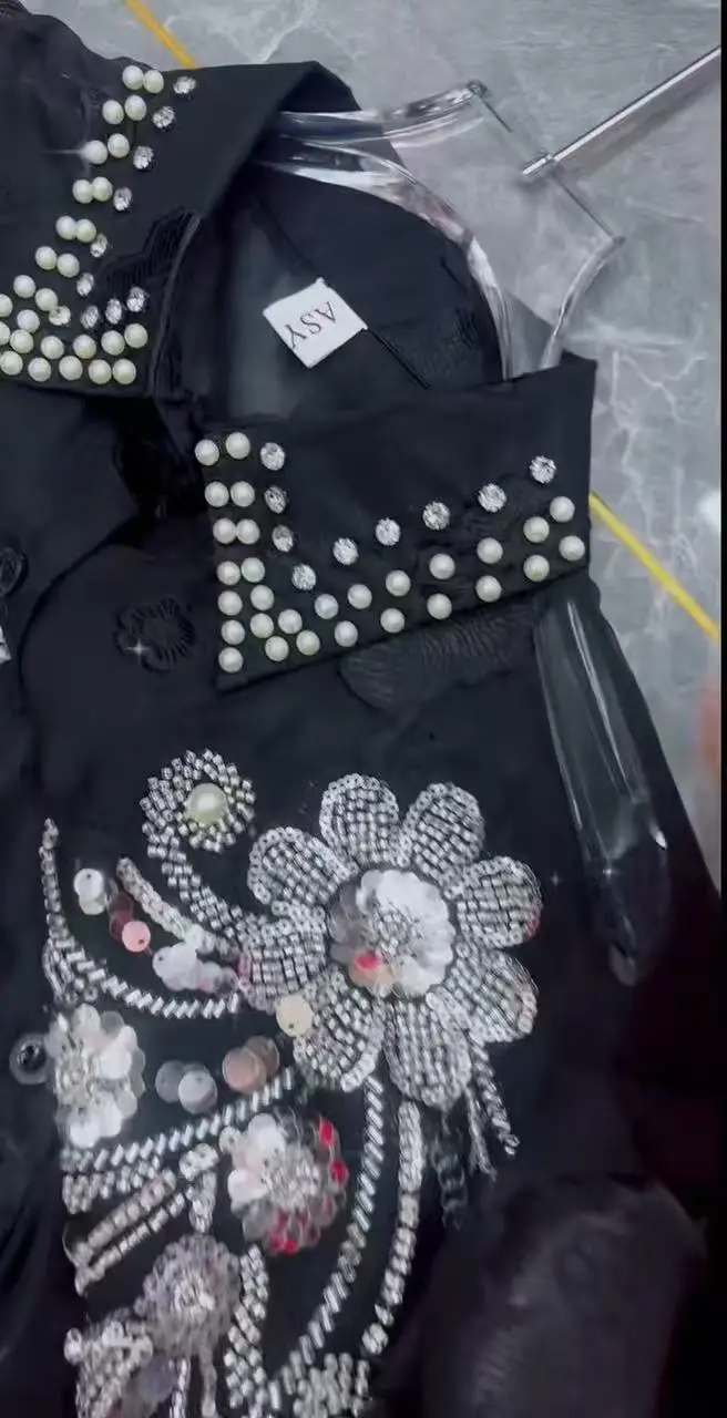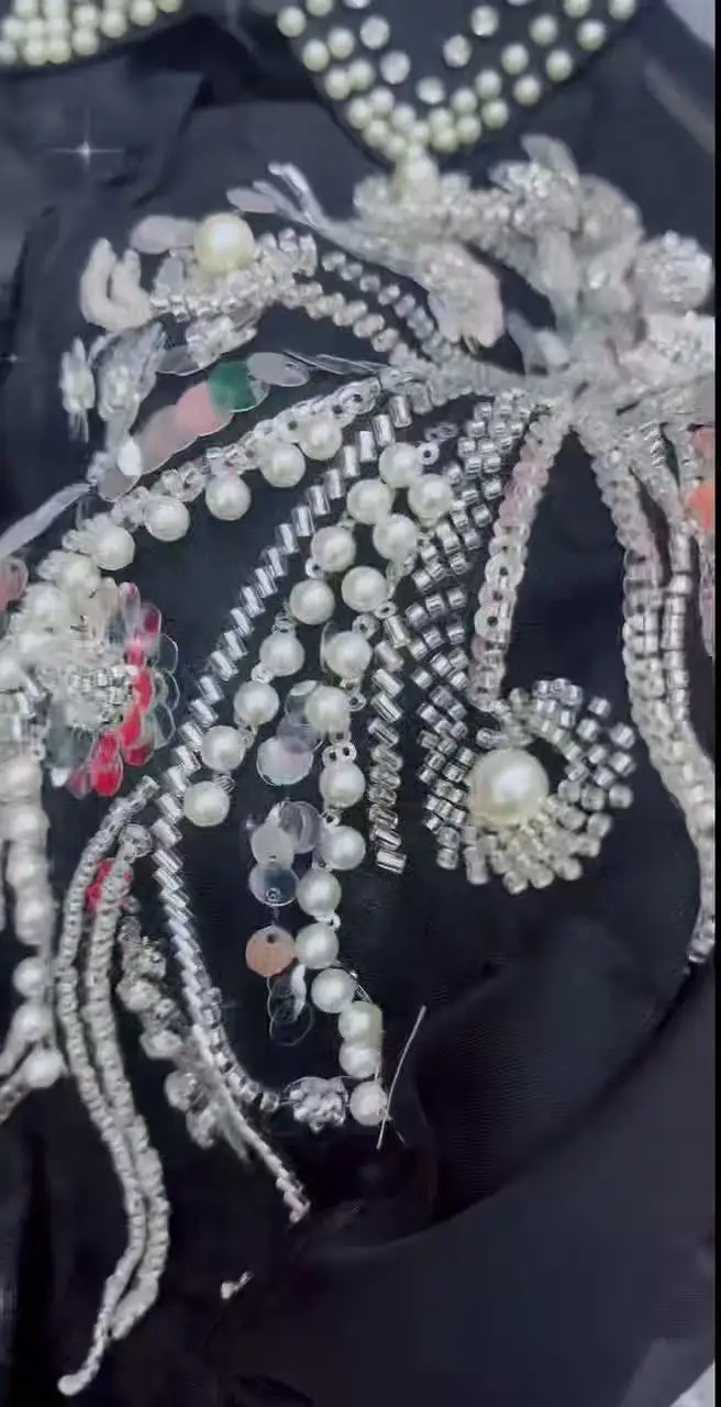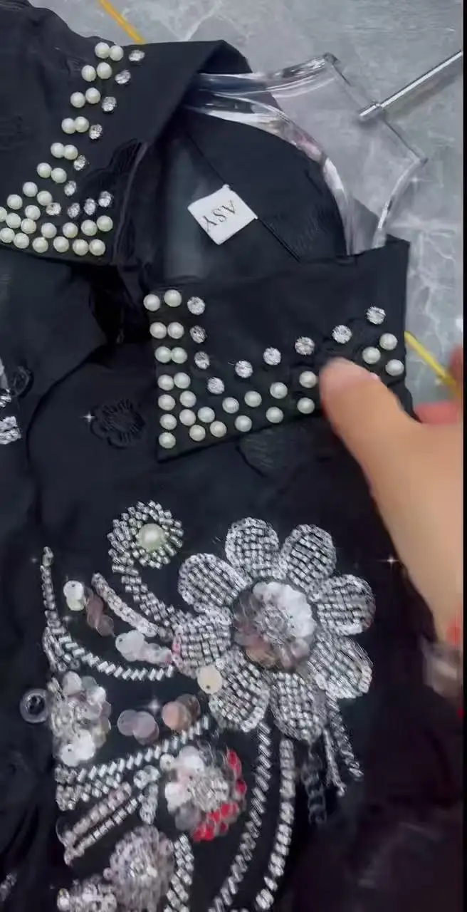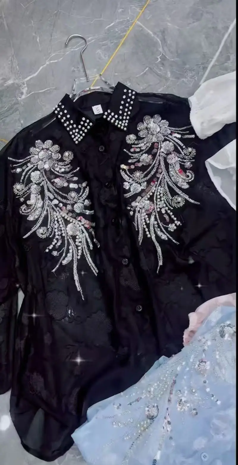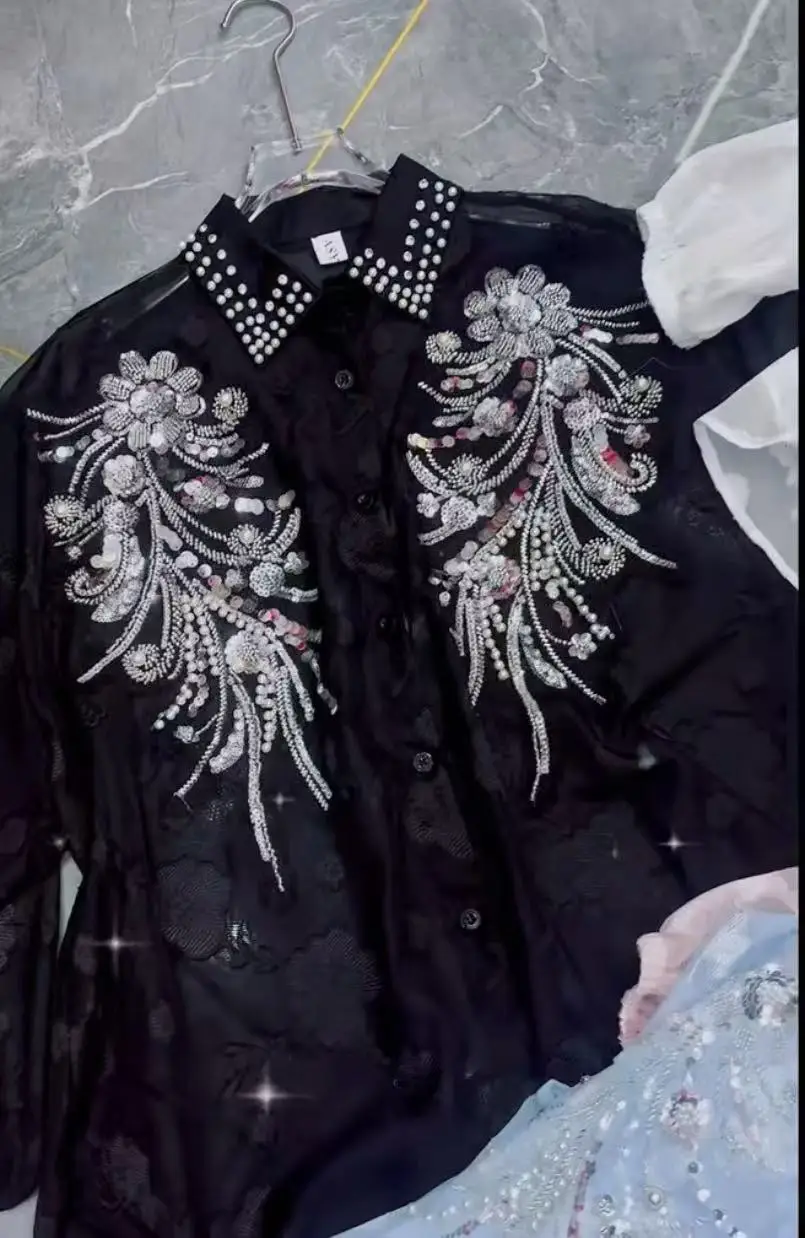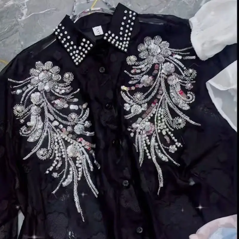 2025 Summer Autumn New Fashionable Lapel Long Sleeved Embroidered Sequins Beads Loose Women’s Party Shirt Wholesale