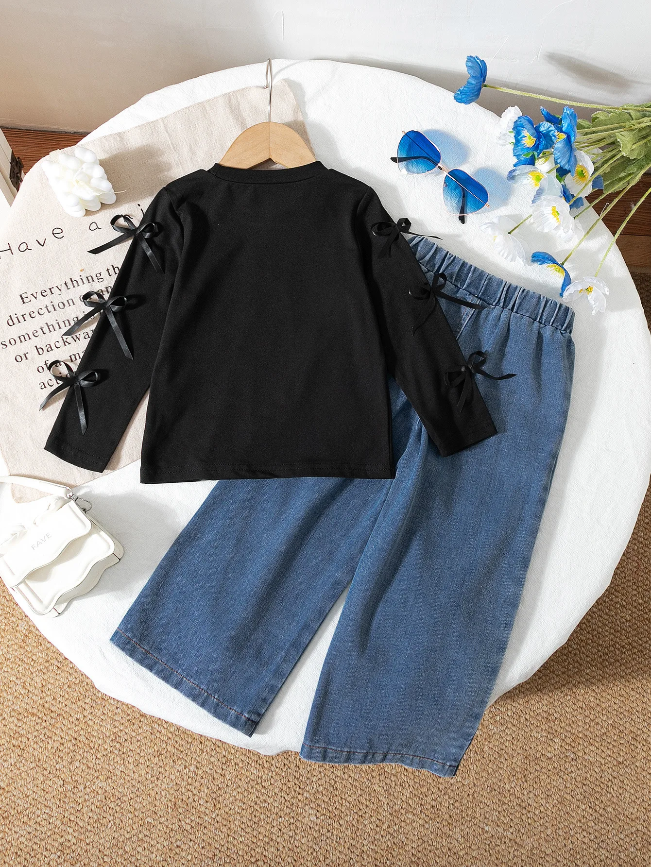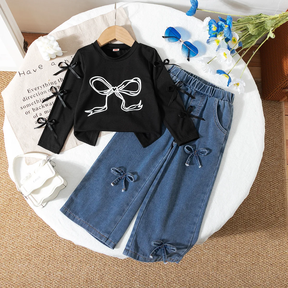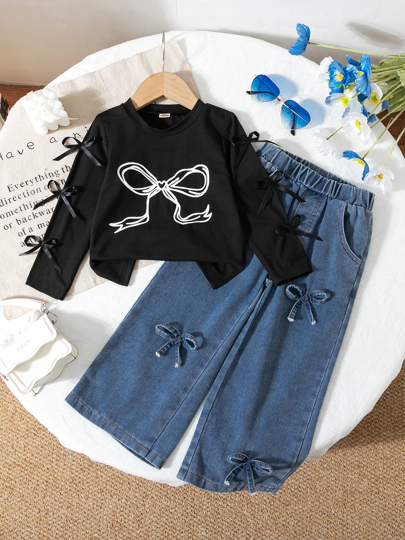 Autumn 2025 Girls Bow Print Crewneck Top Three-dimensional Washable Jeans Two-piece Set