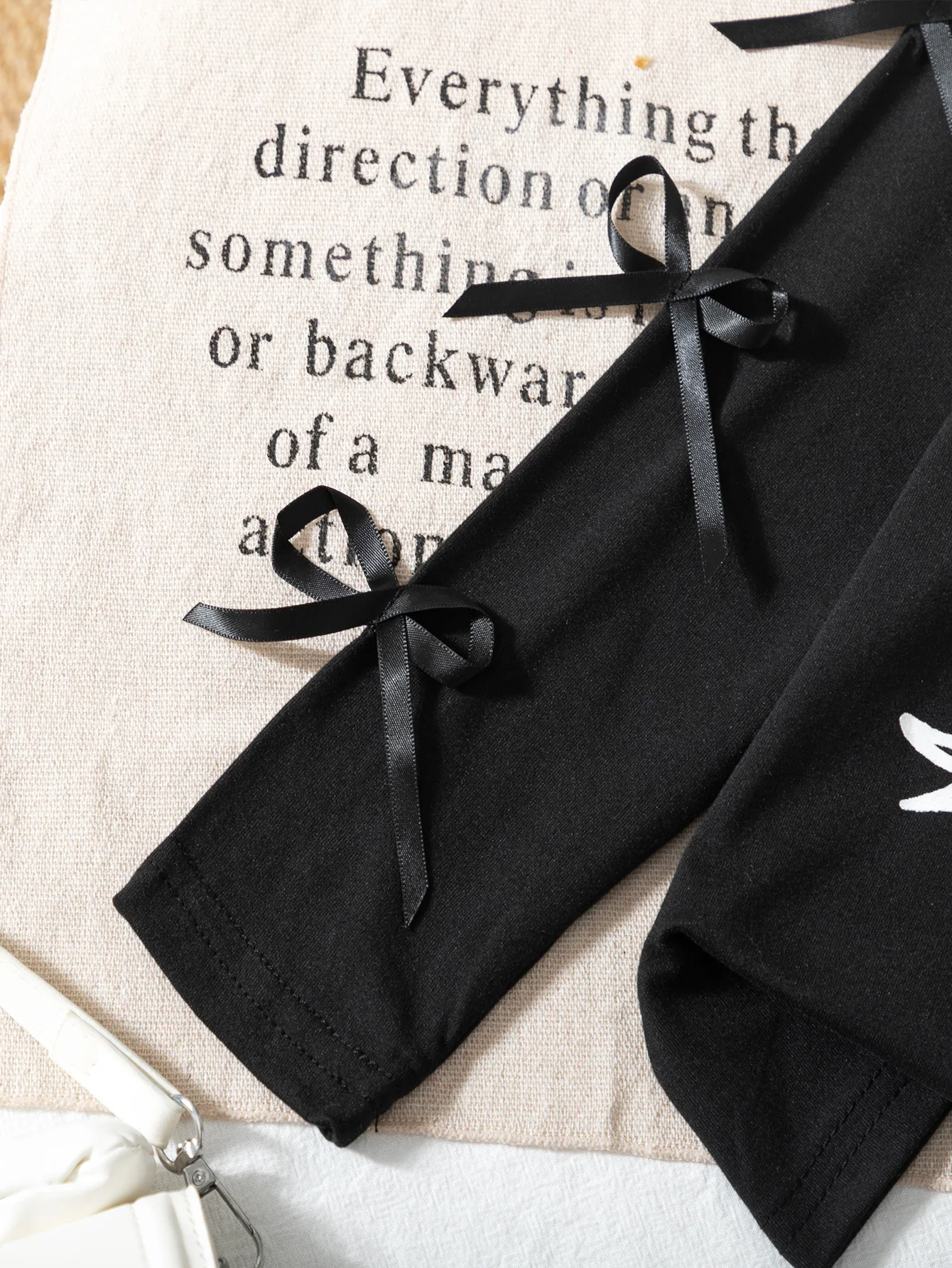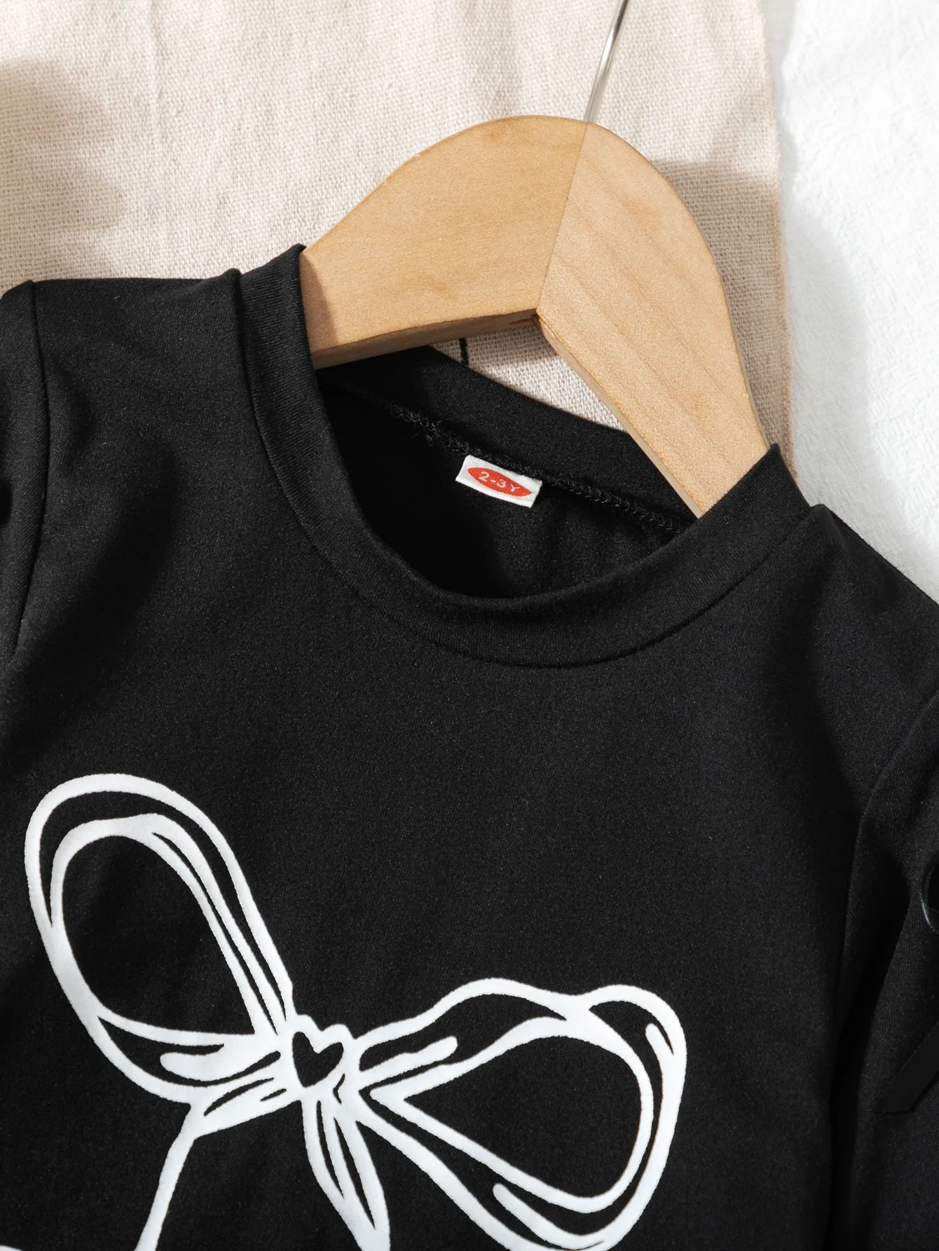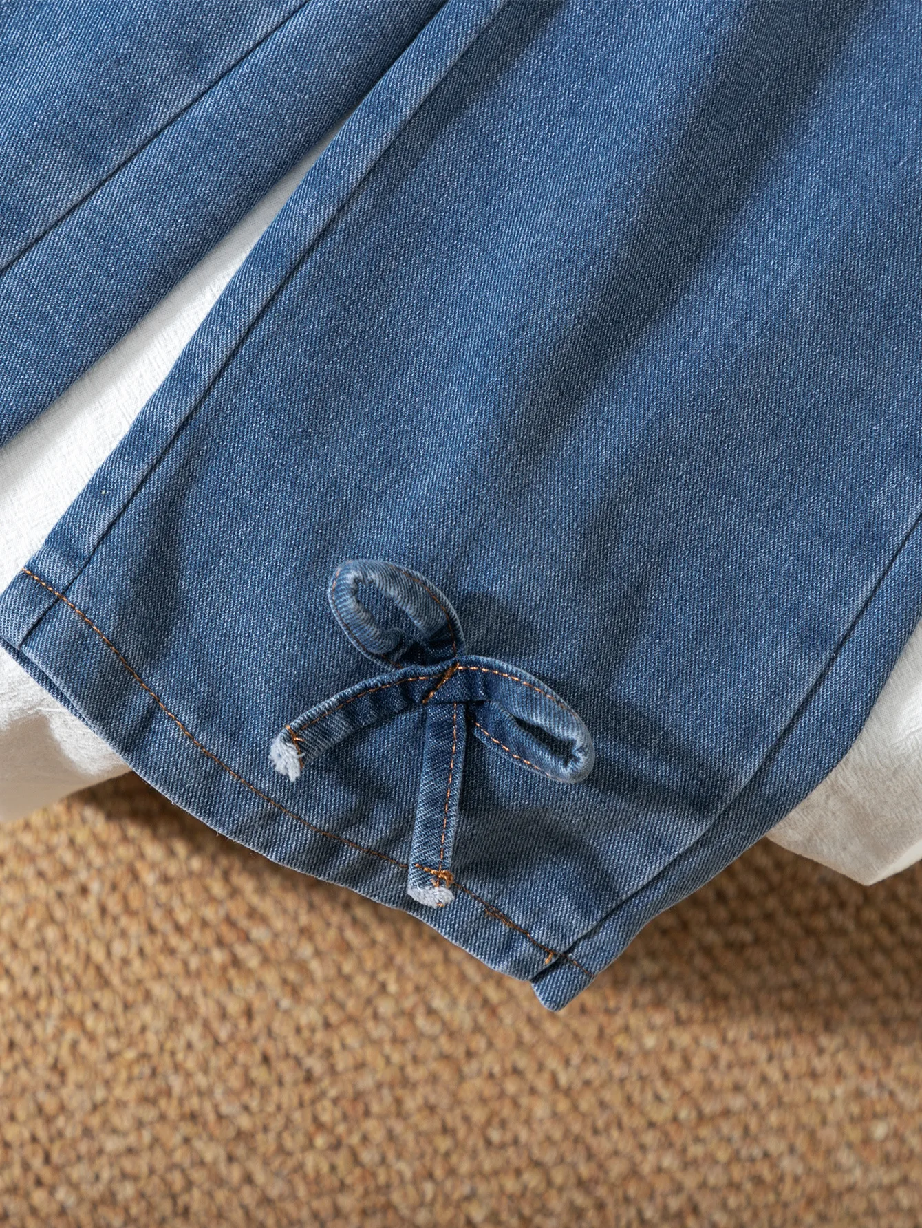 Autumn 2025 Girls Bow Print Crewneck Top Three-dimensional Washable Jeans Two-piece Set