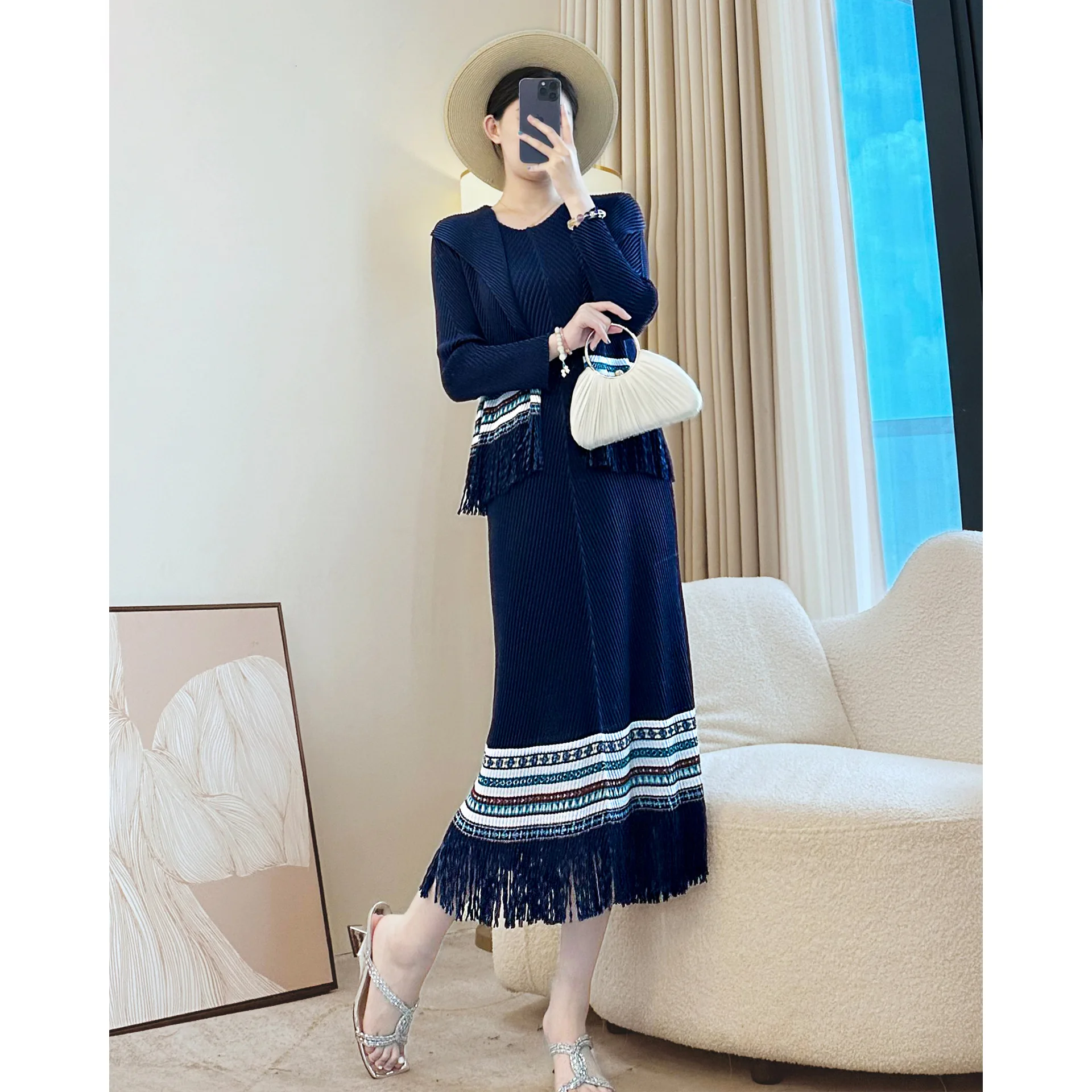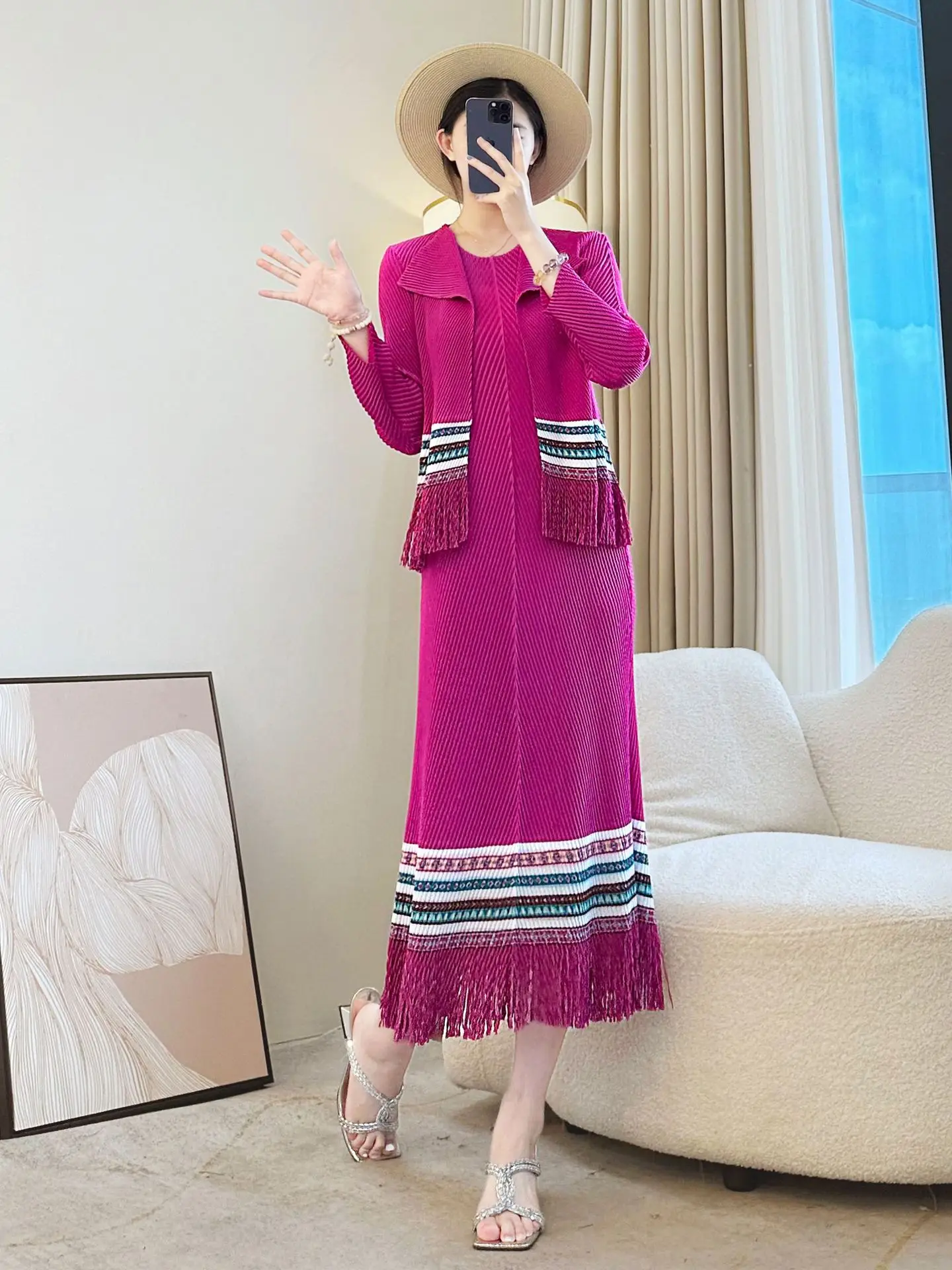 Autumn Elegant Rose Red Dress Suit Casual Style Three-Generation High-Sense Two-Piece Pleated Shirt with Solid Pattern Outside
