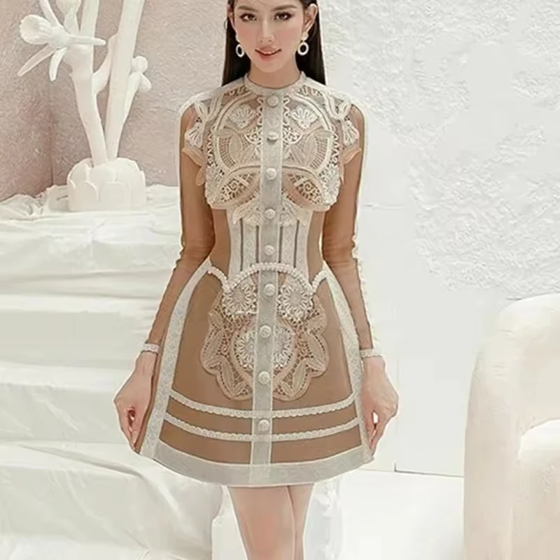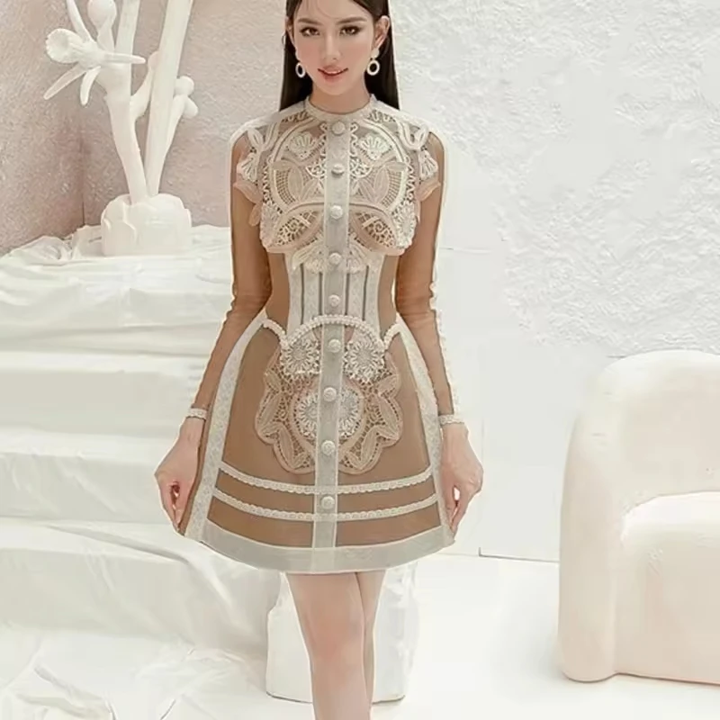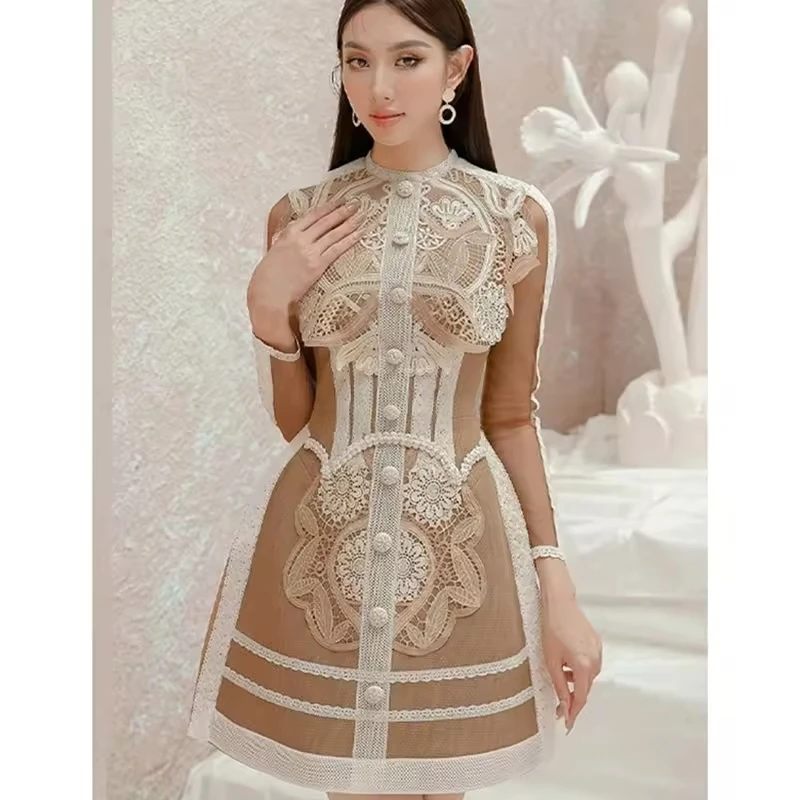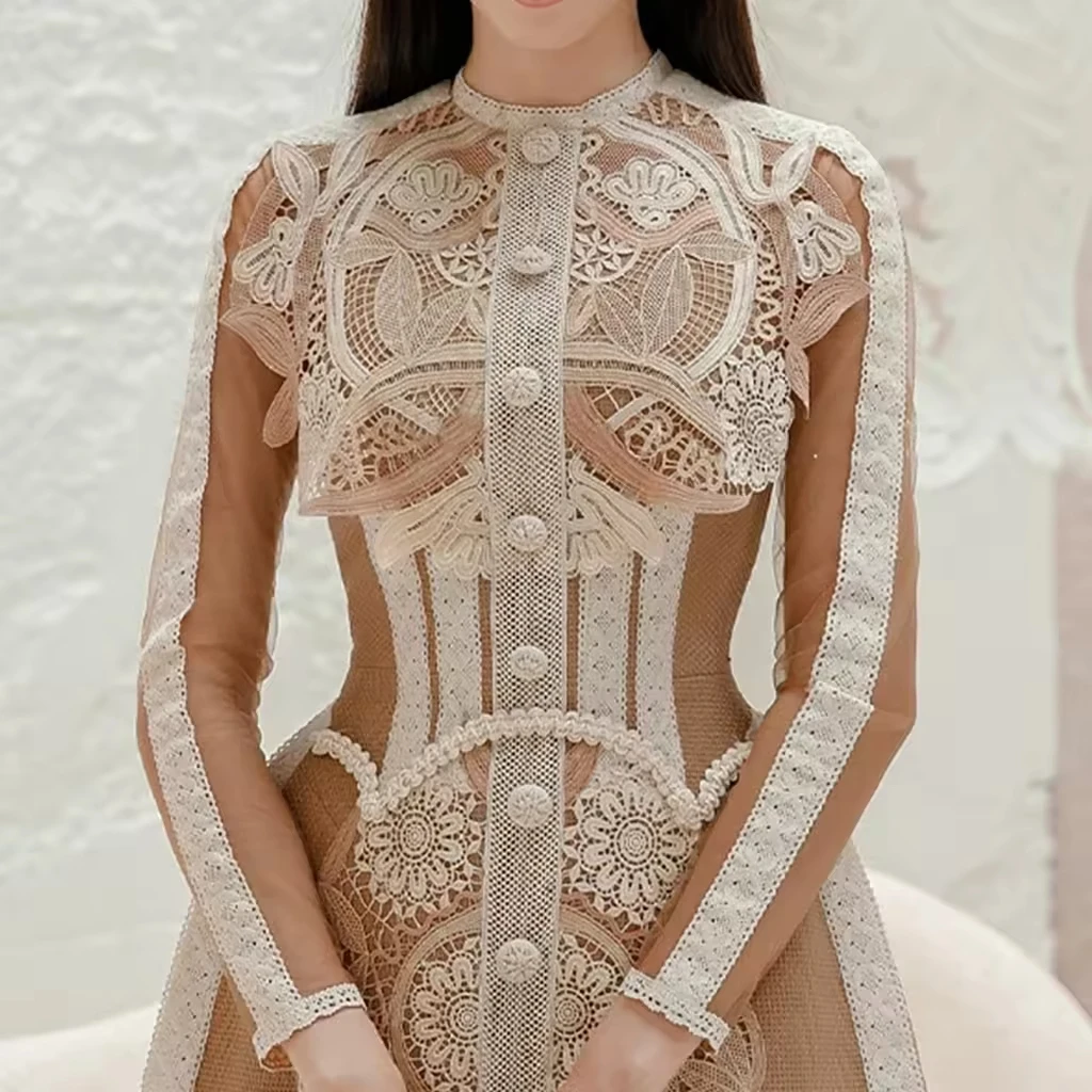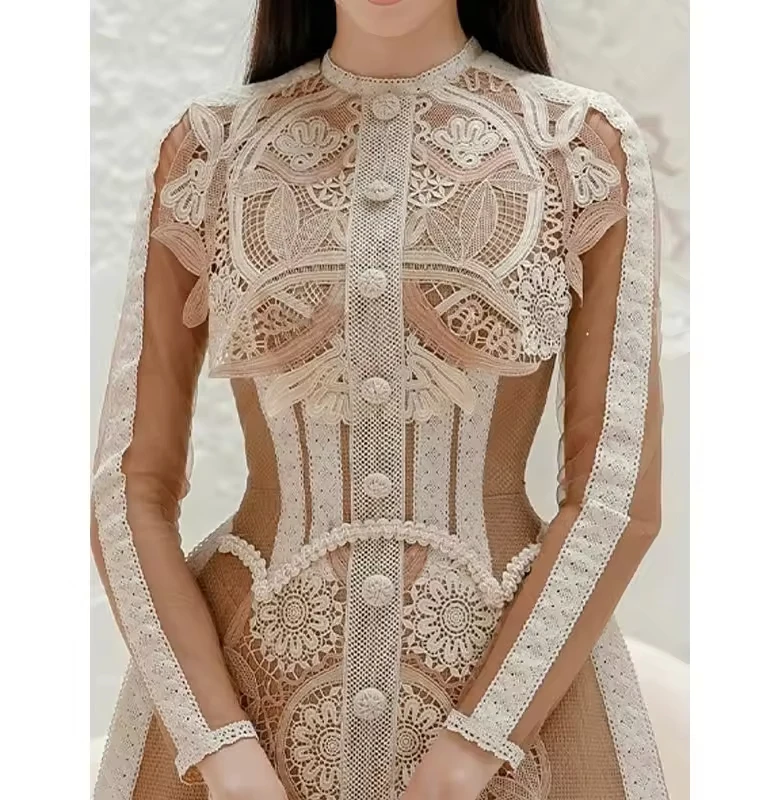 Autumn Elegant Women’s Water Soluble Lace Dress New Long Sleeve Floor-Length Empire Waistline Solid Pattern Zipper Decoration