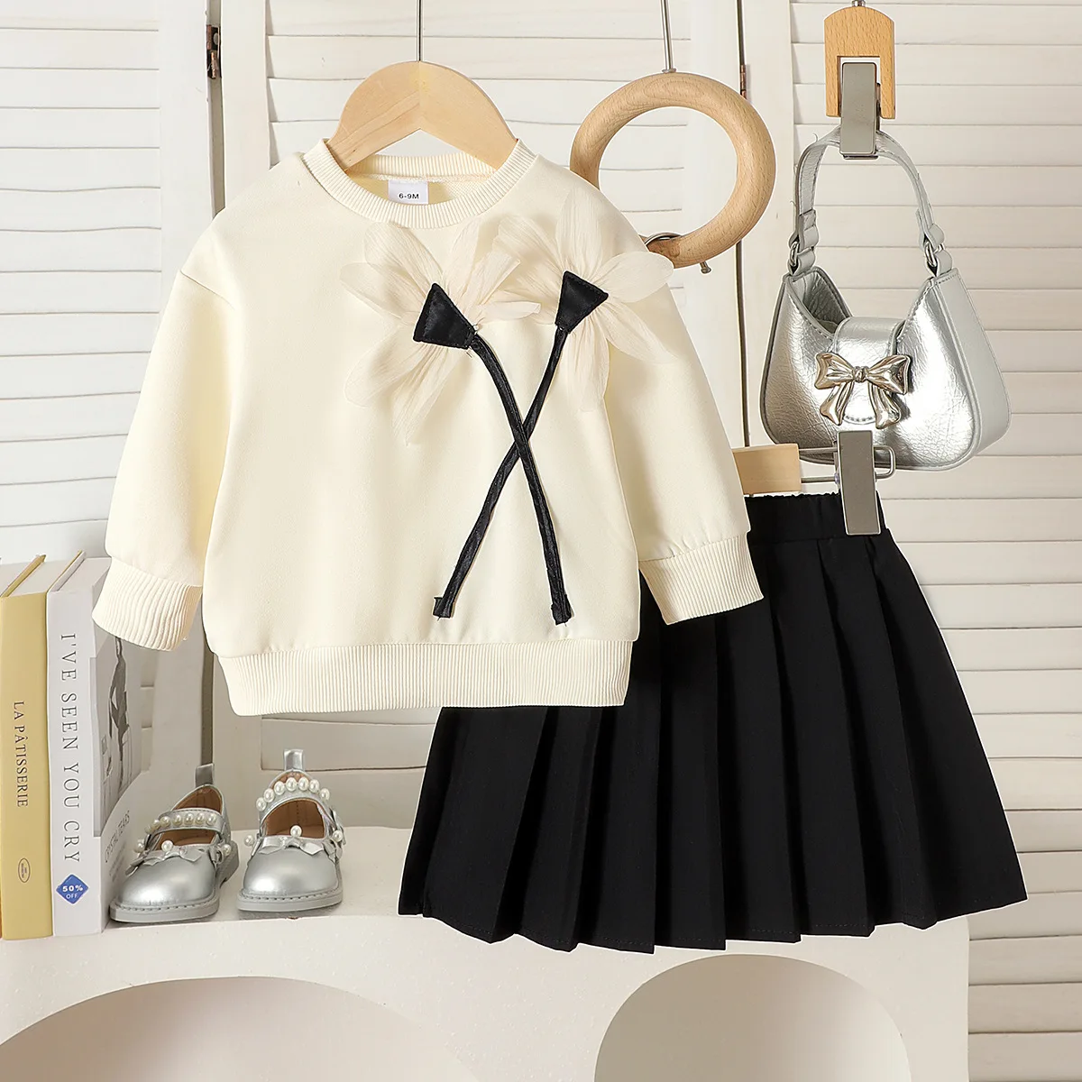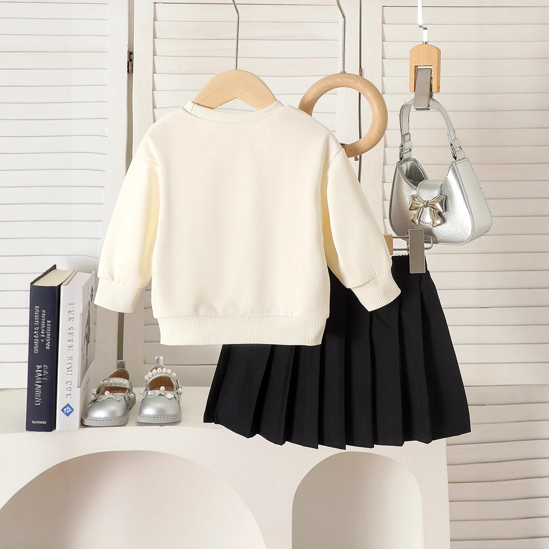 Autumn New Girls Suit Flower Paid Long-sleeved Sweat Pleated Skirt Two-piece Set