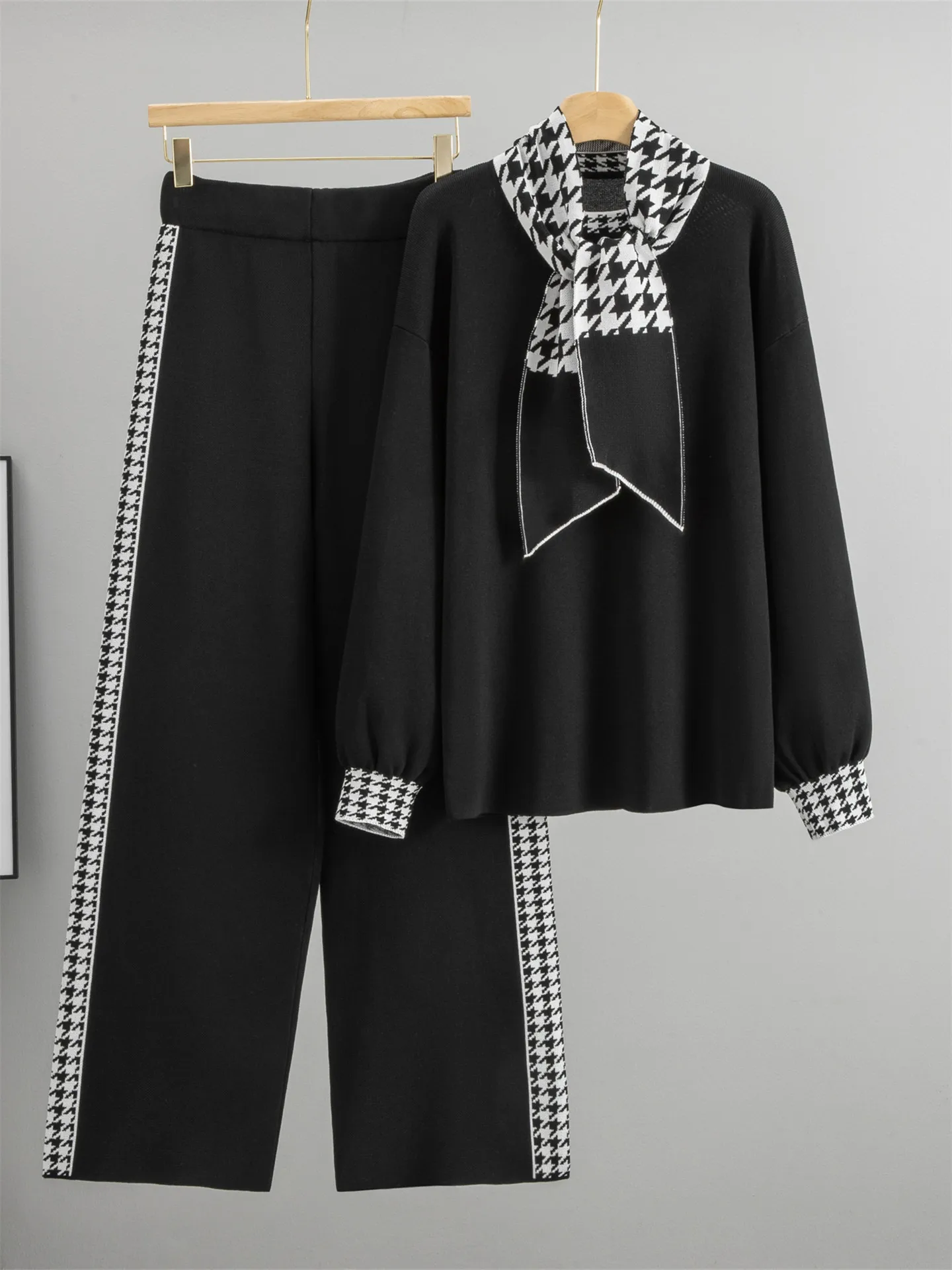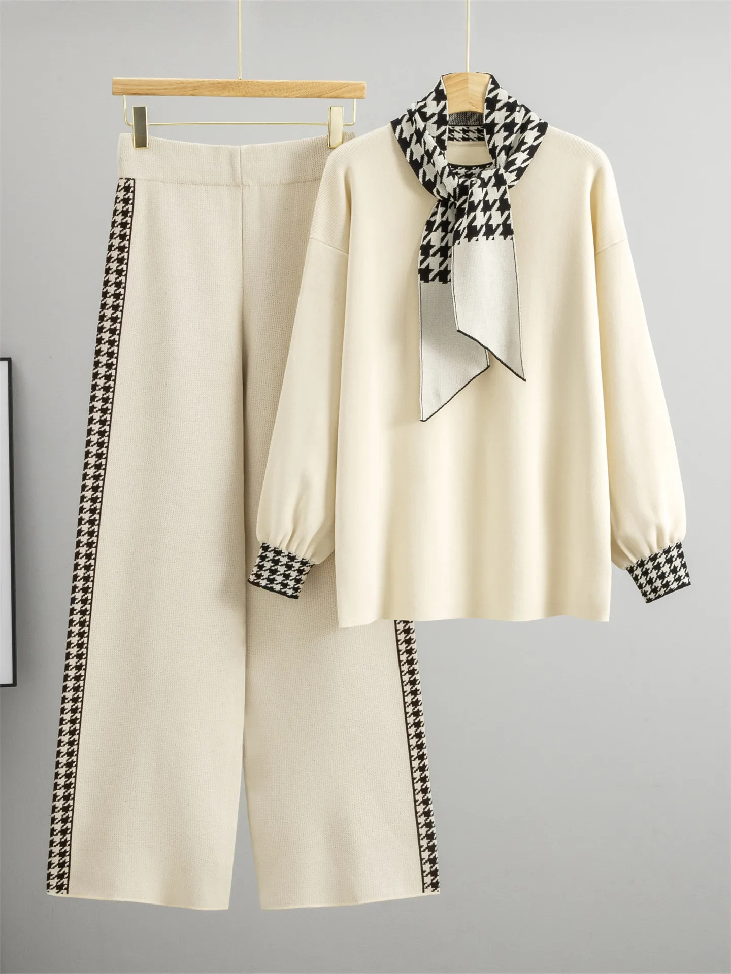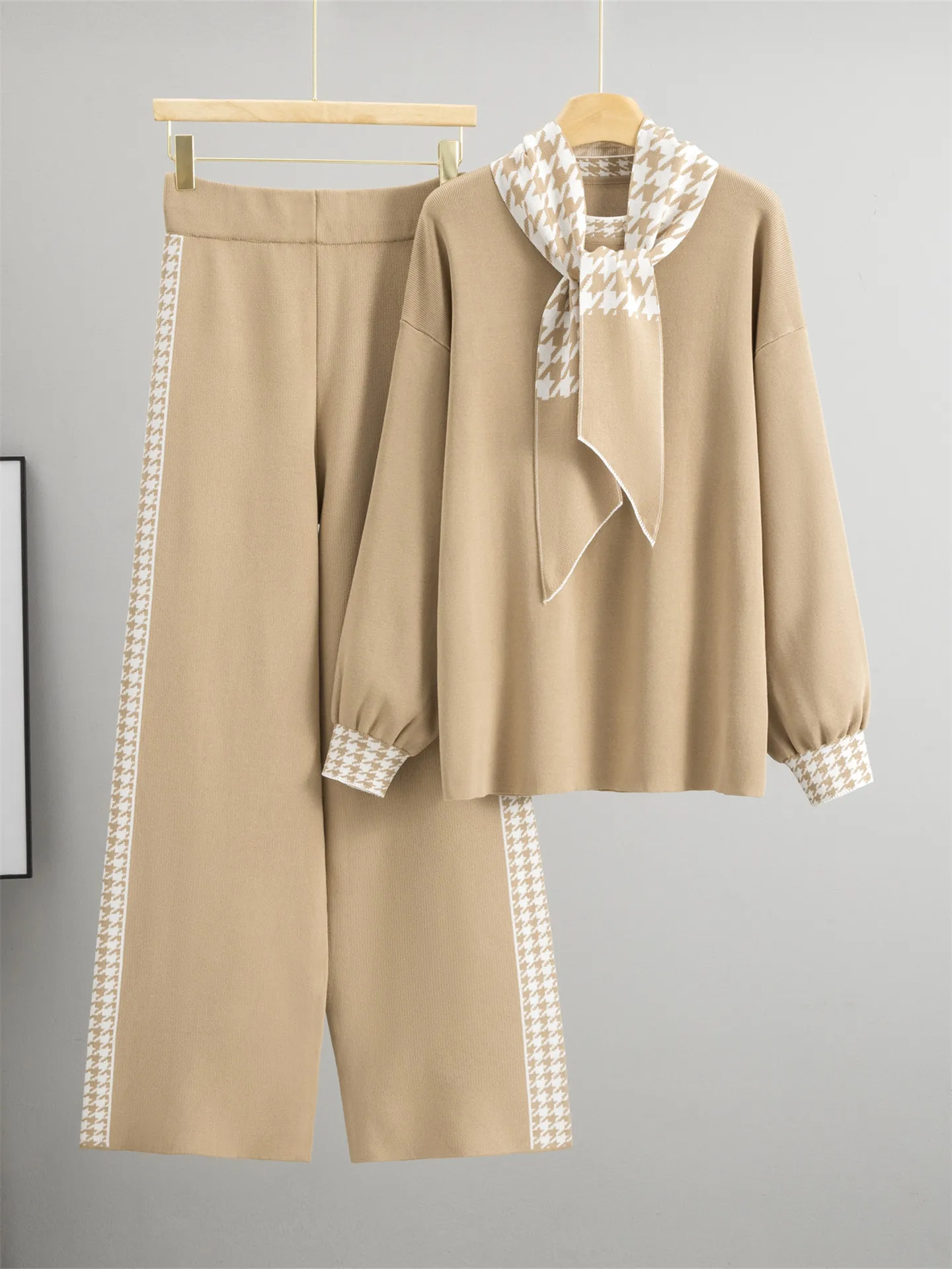 Autumn New Women’s Elegant Three-Piece Sweater Set Cross-Border Fashion Solid Knitted Casual Loose Sweater Wide Leg Pants Scarf