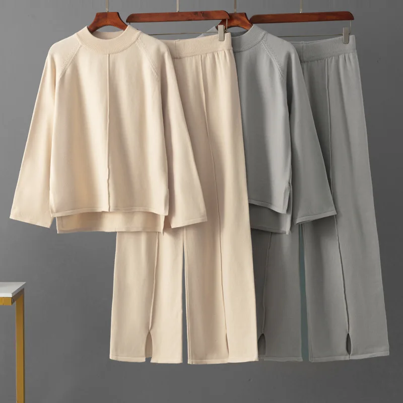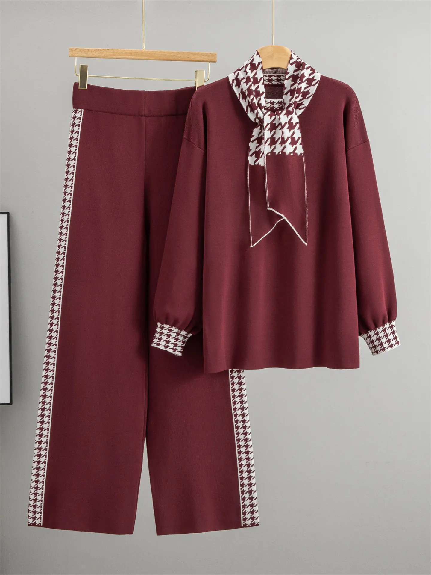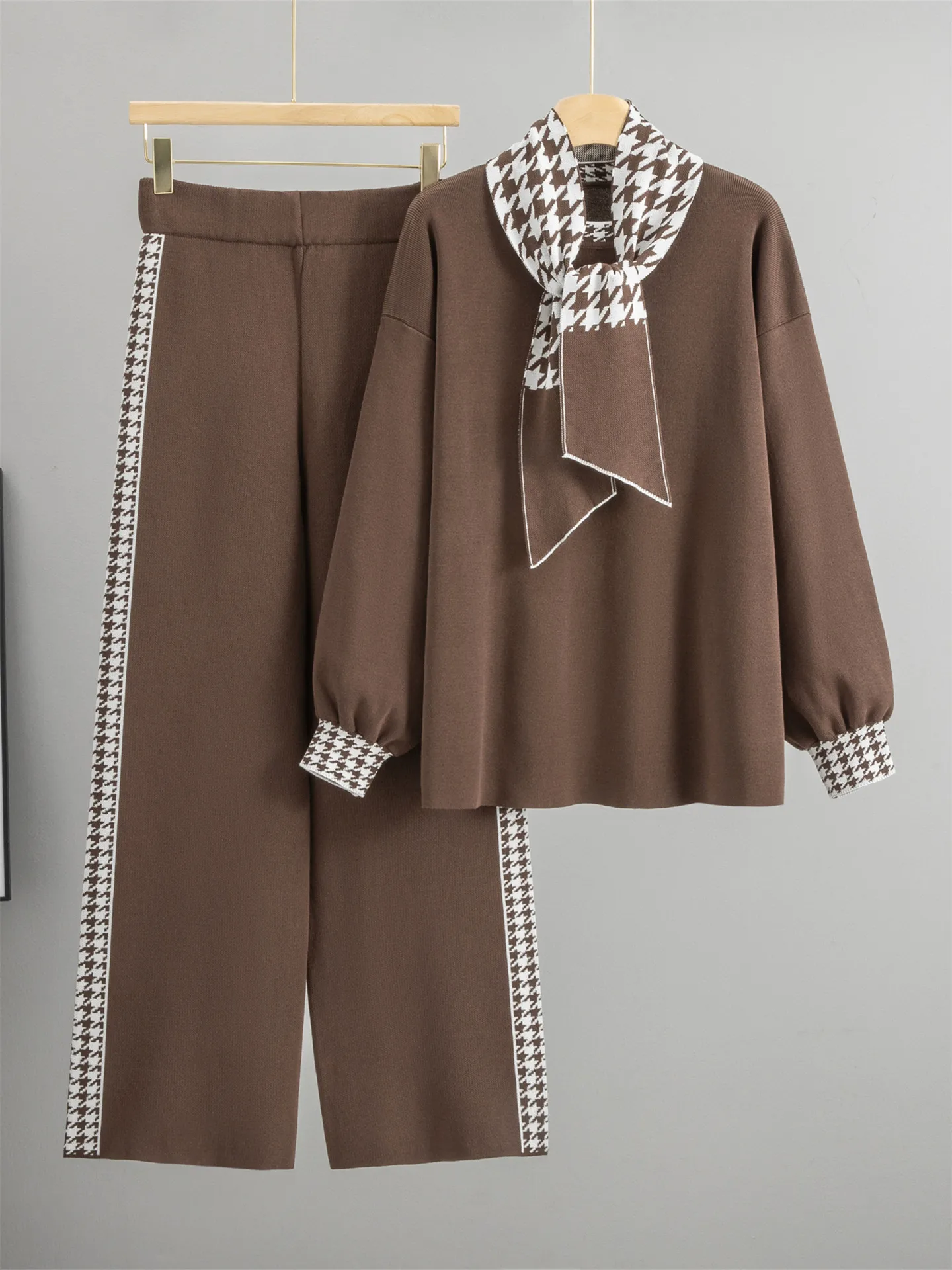 Autumn New Women’s Elegant Three-Piece Sweater Set Cross-Border Fashion Solid Knitted Casual Loose Sweater Wide Leg Pants Scarf