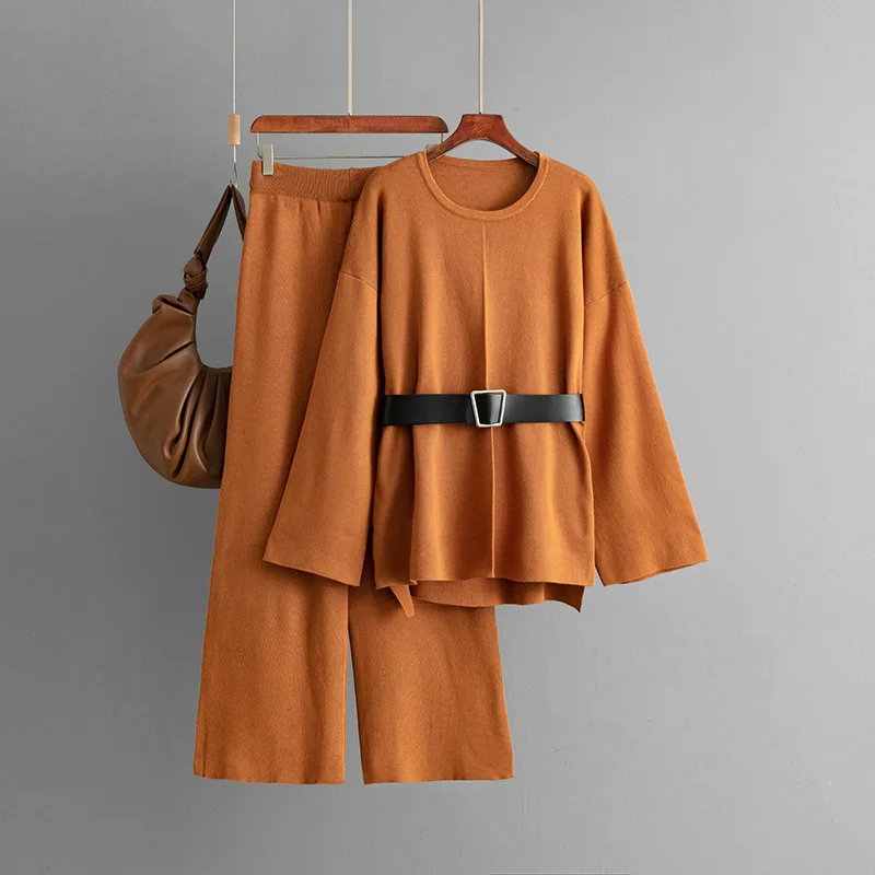 Autumn Winter Fashion Women’s Knit Belted Top & High Waist Wide Leg Pants Two-Piece Set