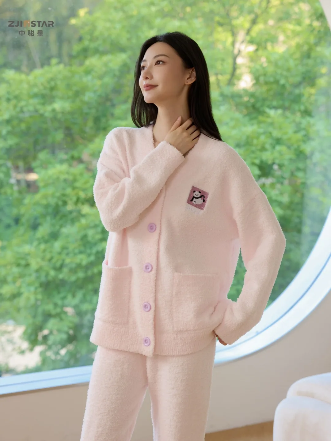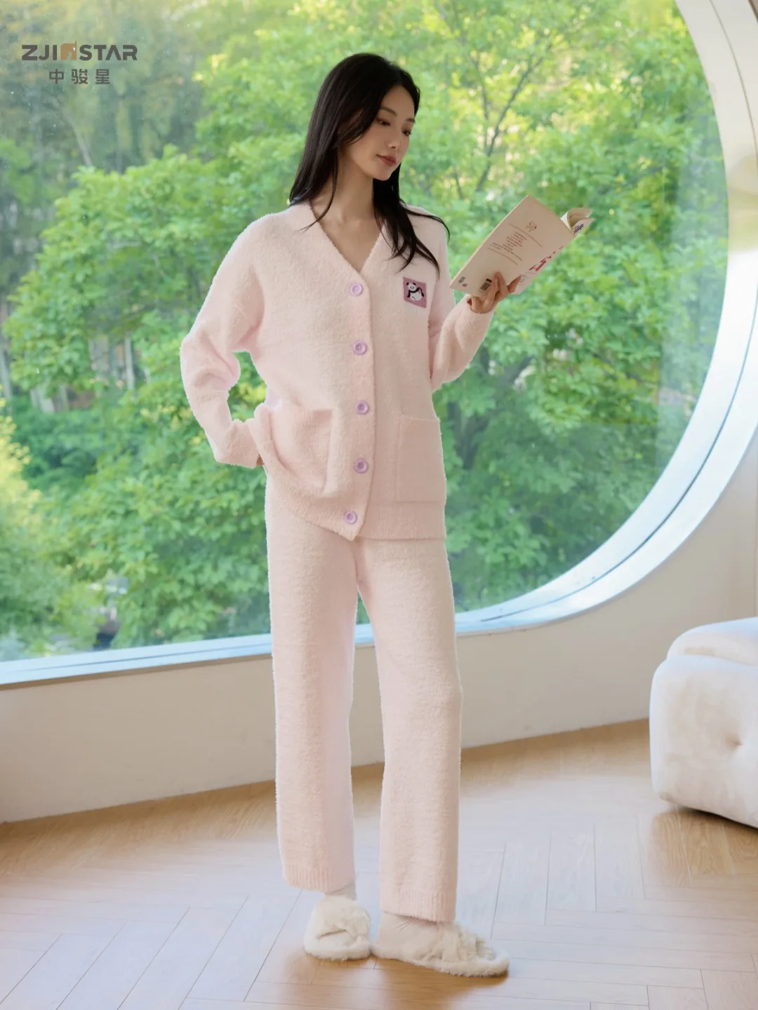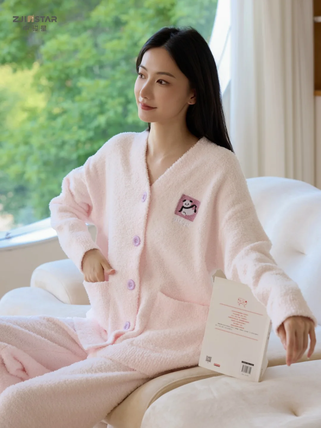 Autumn Winter Ladies Half Velvet Home Suit Soft Pattern Panda Elastic Waist Breathable Thermal Knitted Cardigan Pants 2pcs