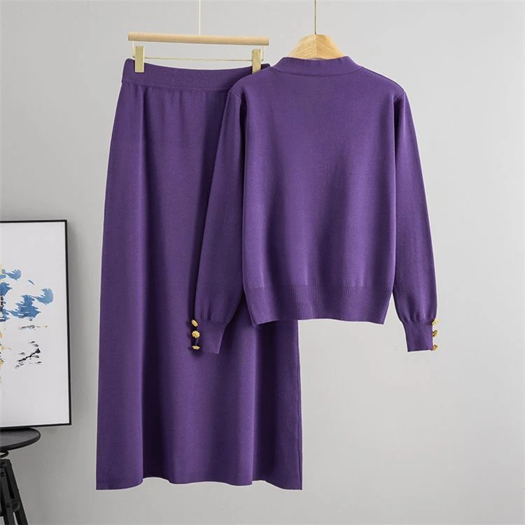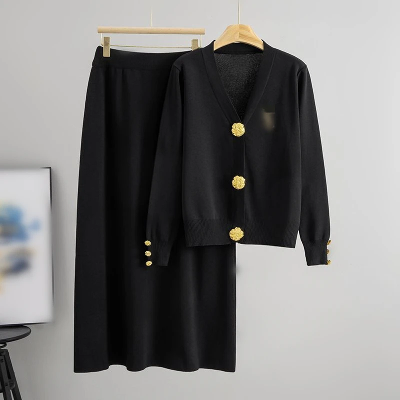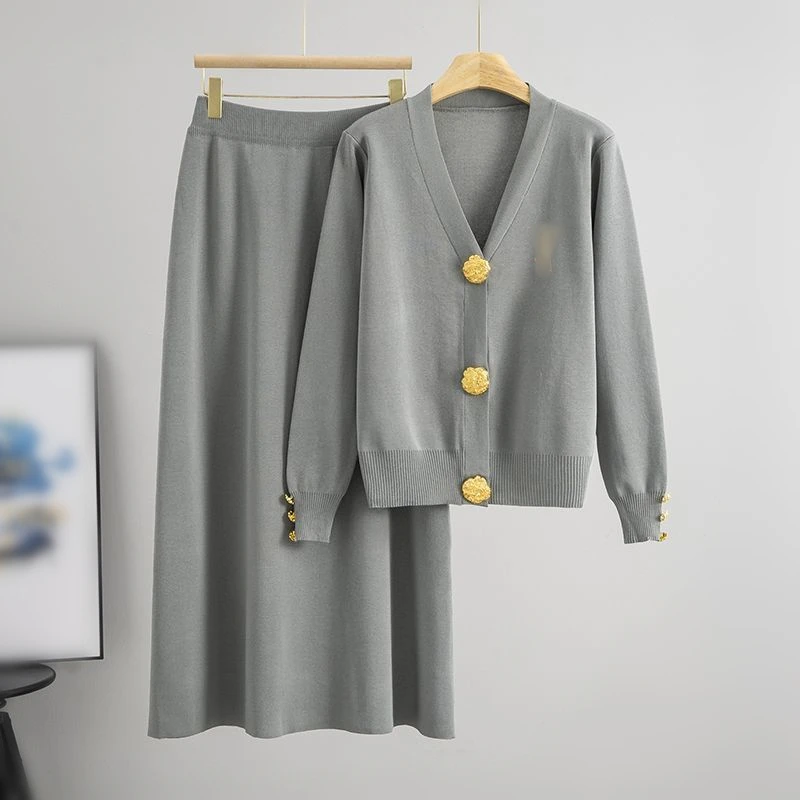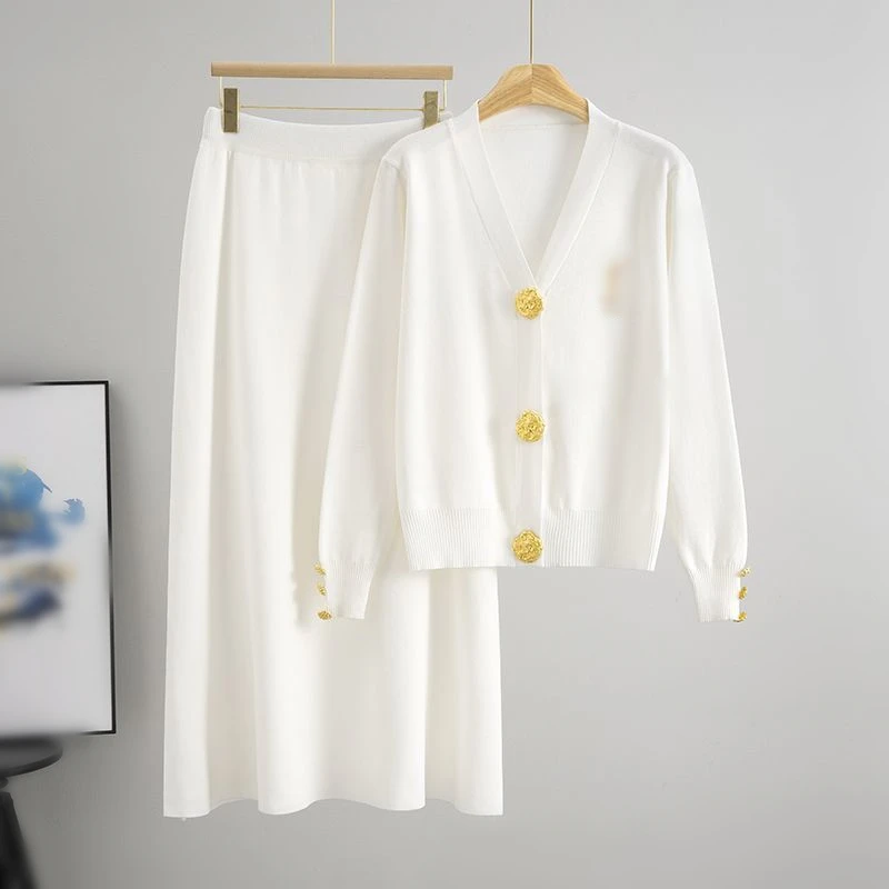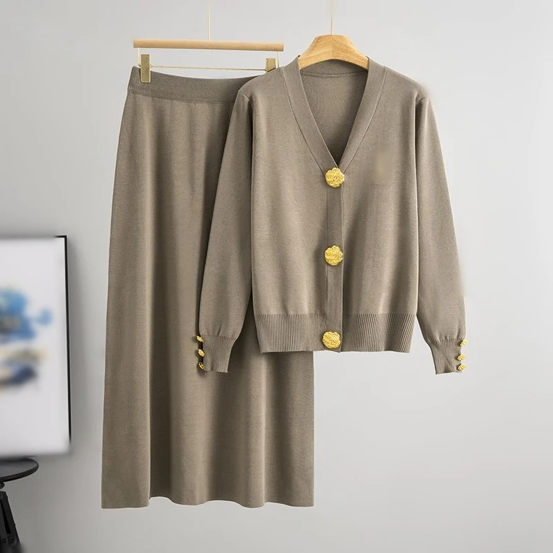 Autumn Winter Women’s Casual Two-Piece Set V-Neck Cardigan Wide Leg Pants Knitted Weaving Button Decoration Solid Breathable