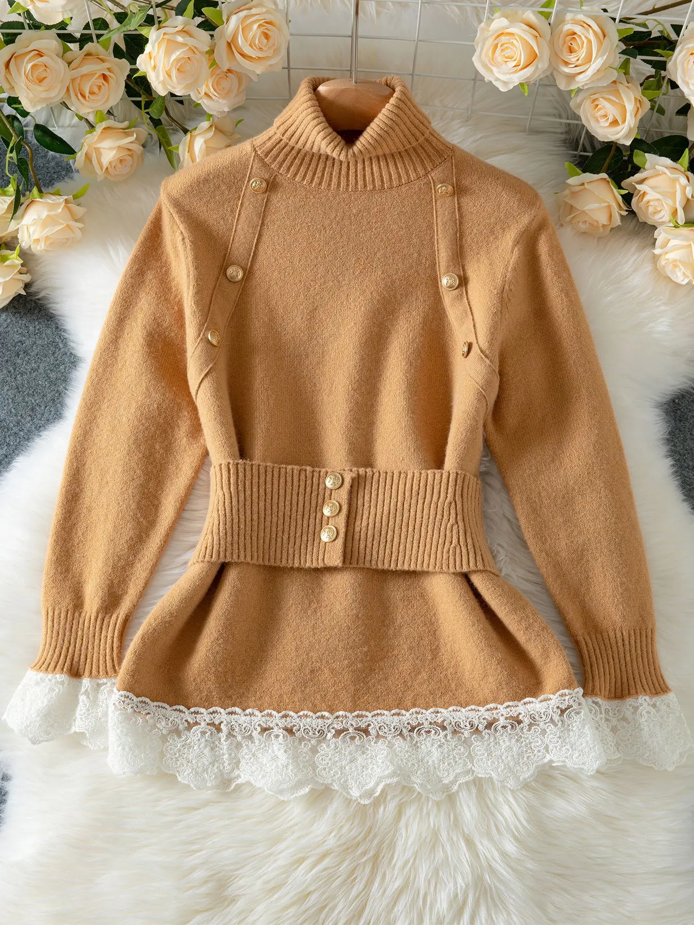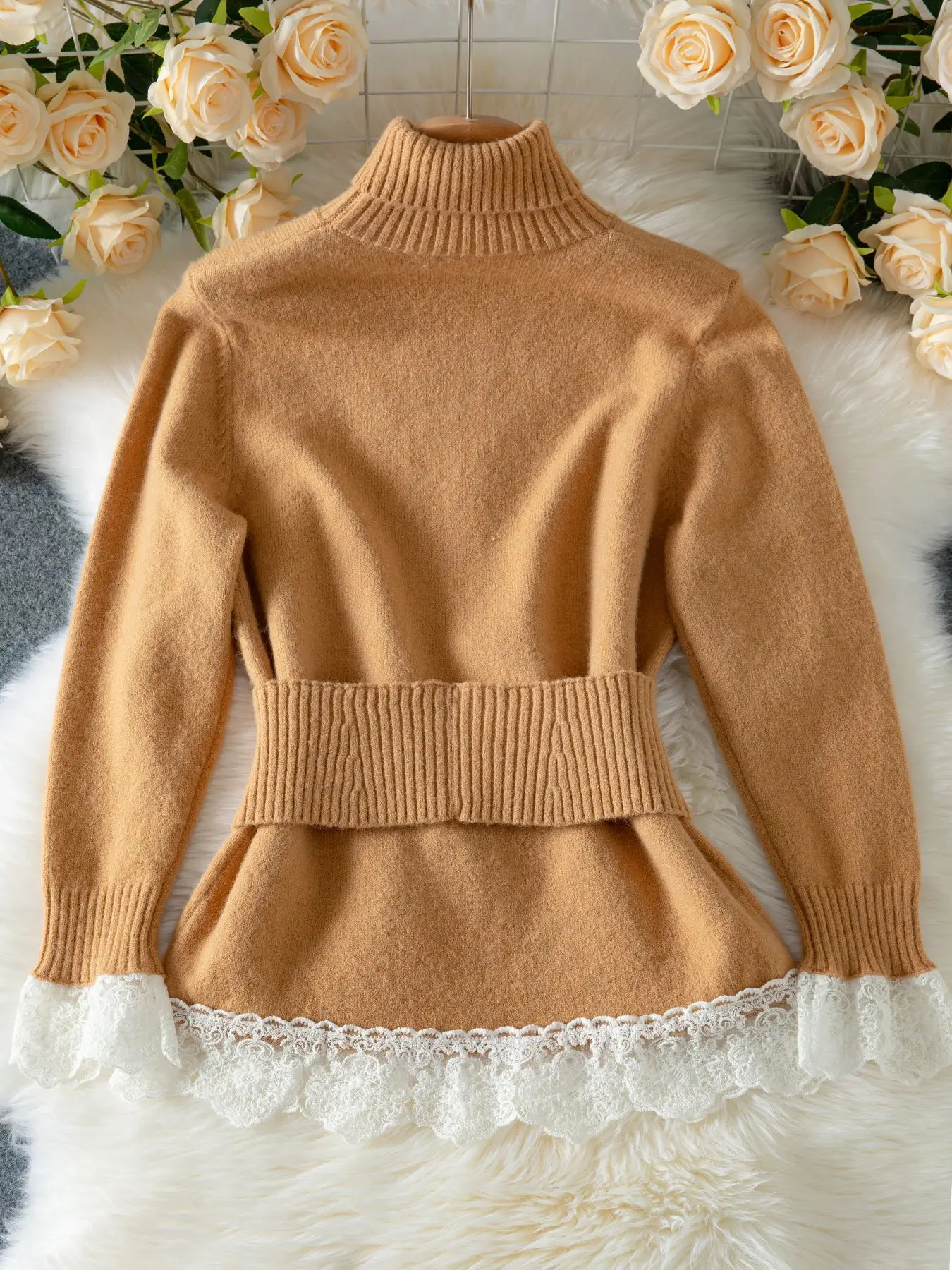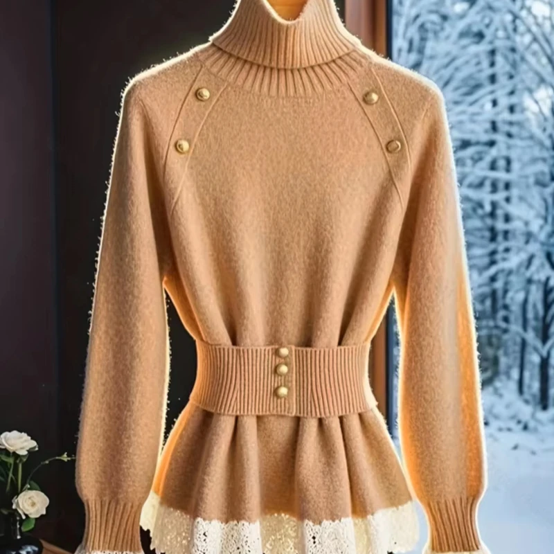 Autumn Winter Women’s Elegant Lace Stitching Belt Sweater New Fashion Knitted Sweater Warm Lapel Top Skinny Fit
