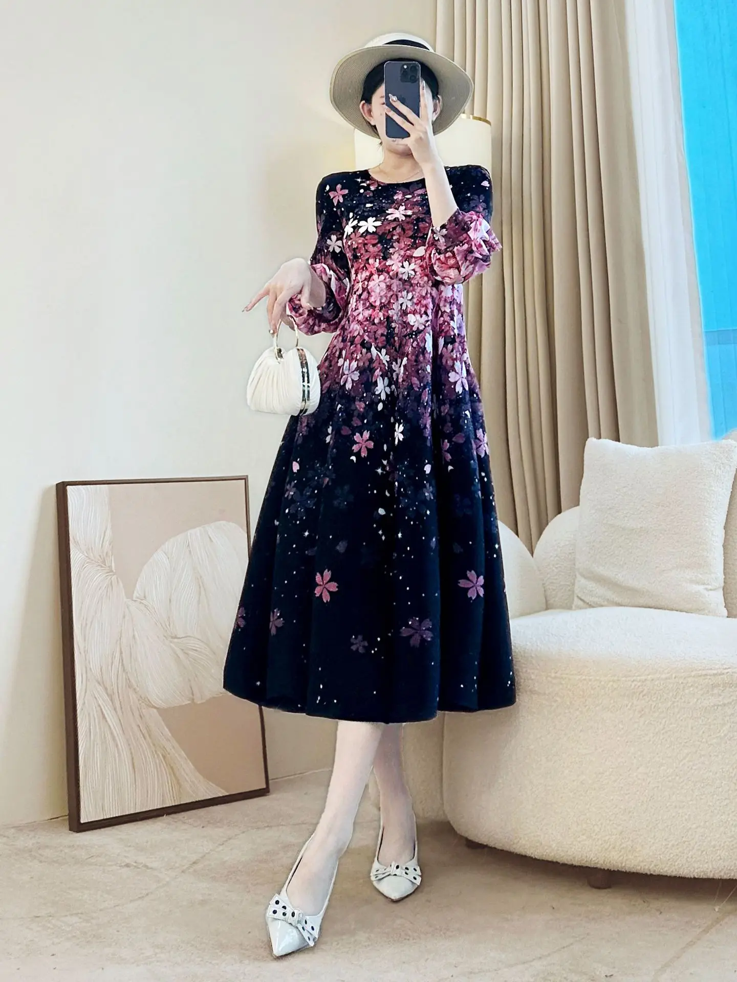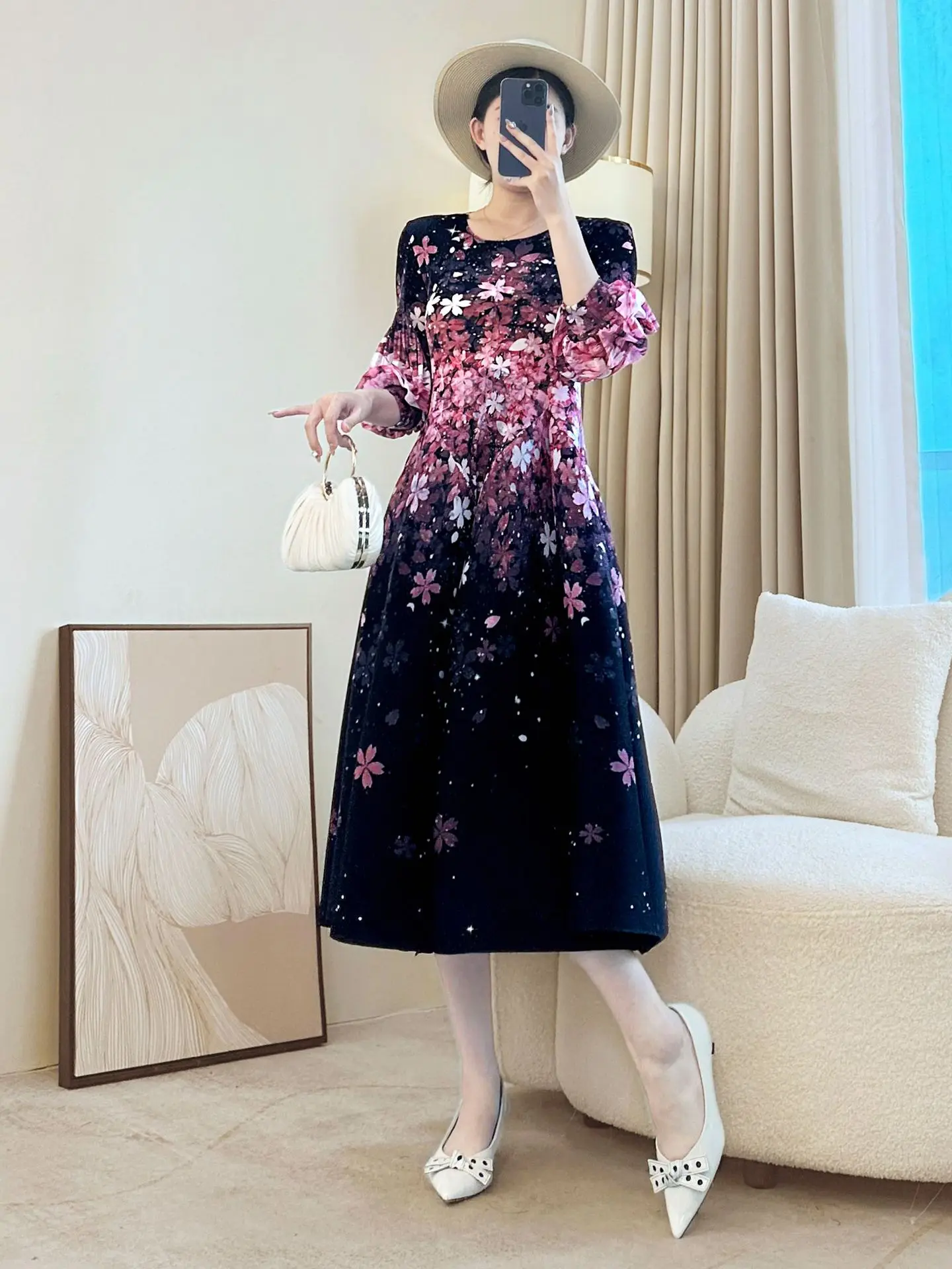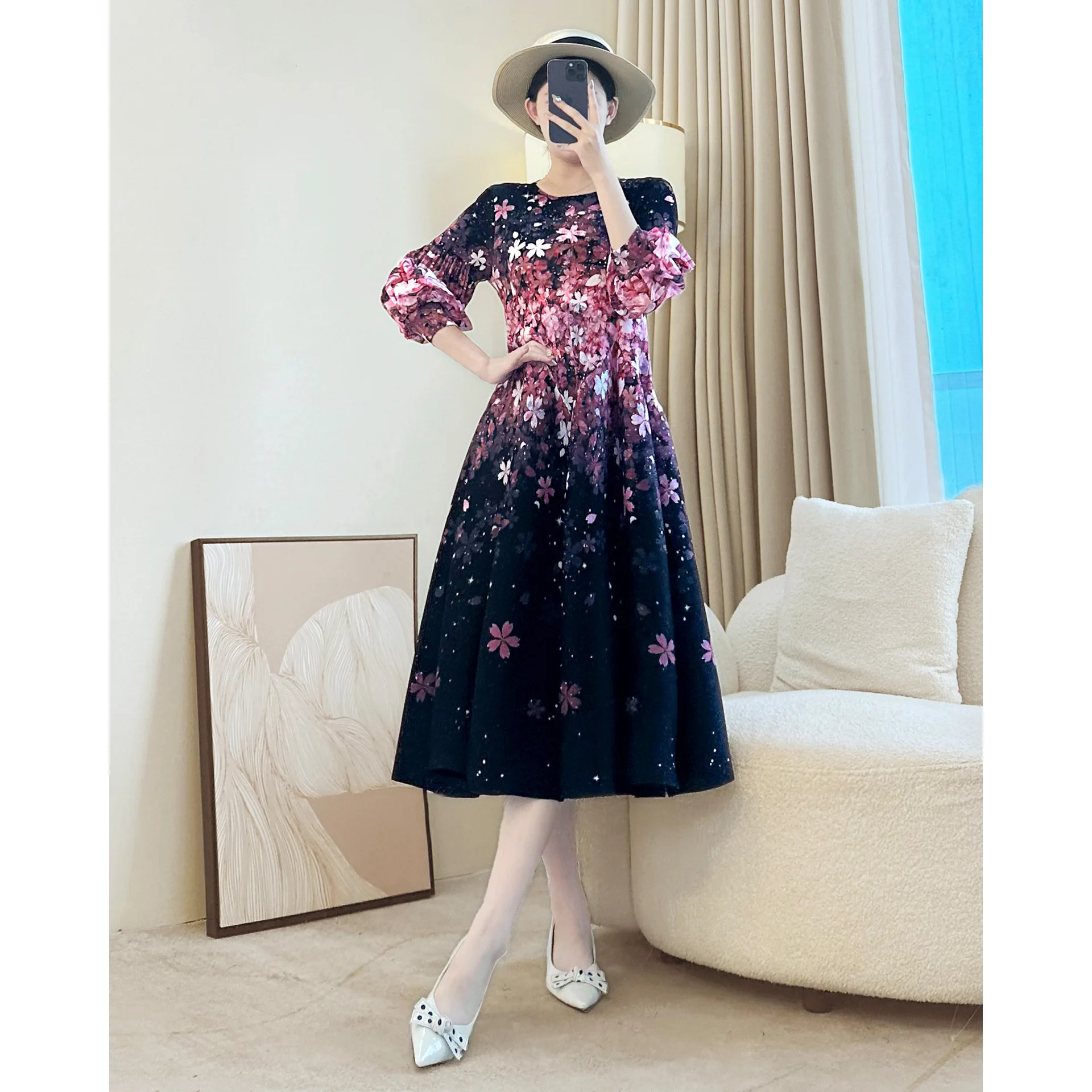 Autumn Women’s New Loose Floral Print Skirt Generation Foreign-Style Age-Reducing Black Flower Bud Mother Dress Casual Style