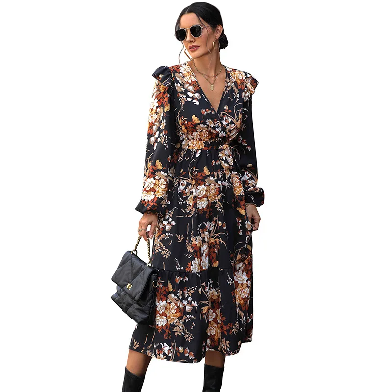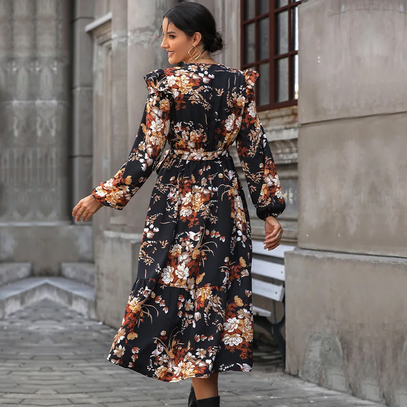 Autumn Women’s V-Neck Floral Print Midi Dress Long Sleeved Casual Polyester Empire Waistline Woven Breathable Digital Printing