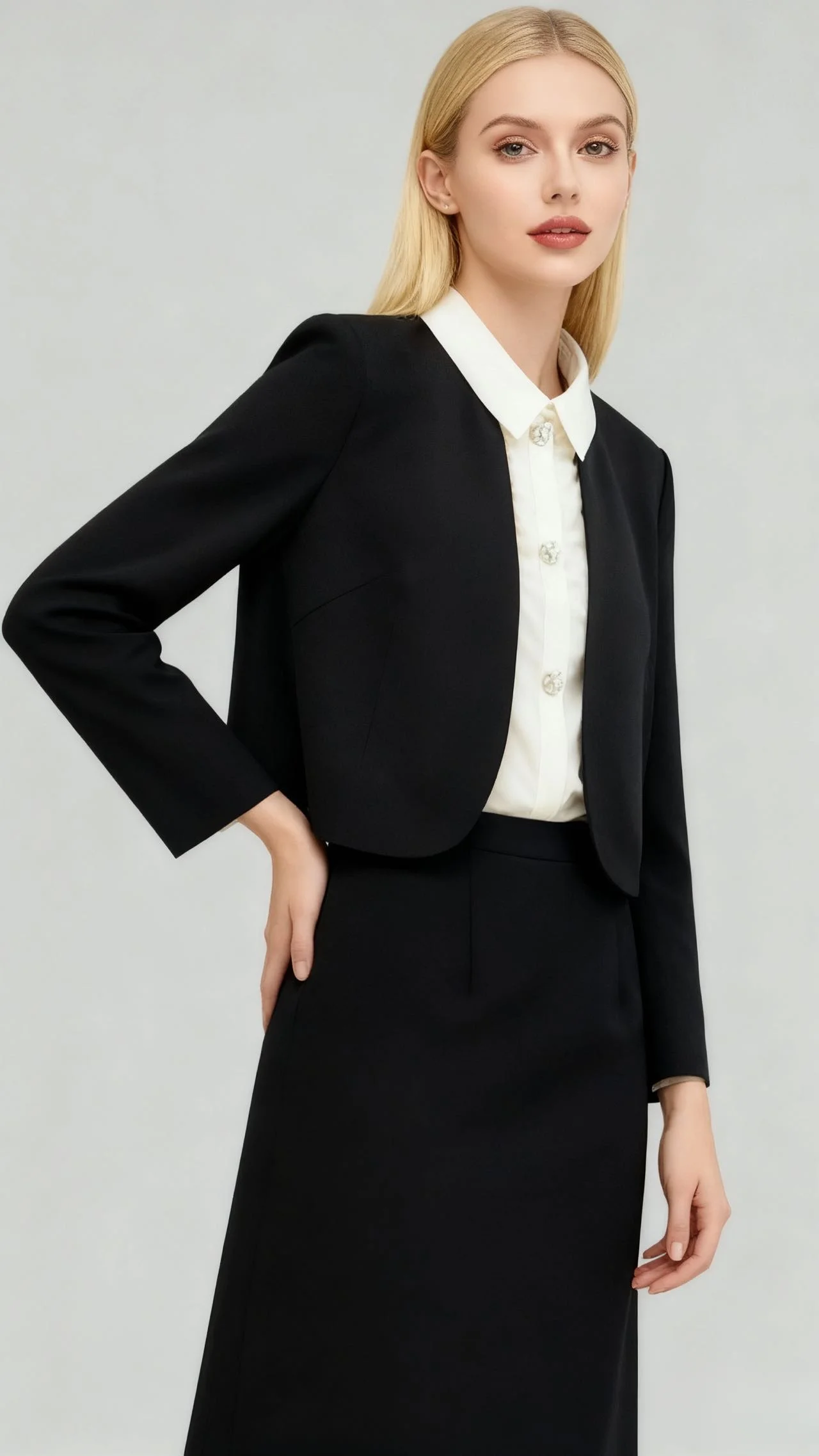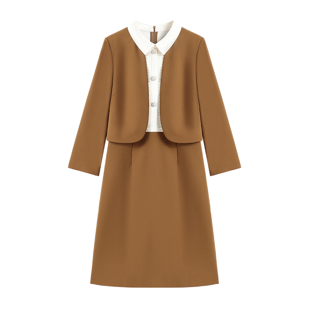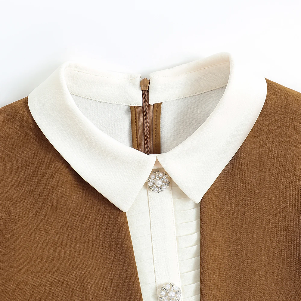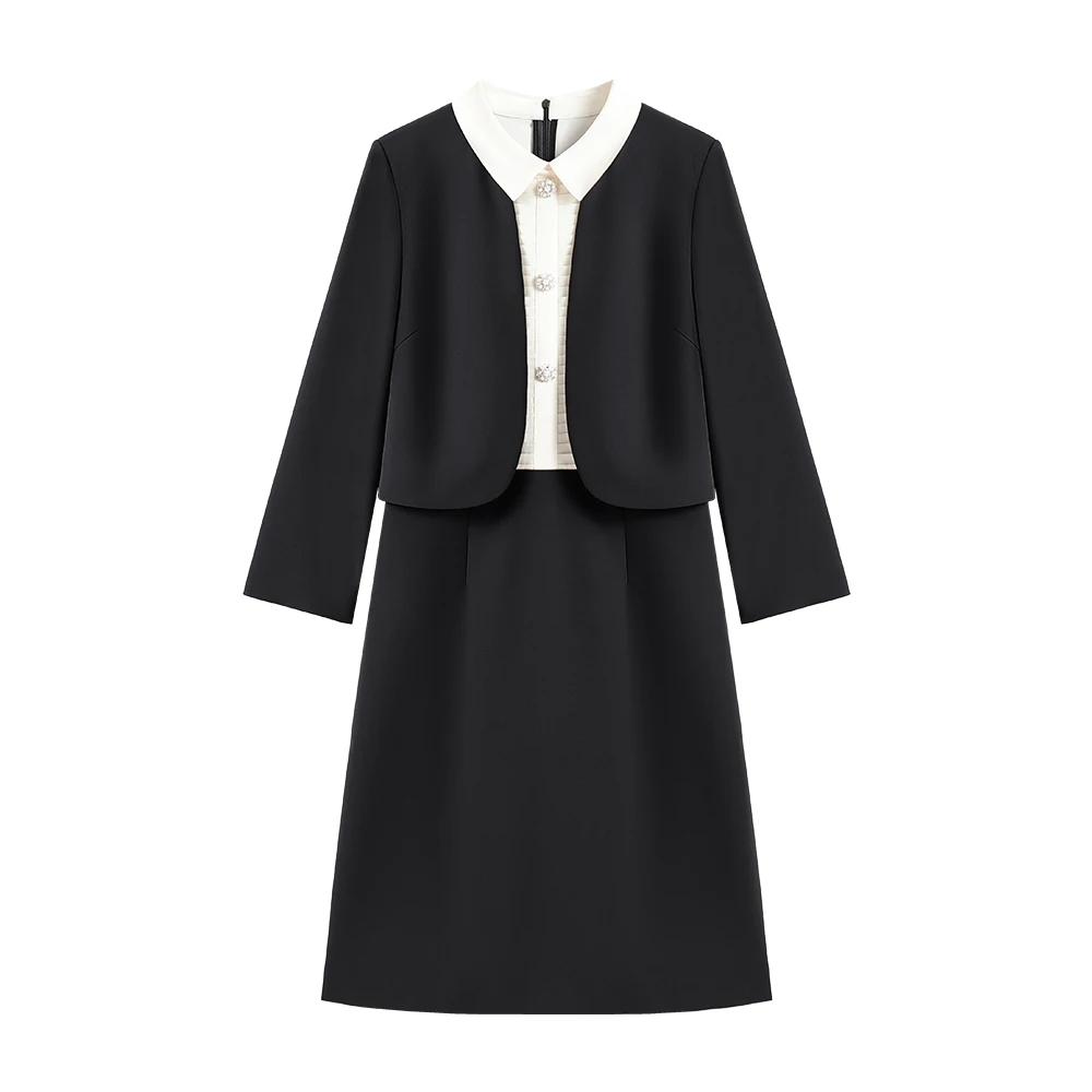 Autumn’s New Elegant Light Luxury Slim Two-Piece Dress Casual Front New Stitching Doll Collar Plain Dyed Anti-Static Button