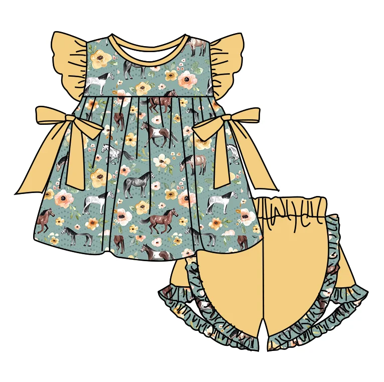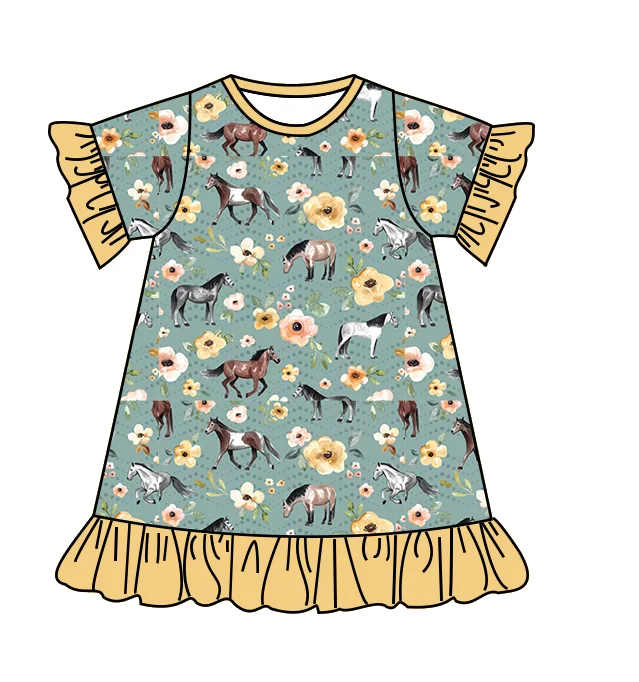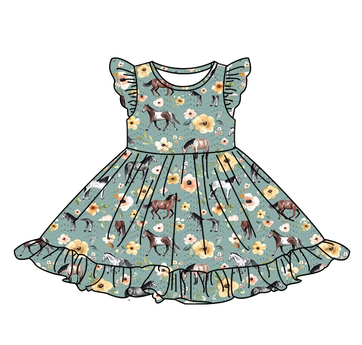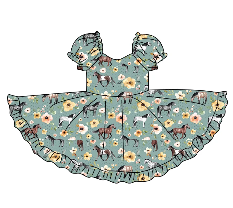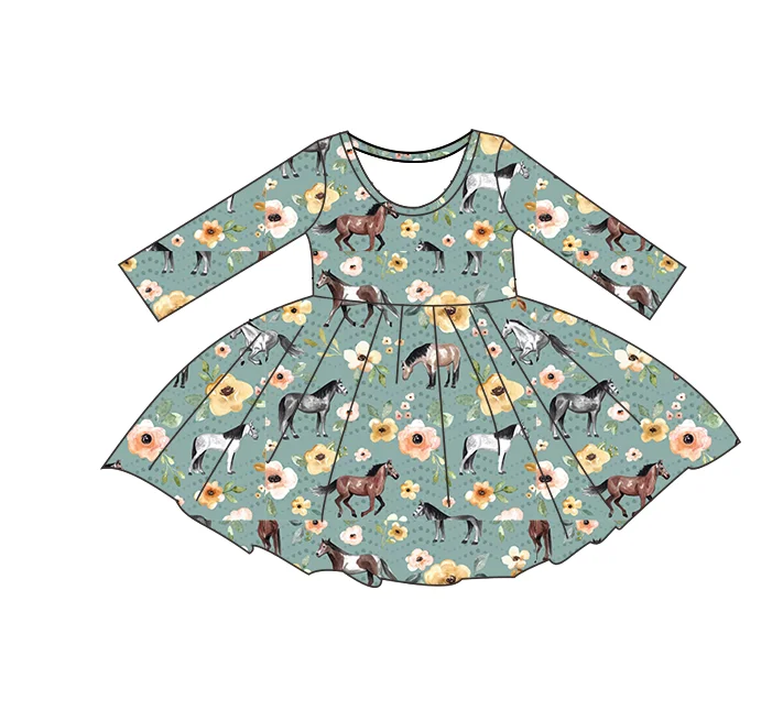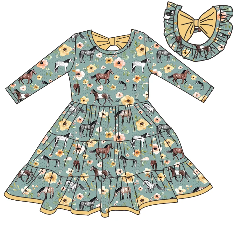 Custom Pattern Style Color Wholesale Girls Clothes Horse Flower Pattern Back Bow Long-sleeved Dress Girls Outfit All Seasons