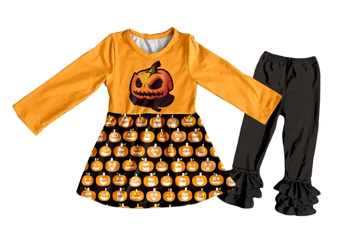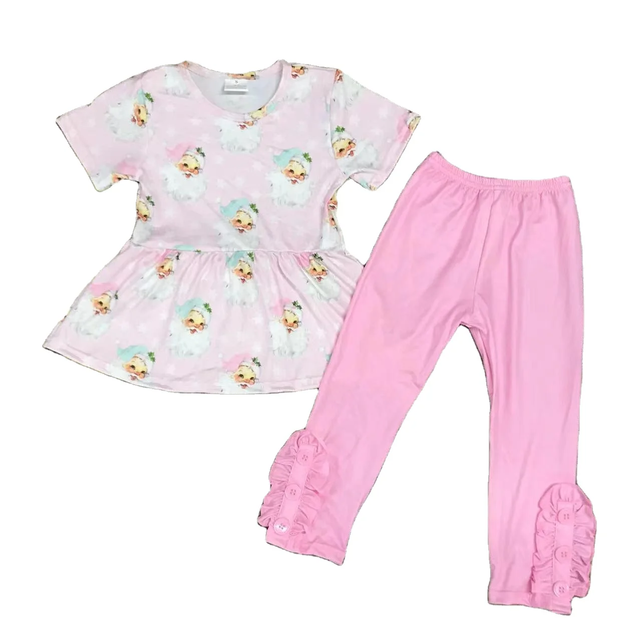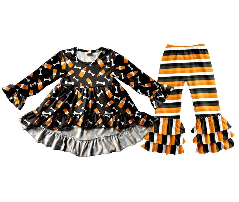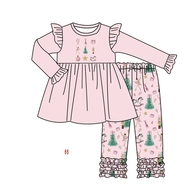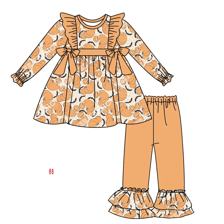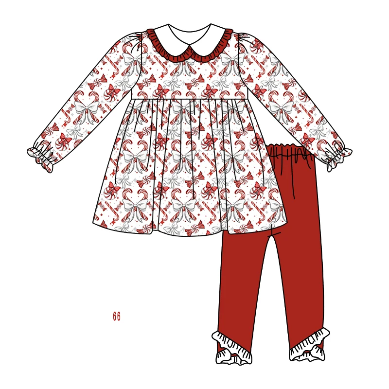Custom Print Pattern Wholesale Girls Clothes Bow Printed Long Sleeve Top and Pants Suit Party Outfits 2pcs Autumn Winter Wear