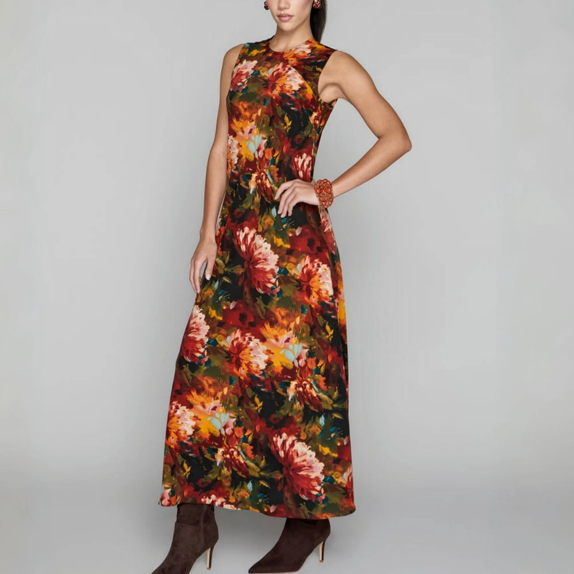 Dusk Flora Printing High Neckline Woman Dress Fashion Elegant Vintage Maxi Length Dresses Sleeveless Clothing For Party