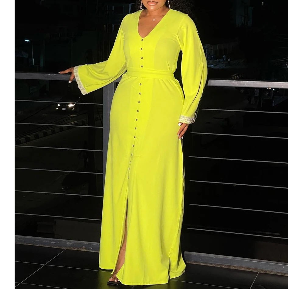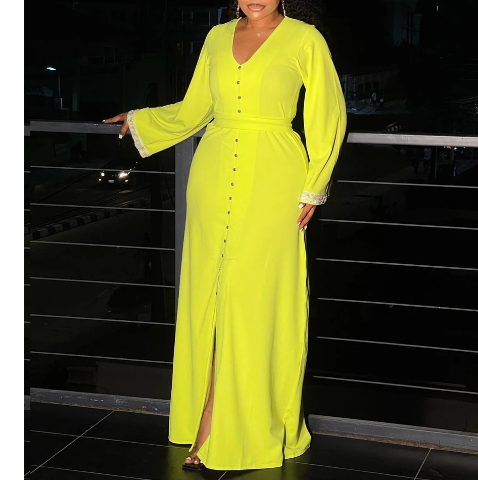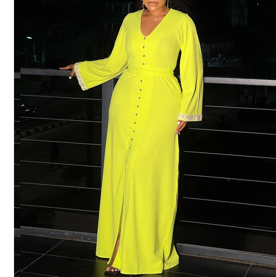 Elegant Woman Dress Casual-Formal-Sweet-Party Breathable V-Neck Floor-Length Lace Decorated Solid Autumn S Pleated Sexy