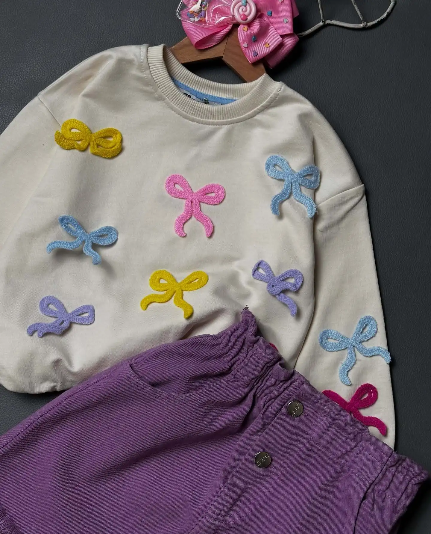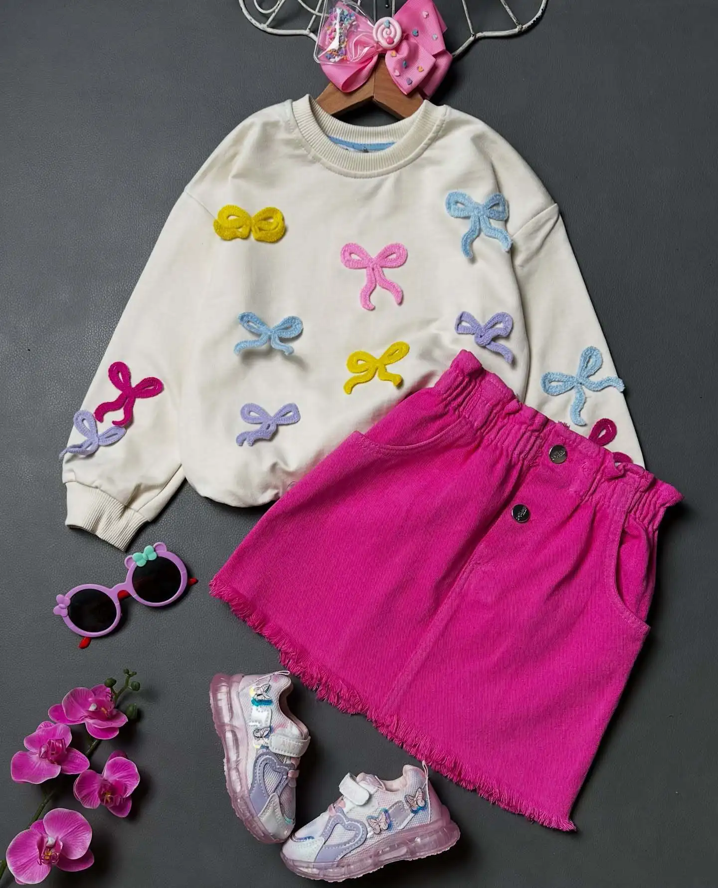 European American Trendy Girls’ Casual Outfit Sets Spring Autumn Round Neck Long Sleeve Top Bows Skirt Girls Clothing Set