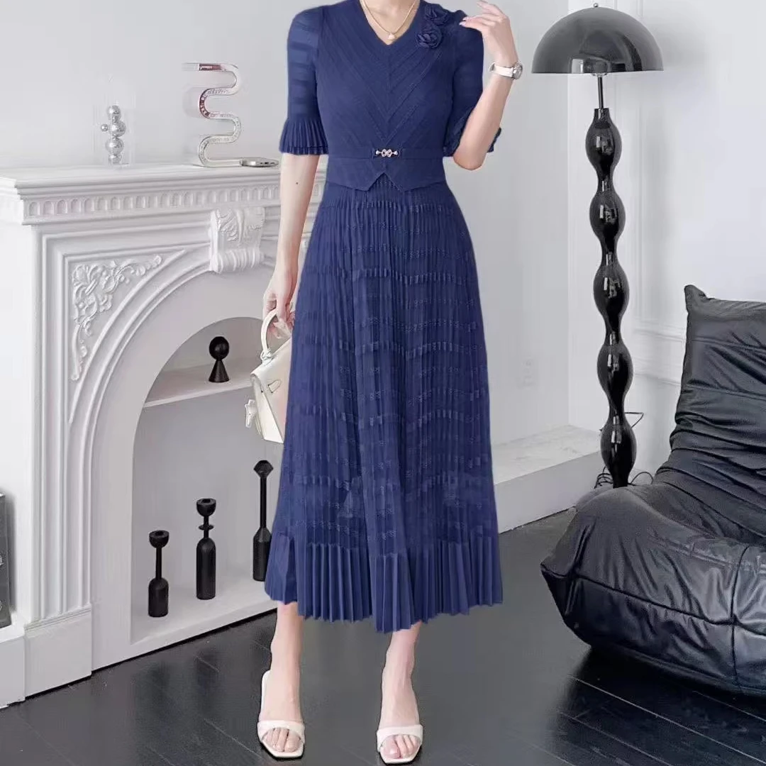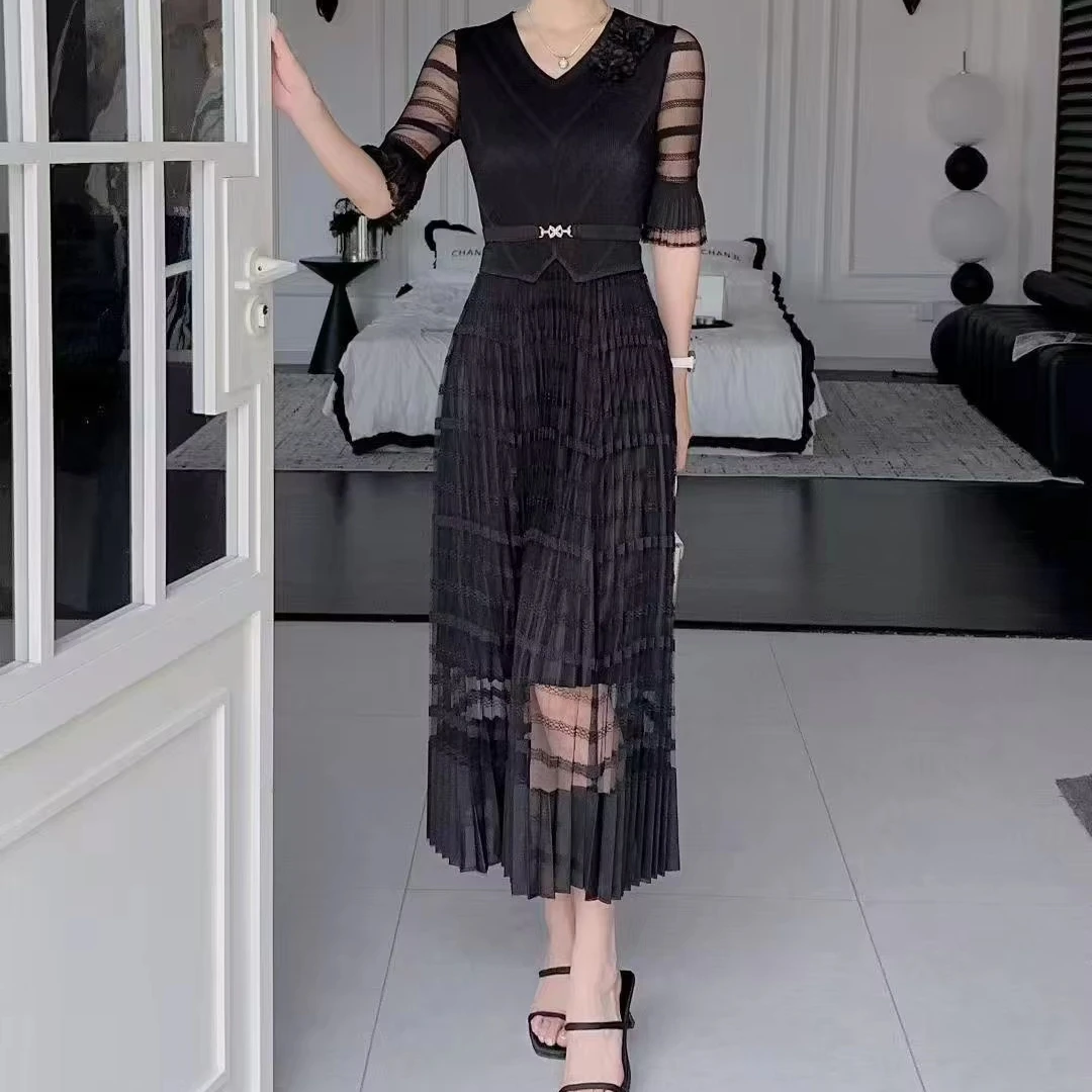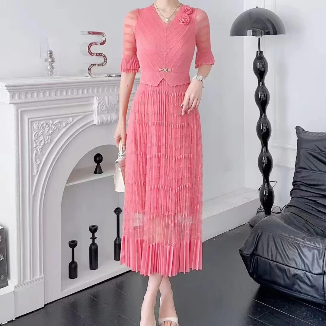 Factory Direct Supply 2025 Autumn New Women’s Casual Dress V-Neck Three-Dimensional Flower Lace Mesh Sleeve Pleated Midi Natural
