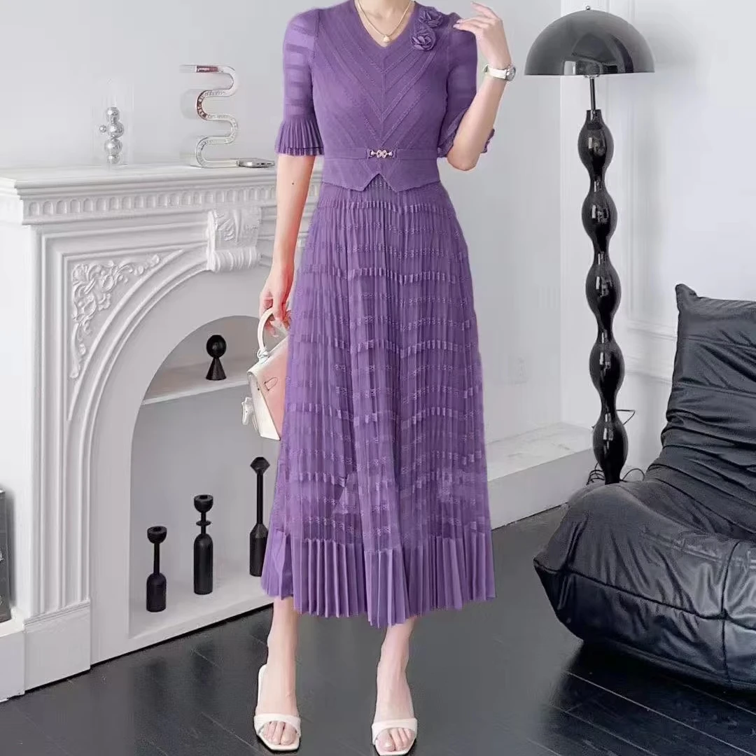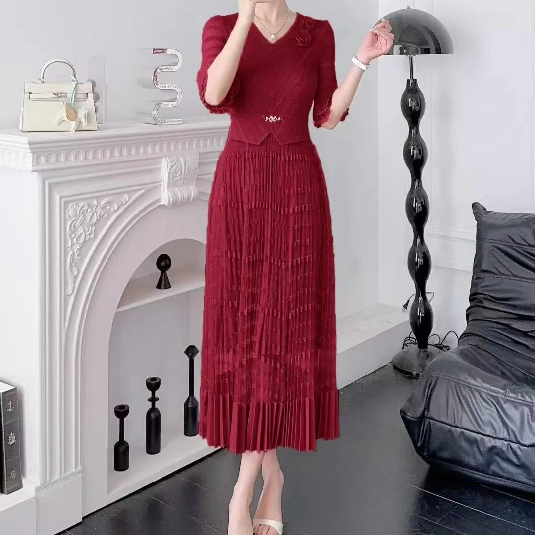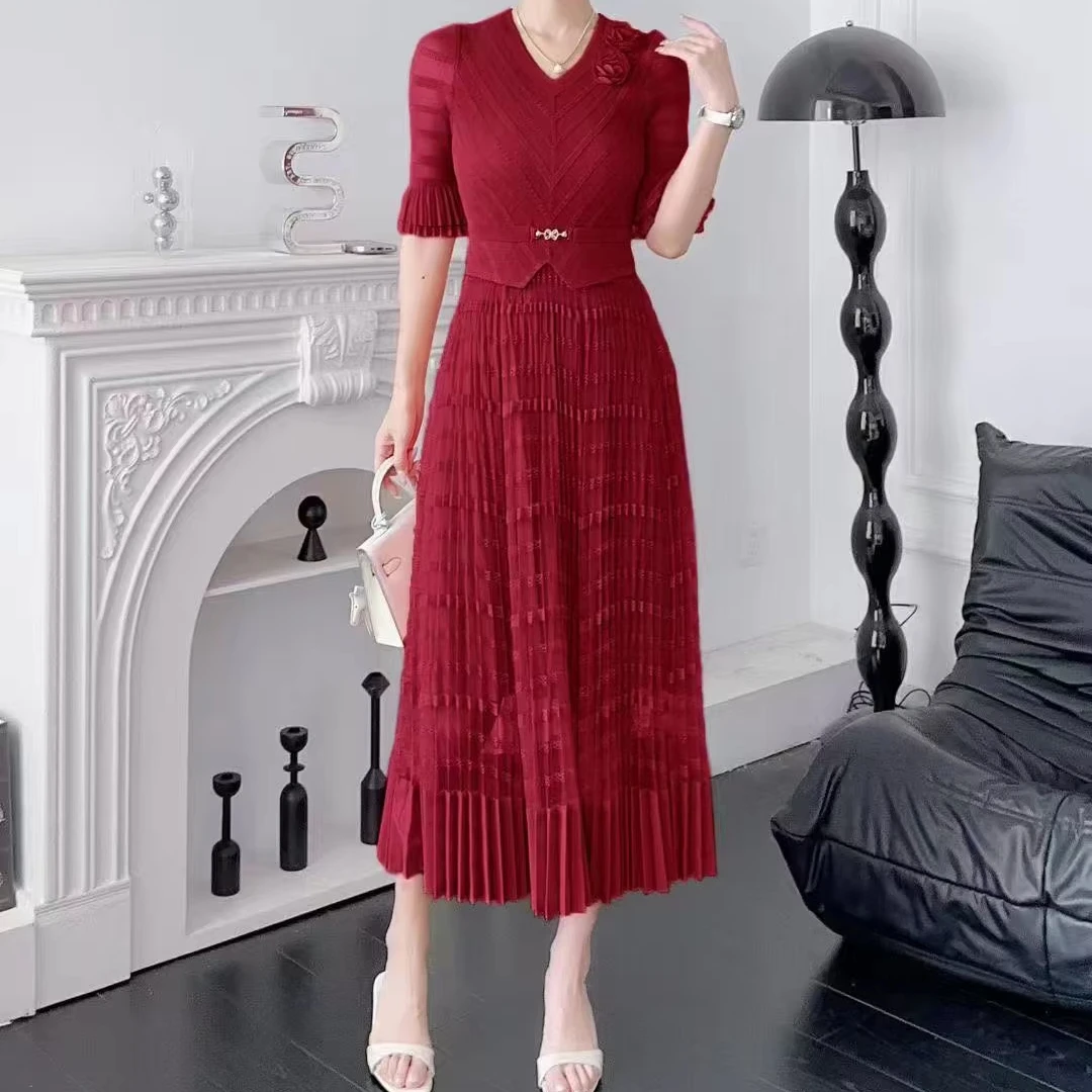 Factory Direct Supply 2025 Autumn New Women’s Casual Dress V-Neck Three-Dimensional Flower Lace Mesh Sleeve Pleated Midi Natural