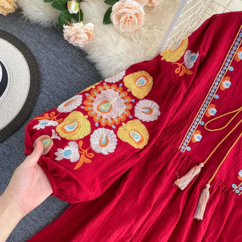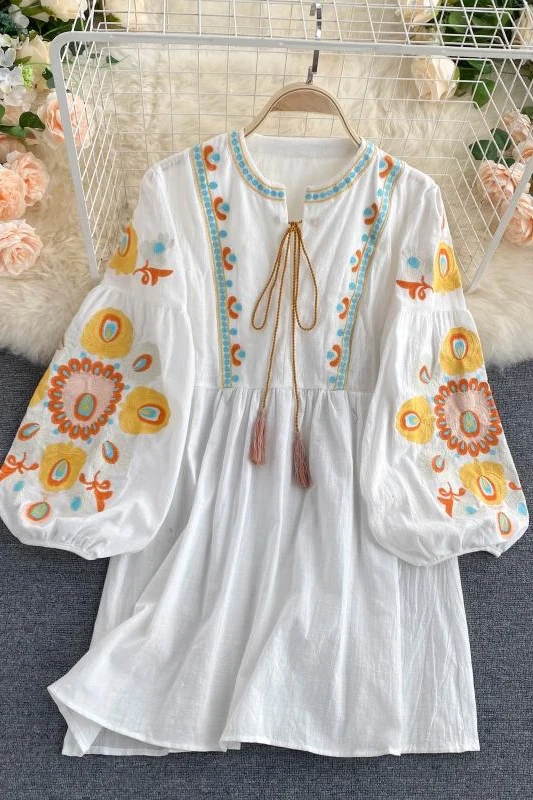 Fall Vintage O-Neck Casual Mini Dress For Women Puff Sleeve Empire Embroidery Shift Lace Dress
