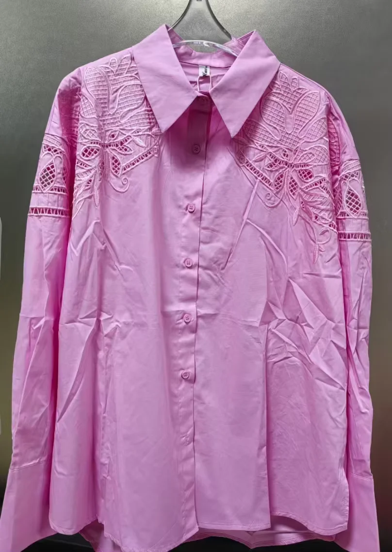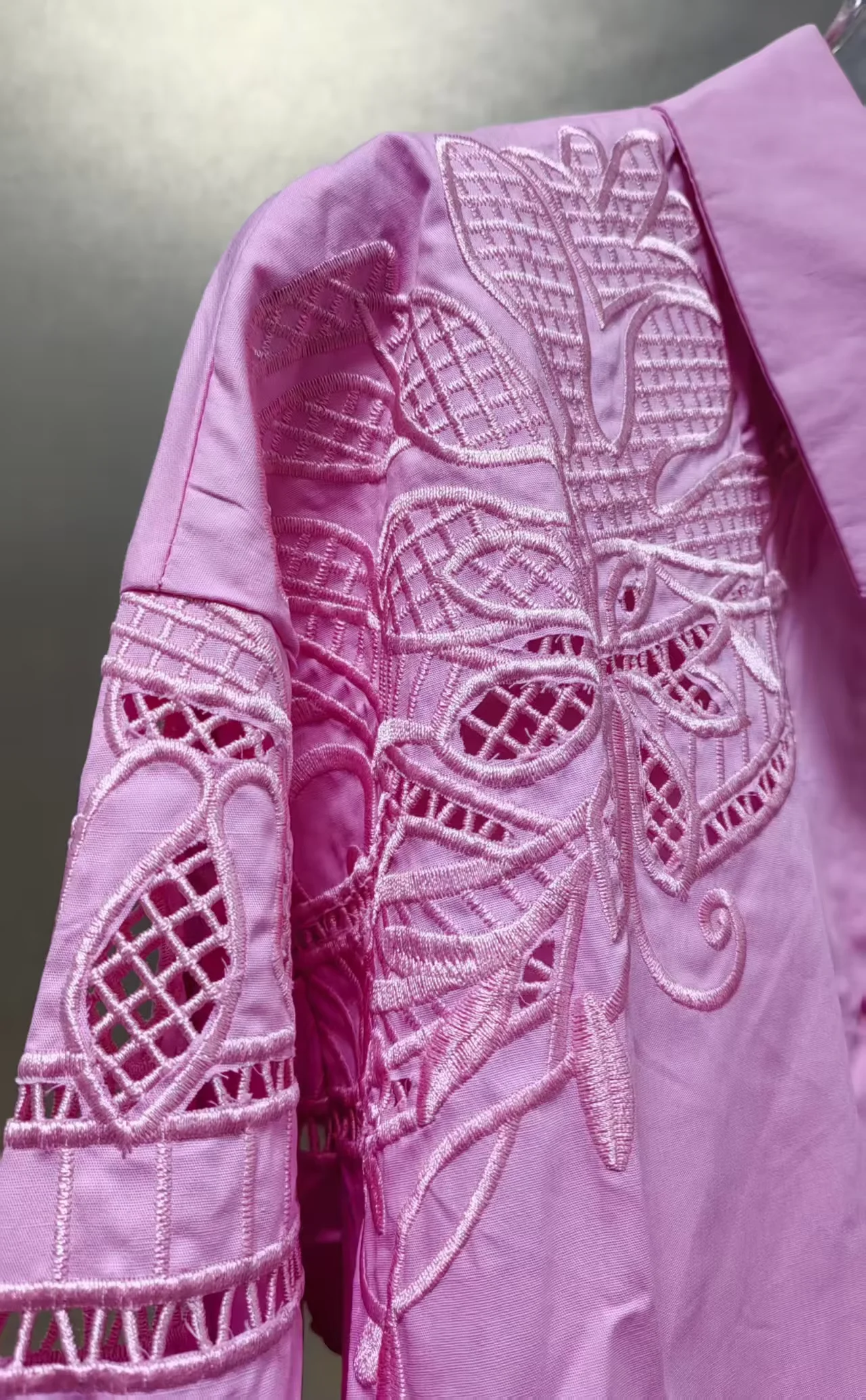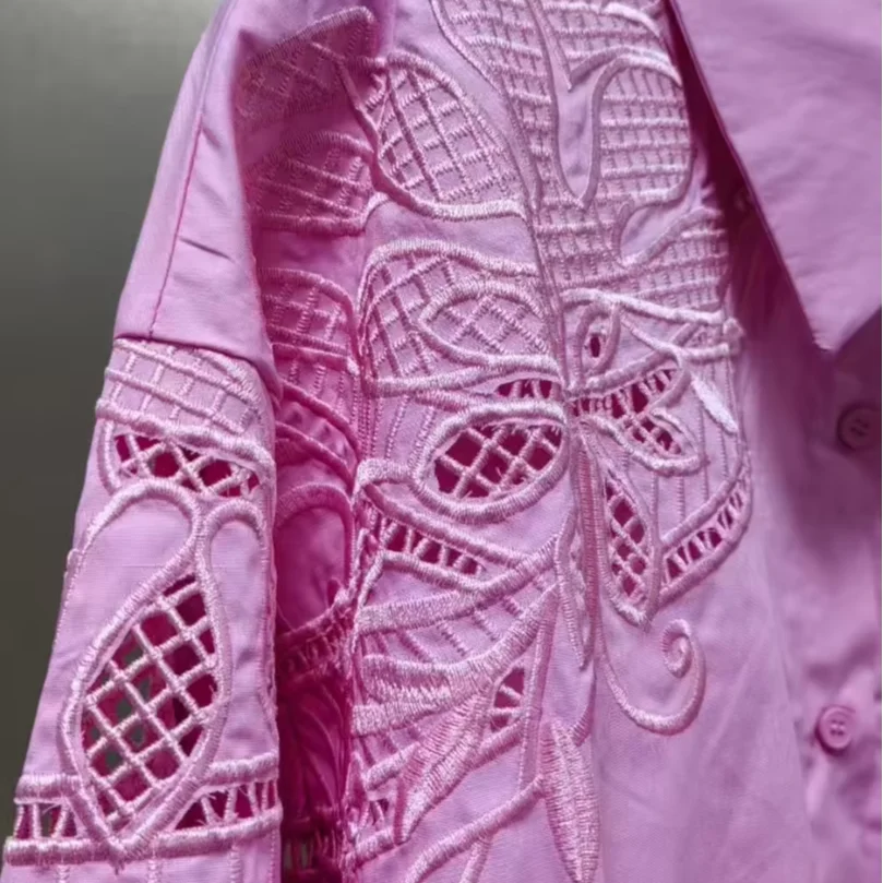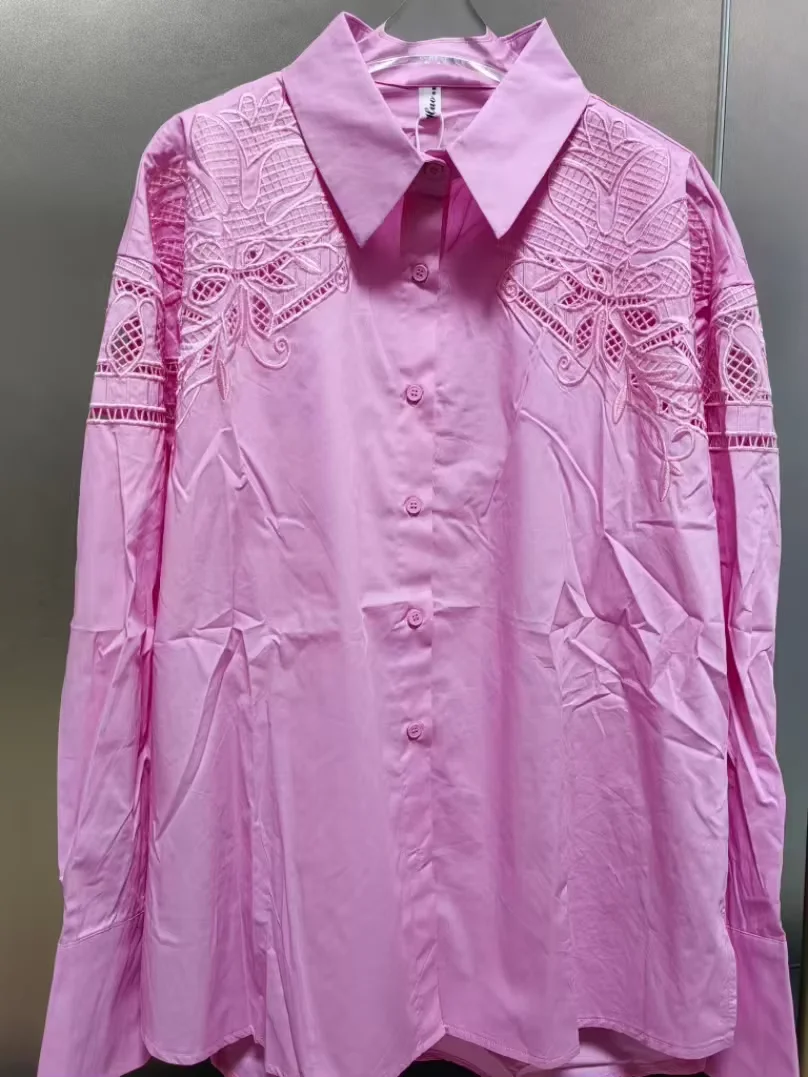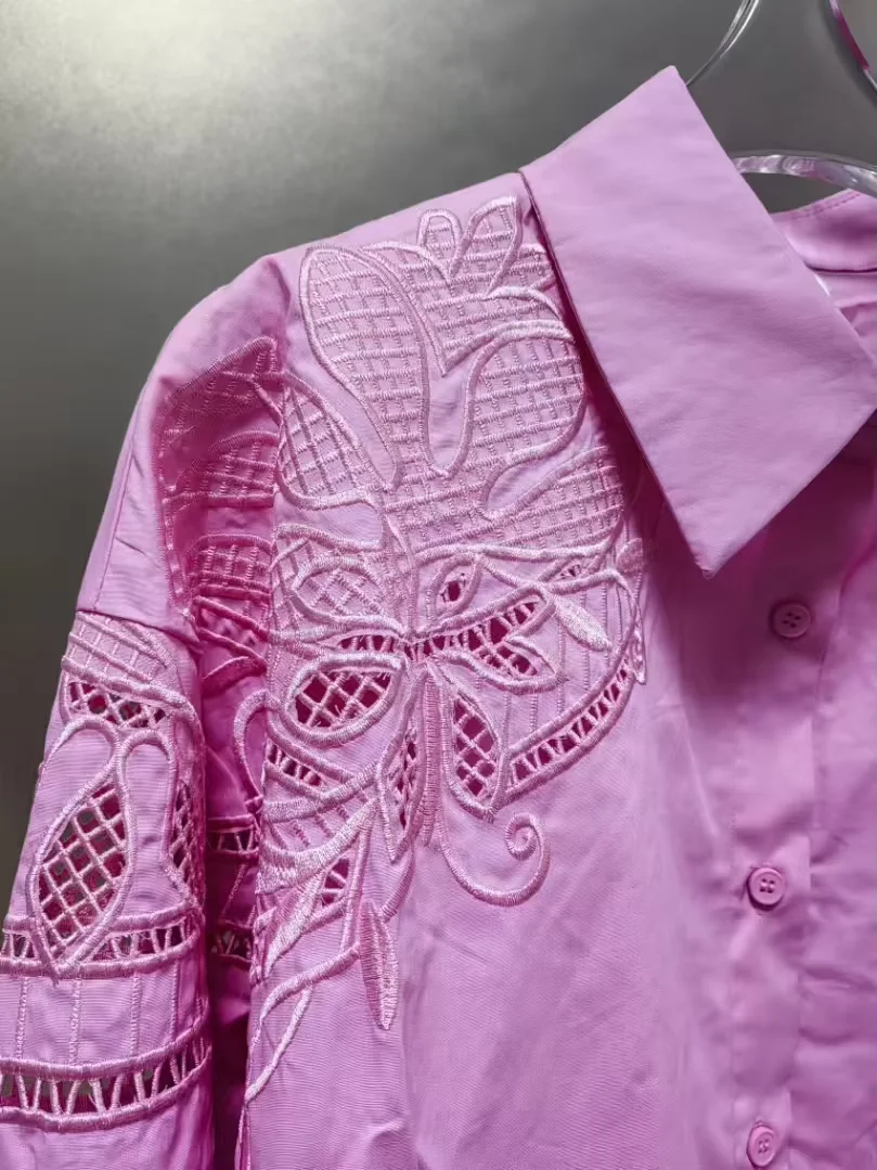 Flowers Hollow Out Embroidery Cotton Long Sleeve Pink Blouses Shirts Women for 2025 Autumn Trend Loose Casual Tops Woman Clothes