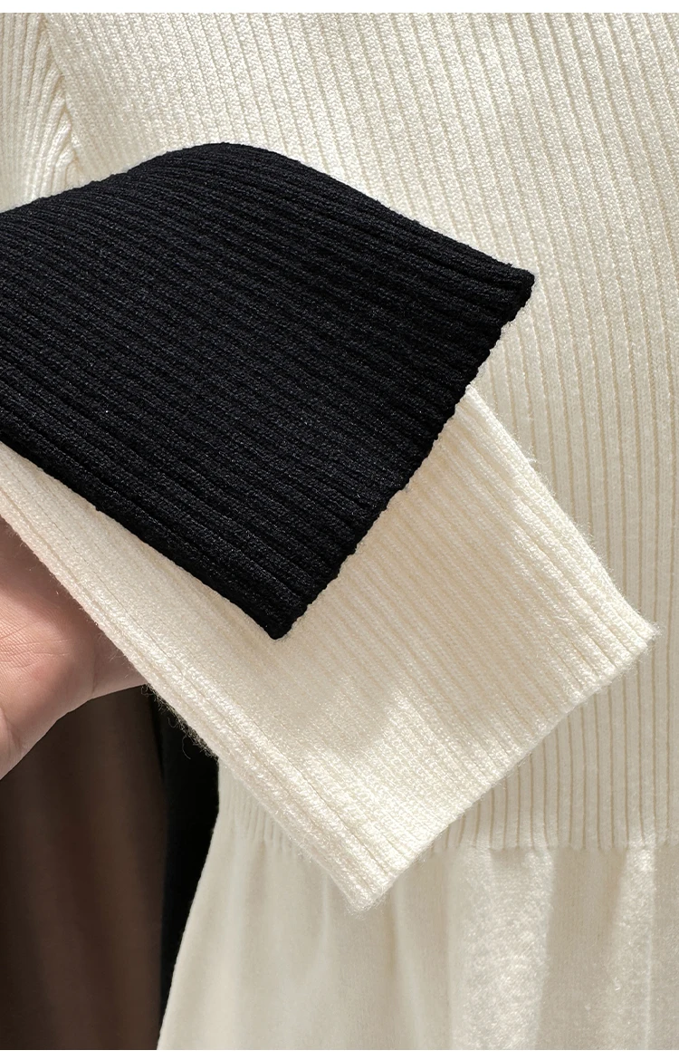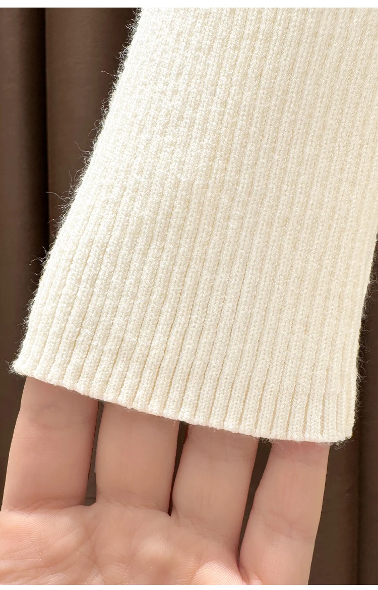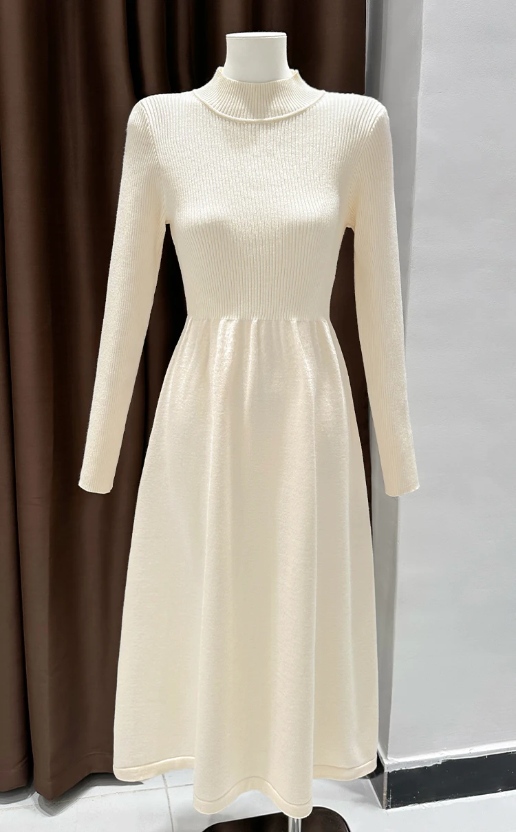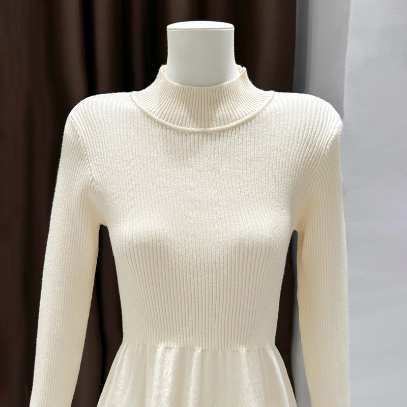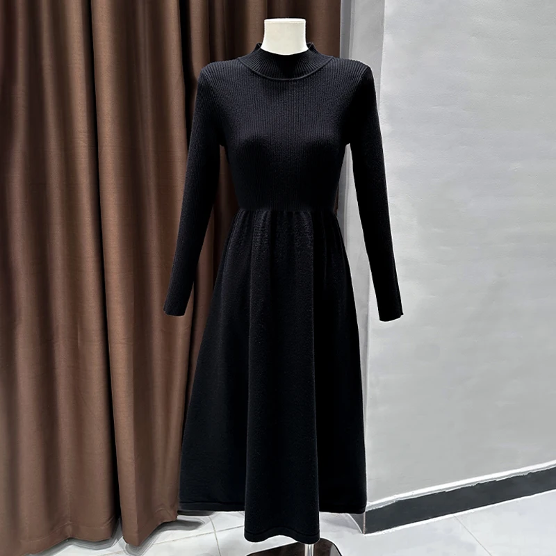 French-style A-Line Simple Knitted Sweater Dress Women’s Autumn Winter Half-high Collar Floor-Length Polyester/Cotton