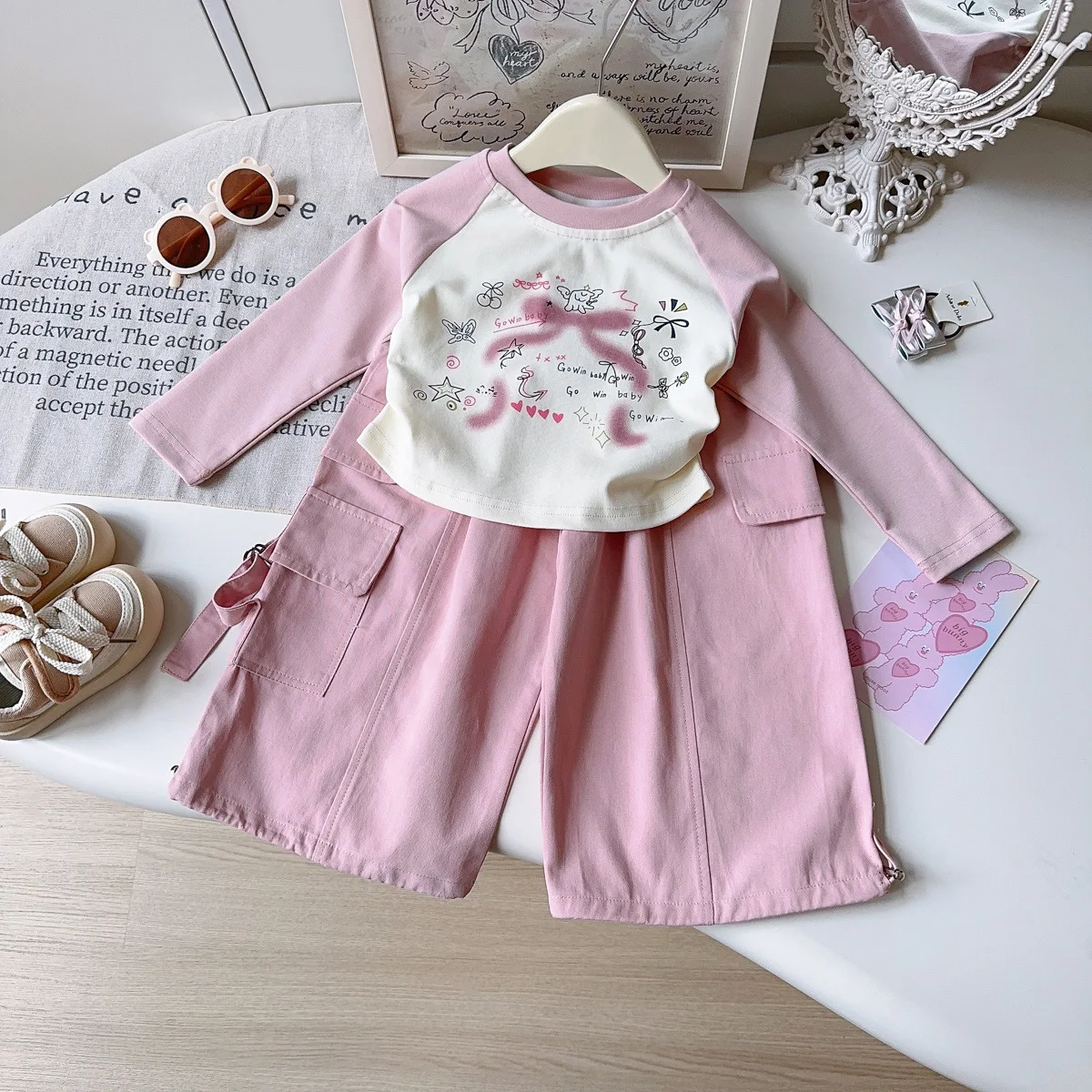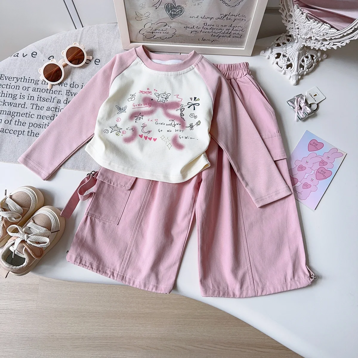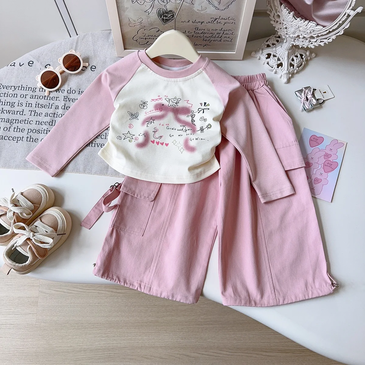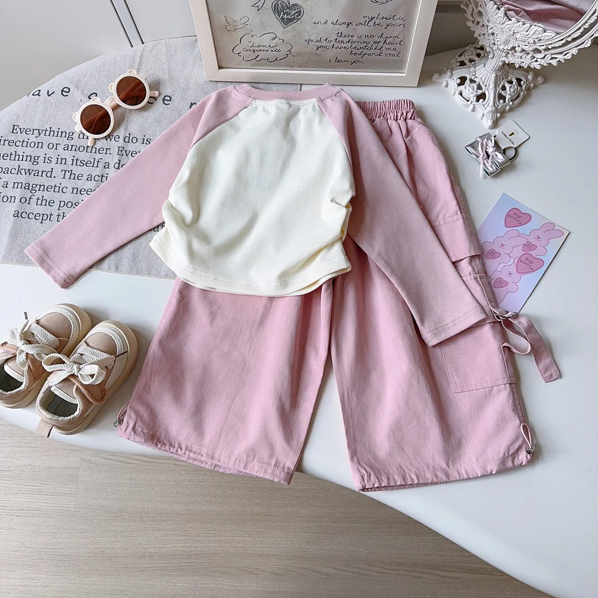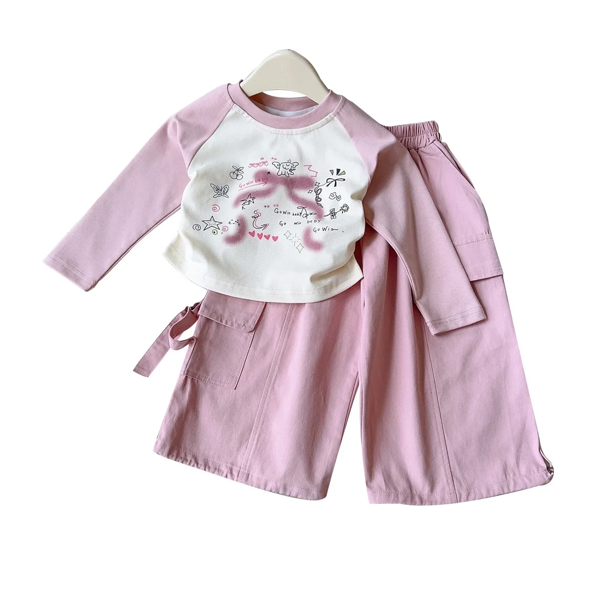 Girls’ Casual Korean-Style Suit Spring/ Autumn New Long-Sleeved Top and Wide-Leg Pants Set Solid Pattern Worested Fabric