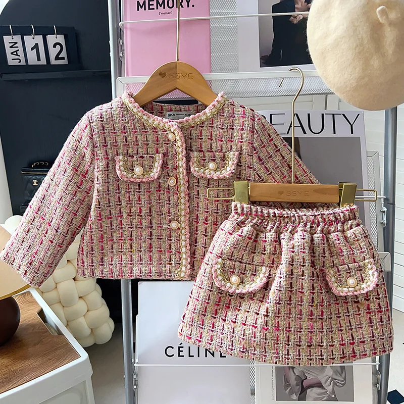 Girls New Autumn and Winter Small Fragrant Style Sub Set with Cotton Padded Coat Solid Color Skirt Sweater