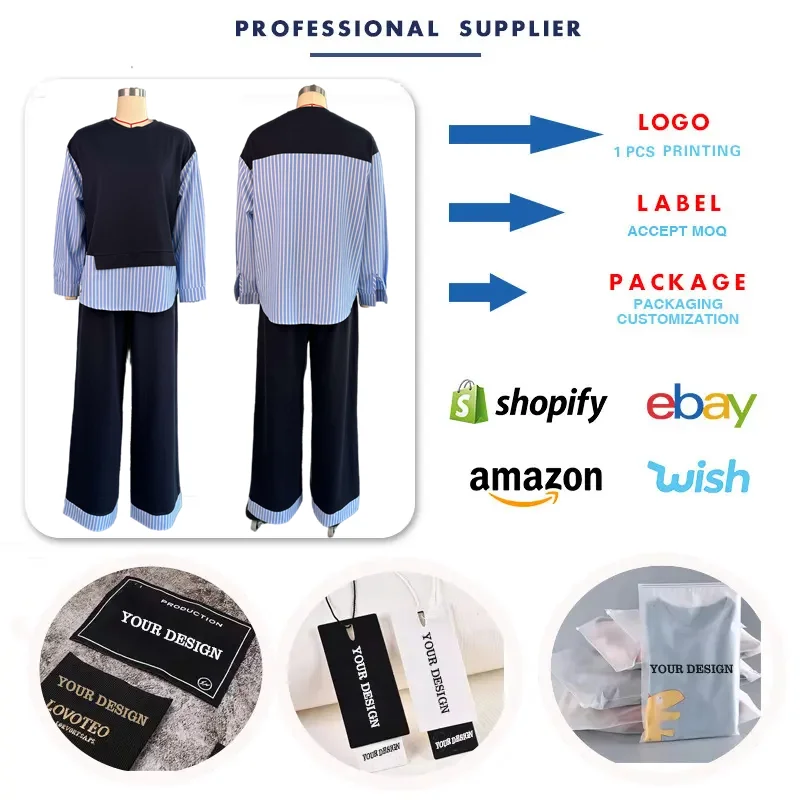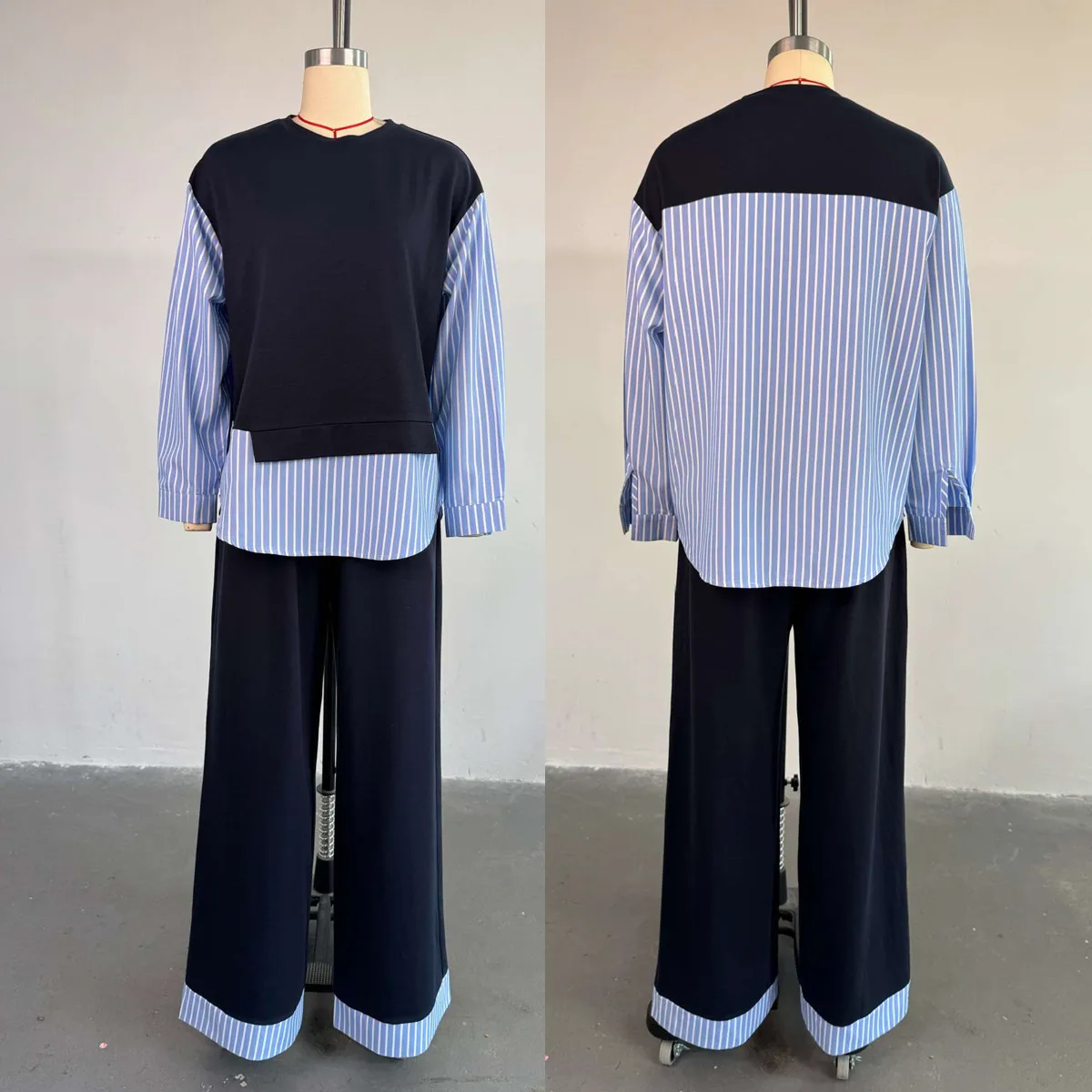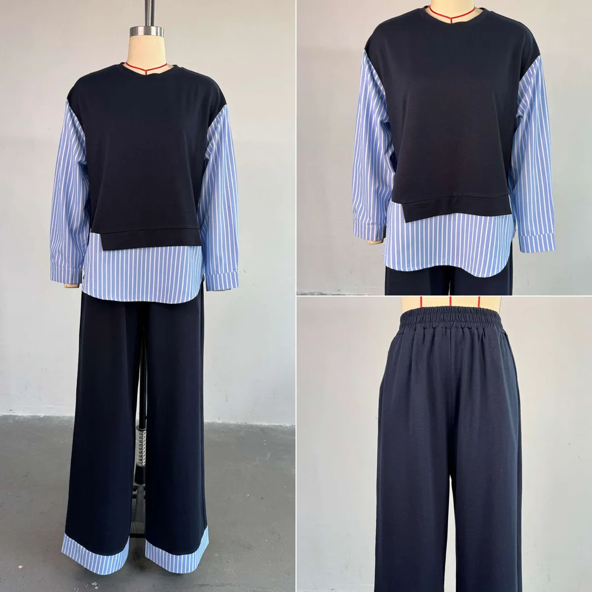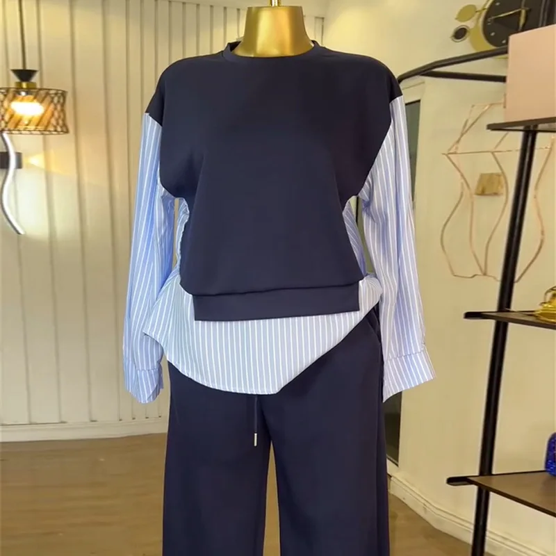HK72425 Trendy Fall Outfits for Women O-Neck Splicing Striped Top and High Waist Pants Set Casual Two Piece Set Women Clothing