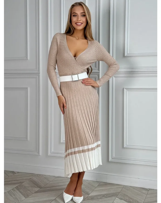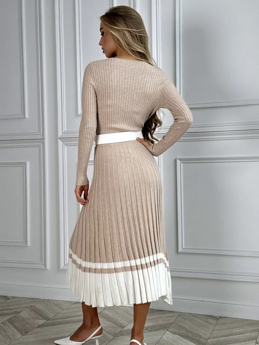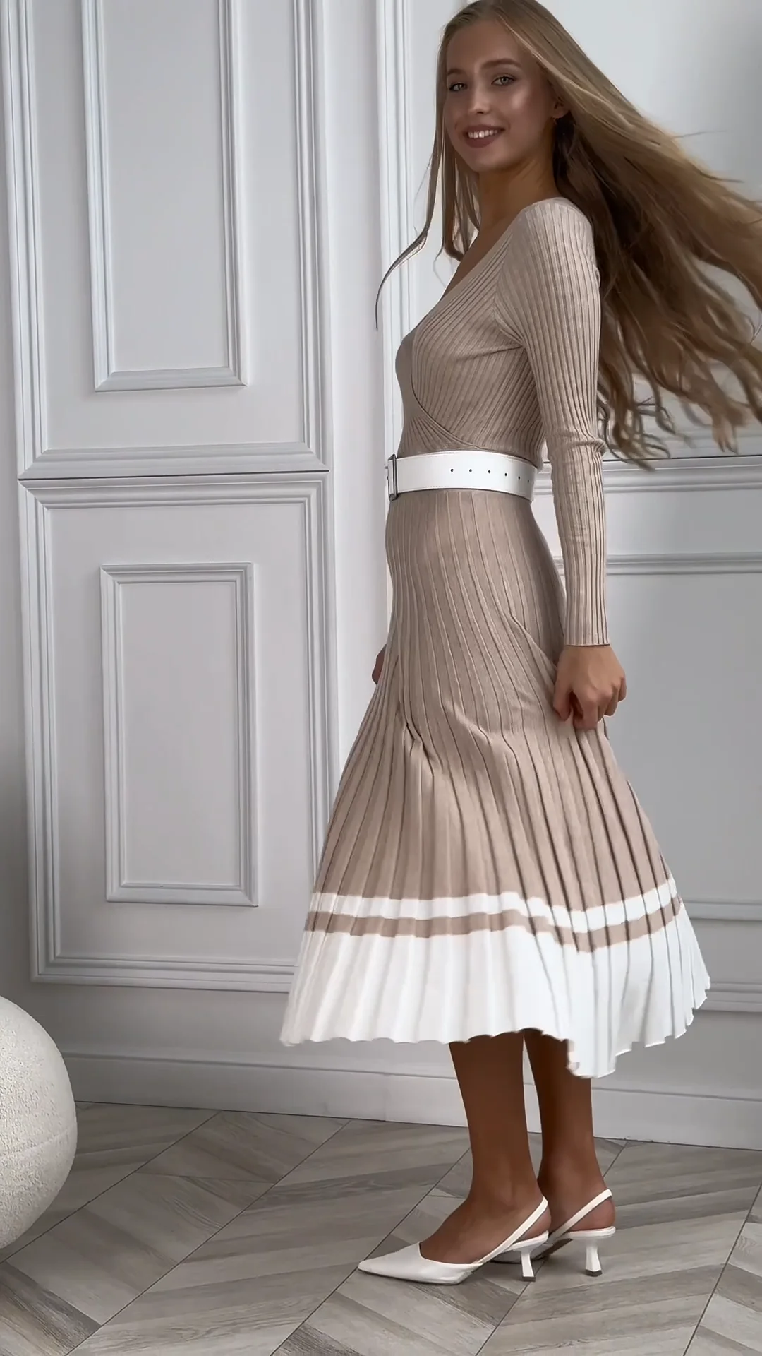 Hot Sale Women’s Knitted Deep V Neck Long Sleeve Color Block Pleated Midi Dress Elegant Slim Fit Work & Party Dress