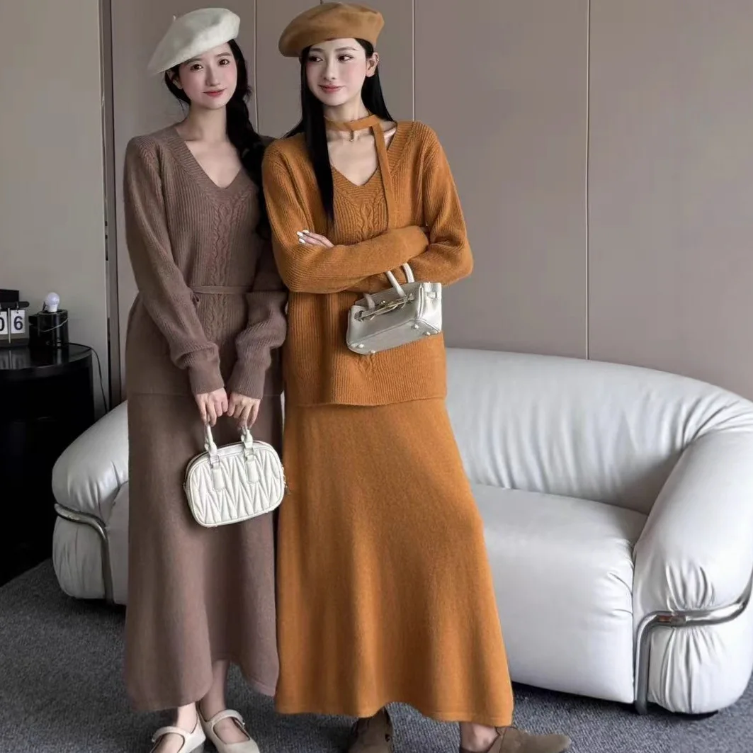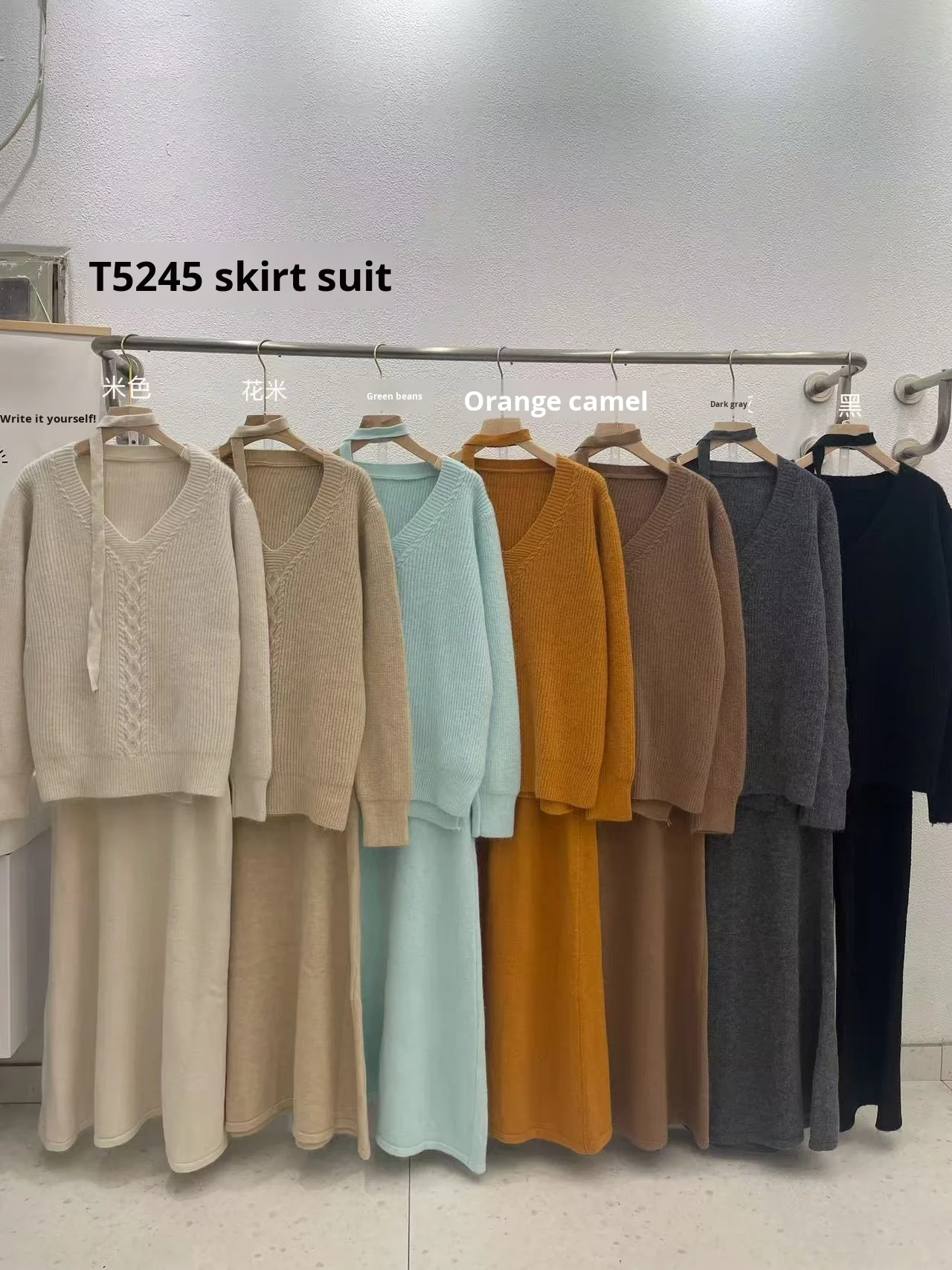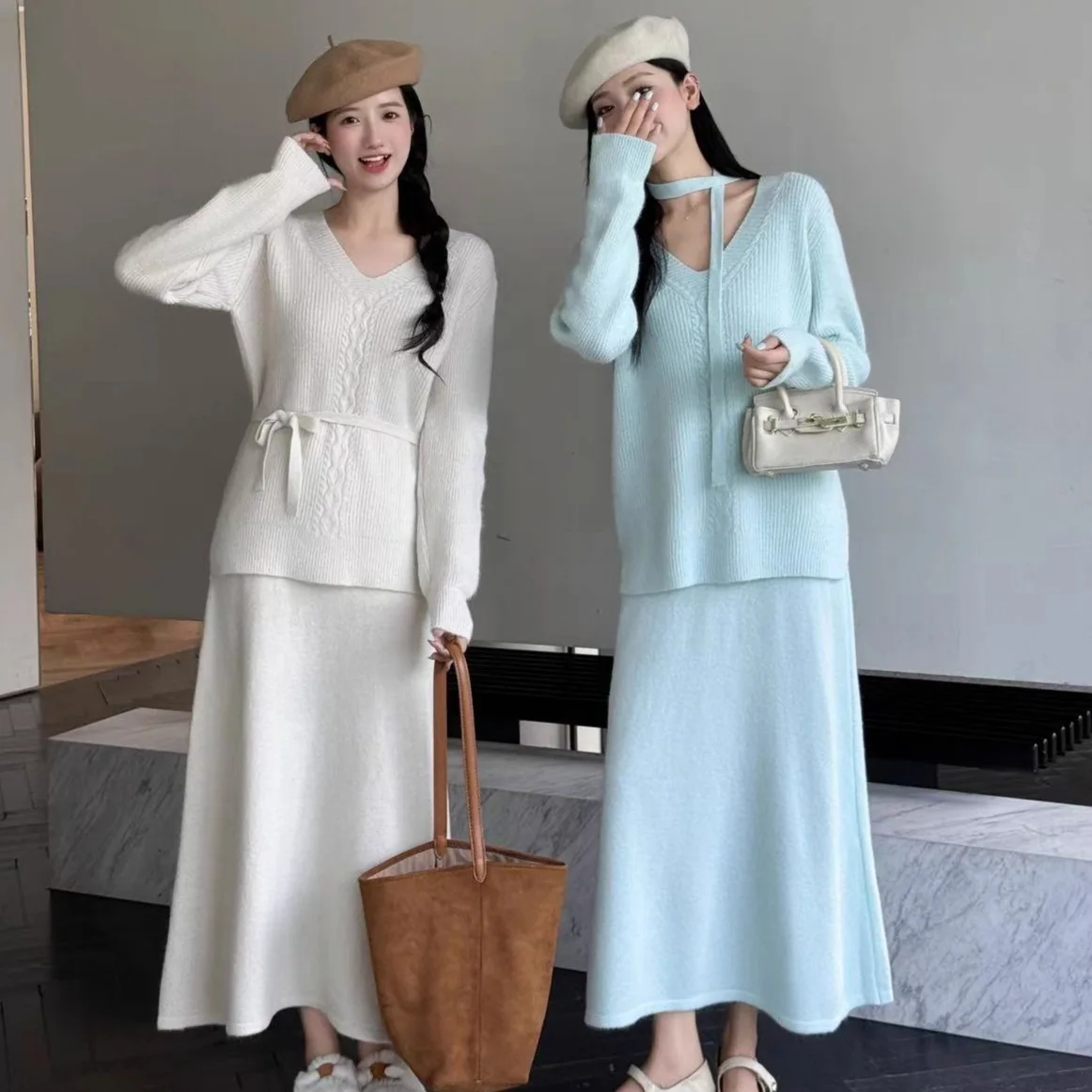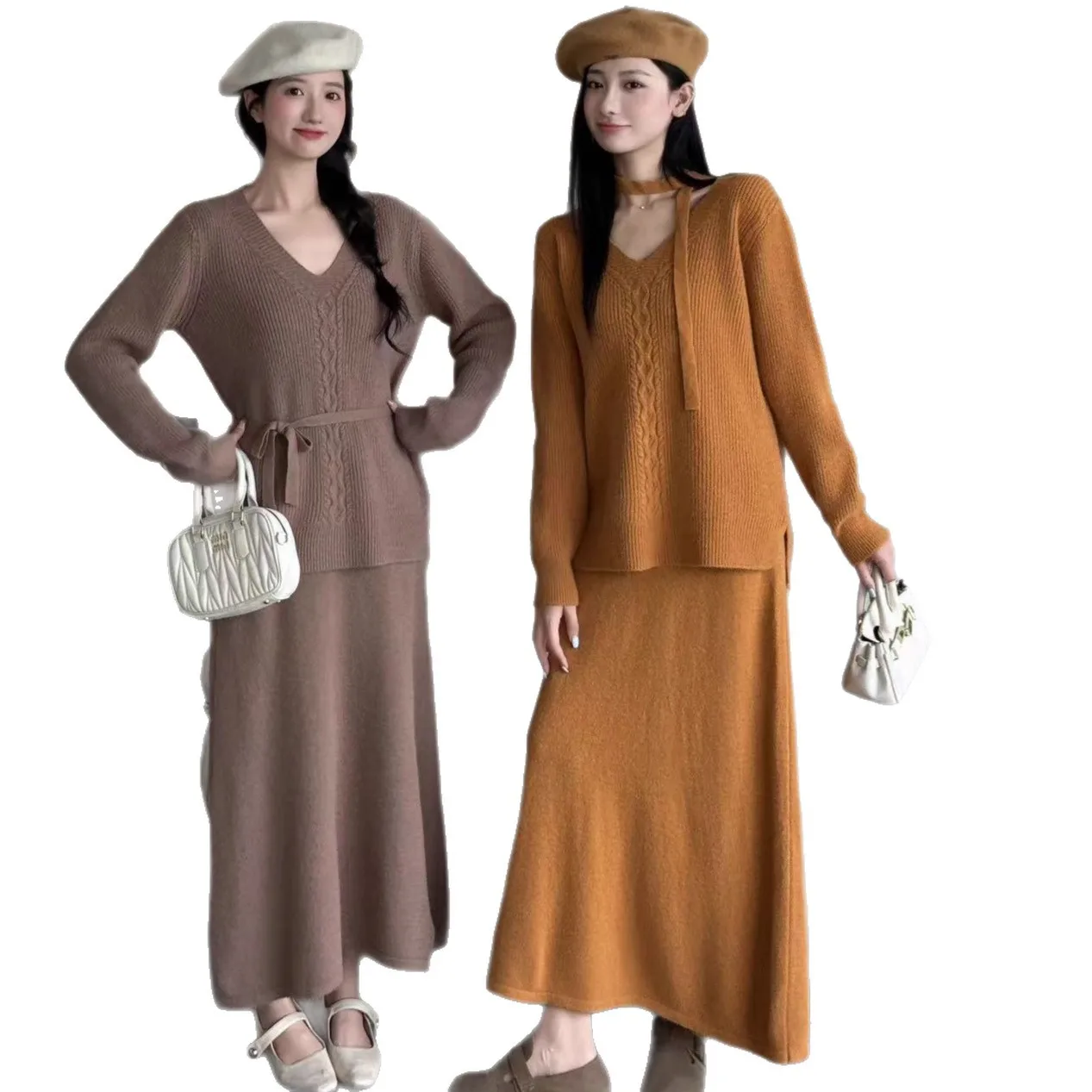 JAC22 WT0199 Relaxed Fit Slimming Casual Solid Sweater Set Women Autumn Winter Loose Ribbon Knitted Top Skirt Set