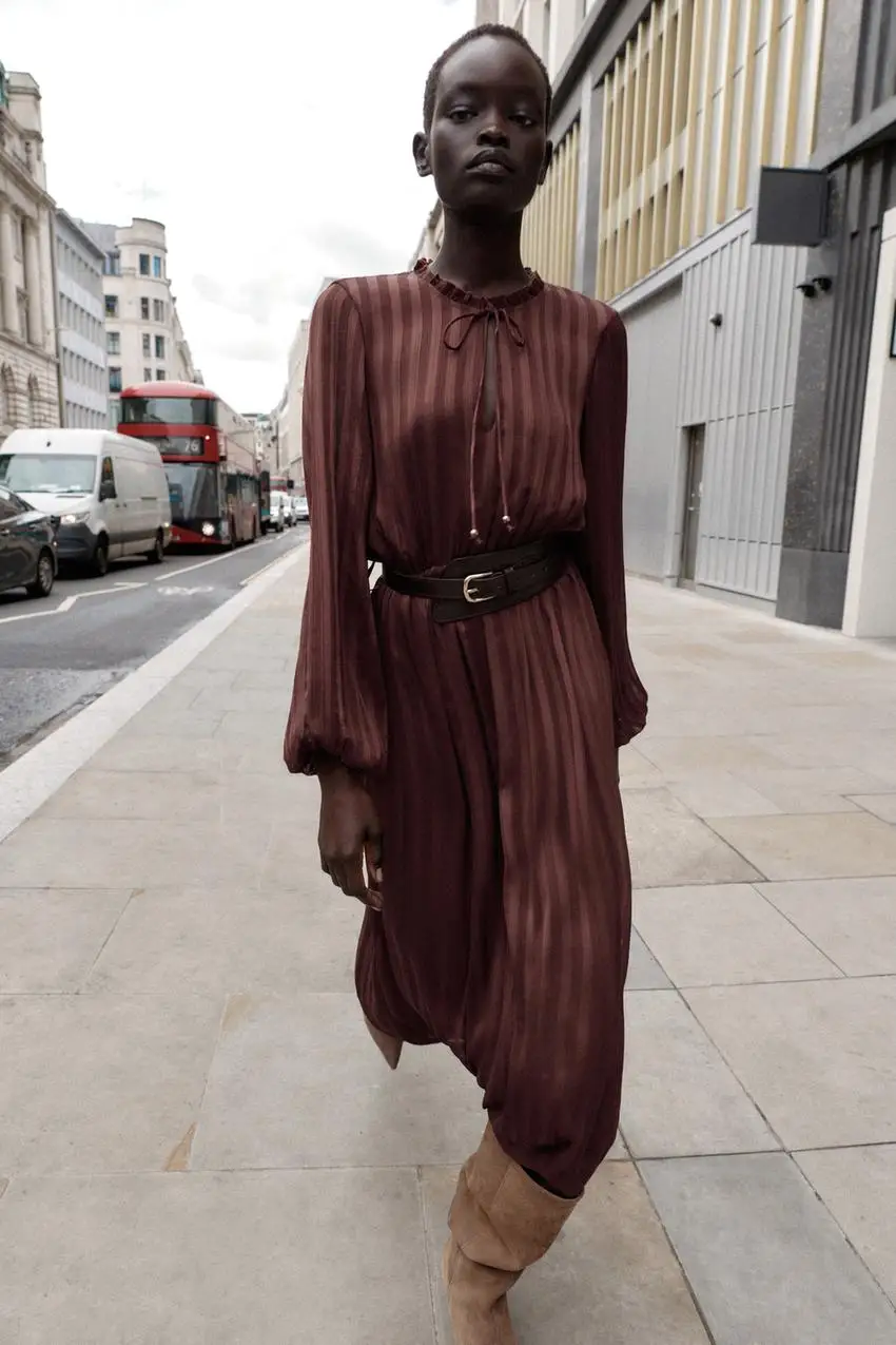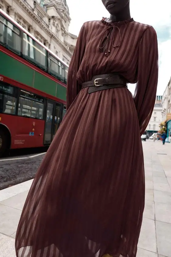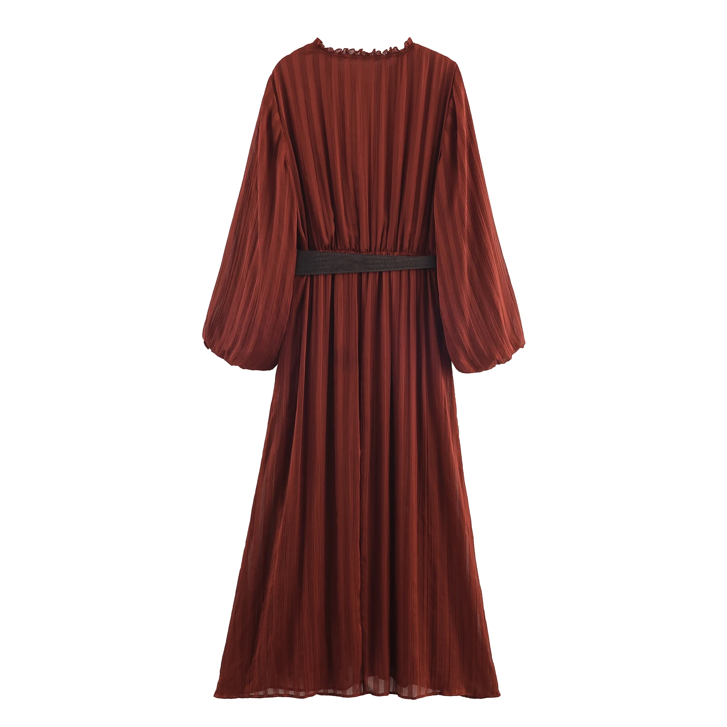 KP&ZA Women’s Long-Sleeved Pleated Ruffles New Style Autumn Casual Long Maxi Dress Natural Waistline Digital Solid Nonwoven